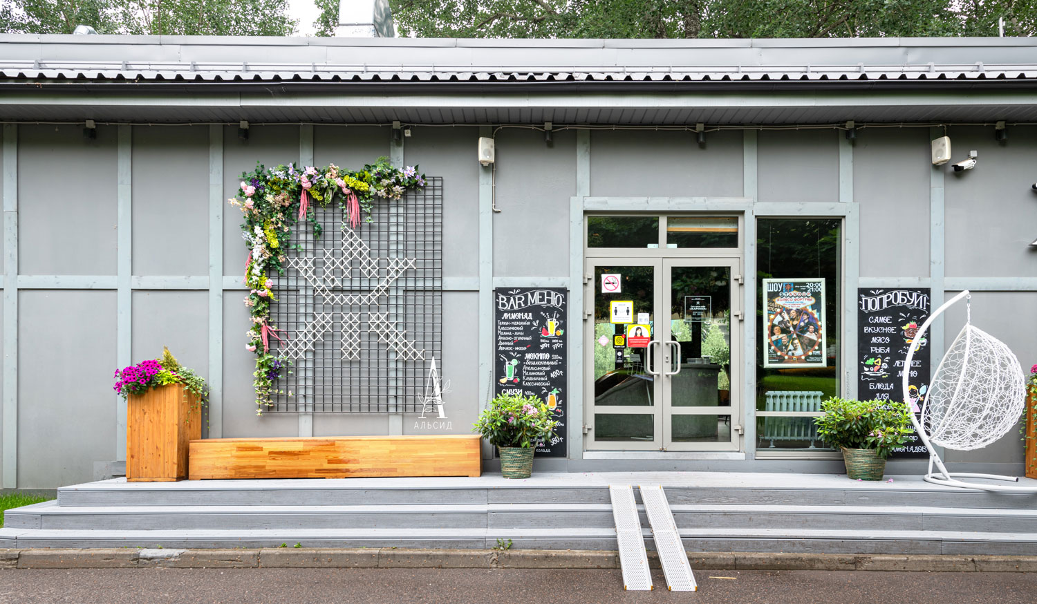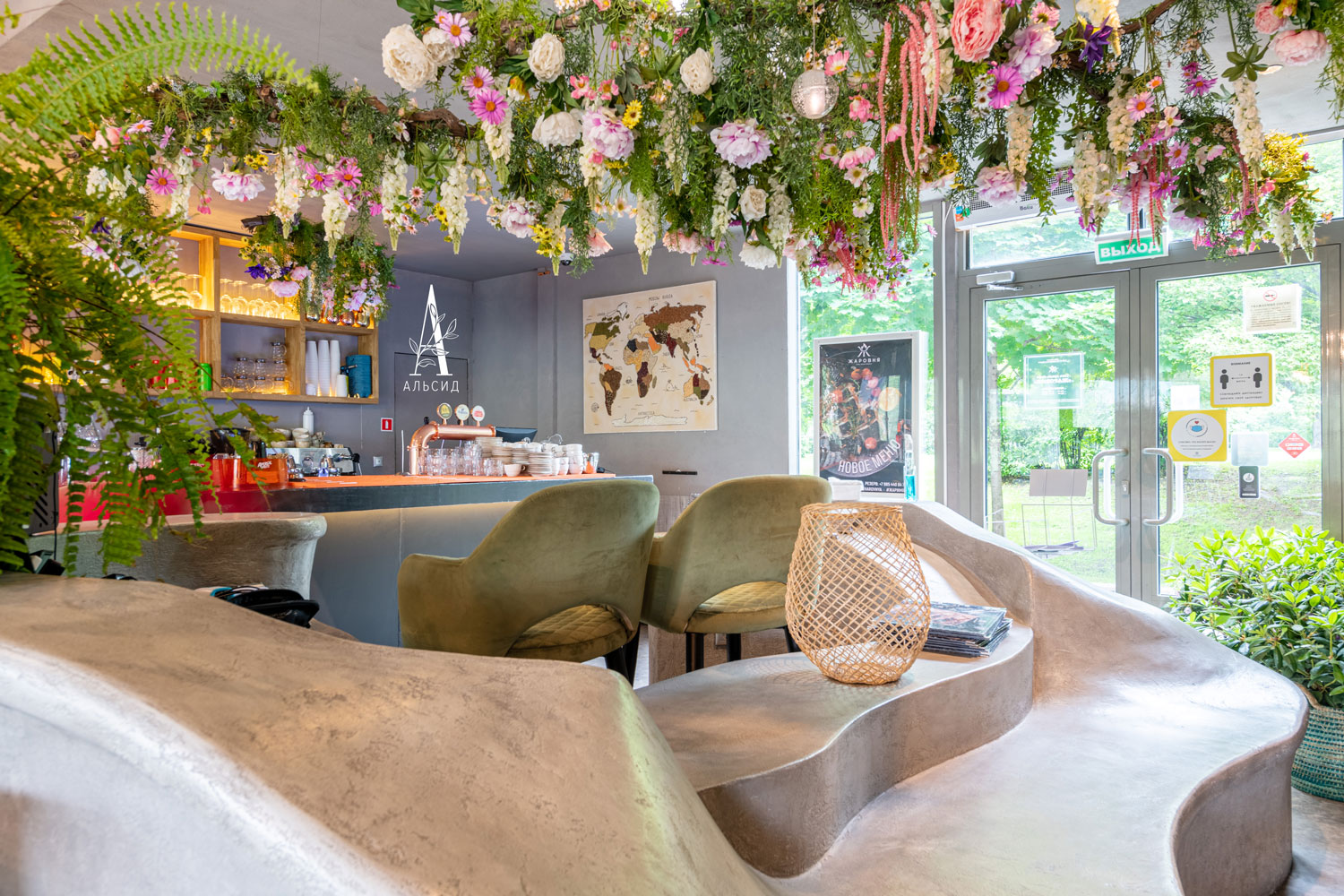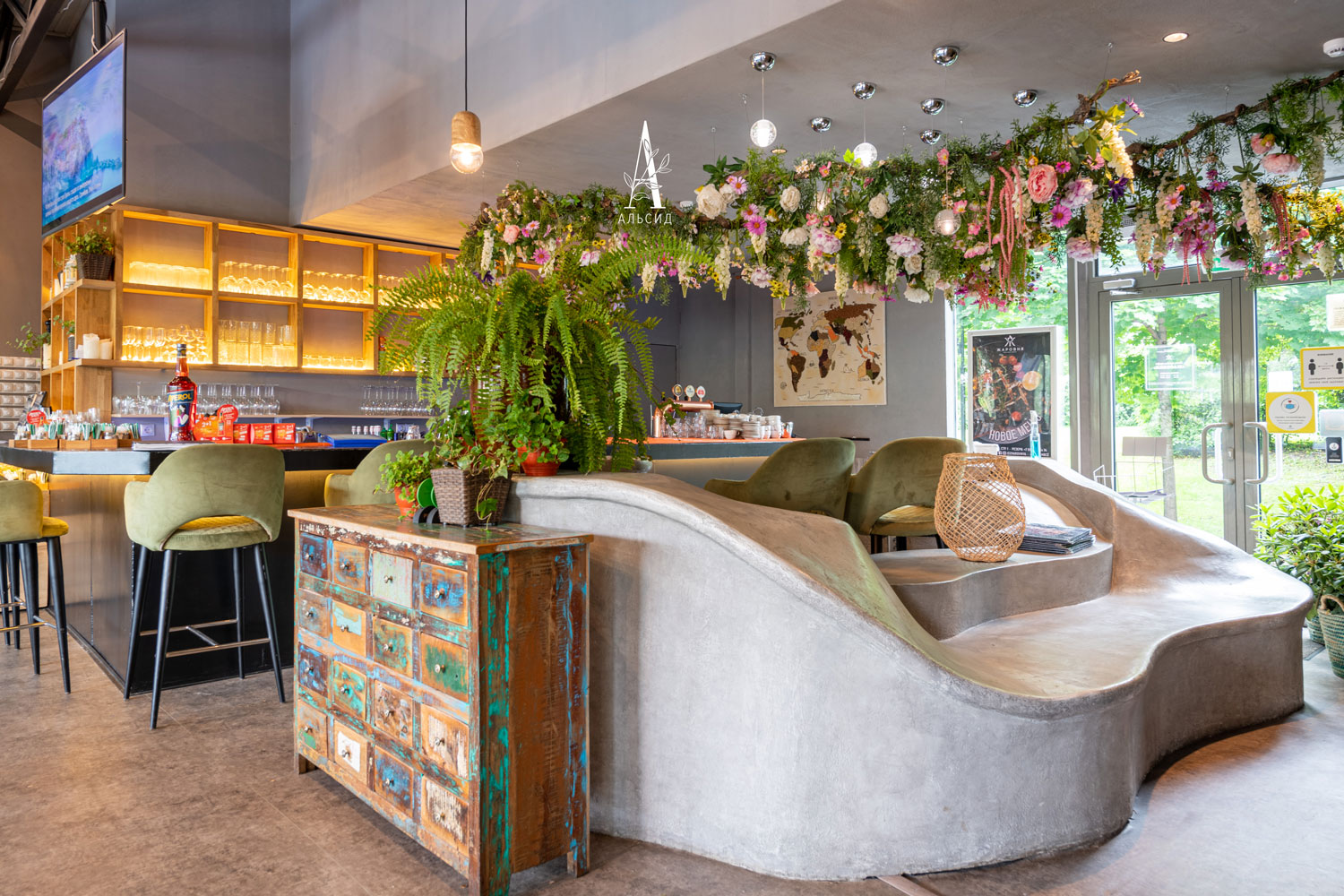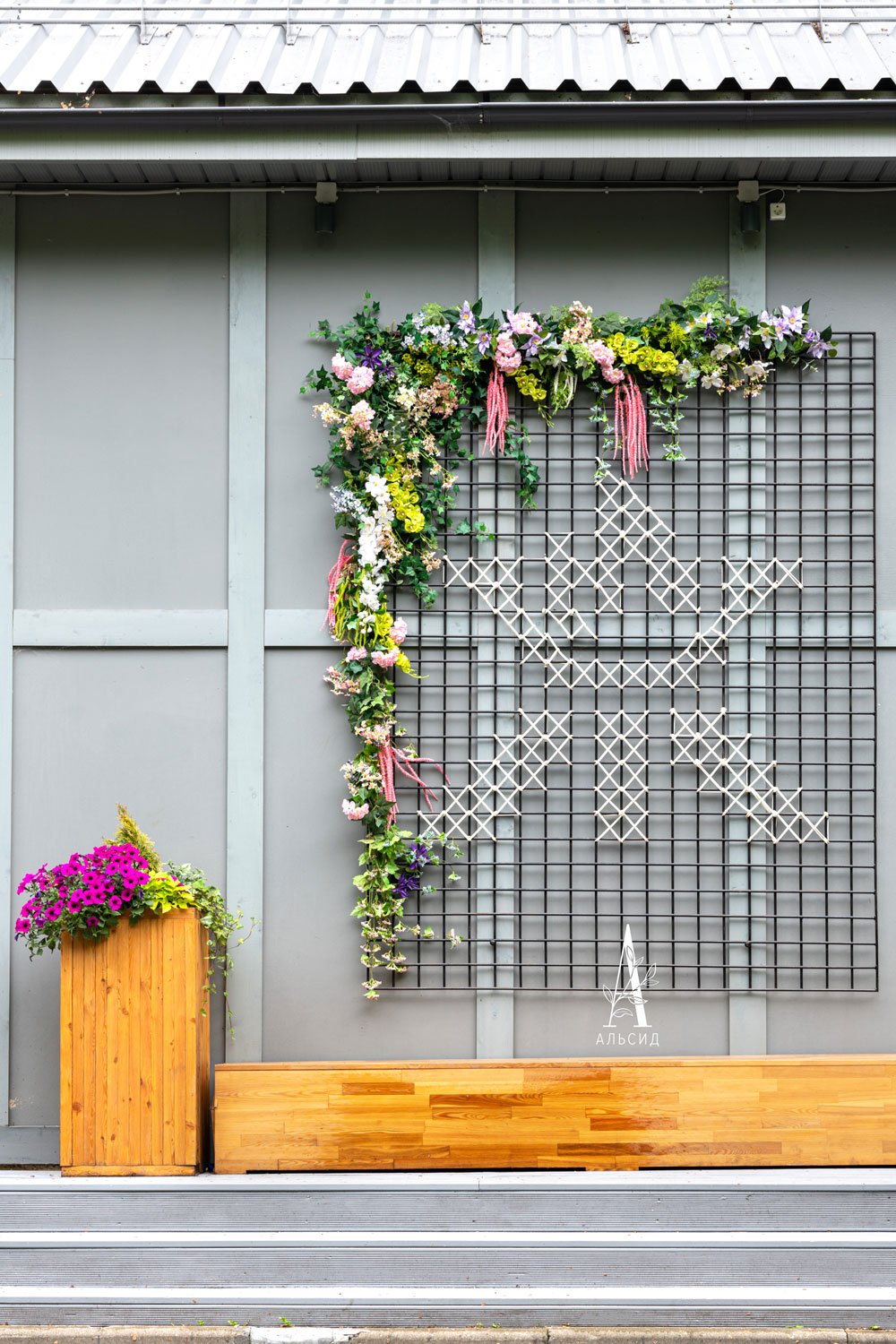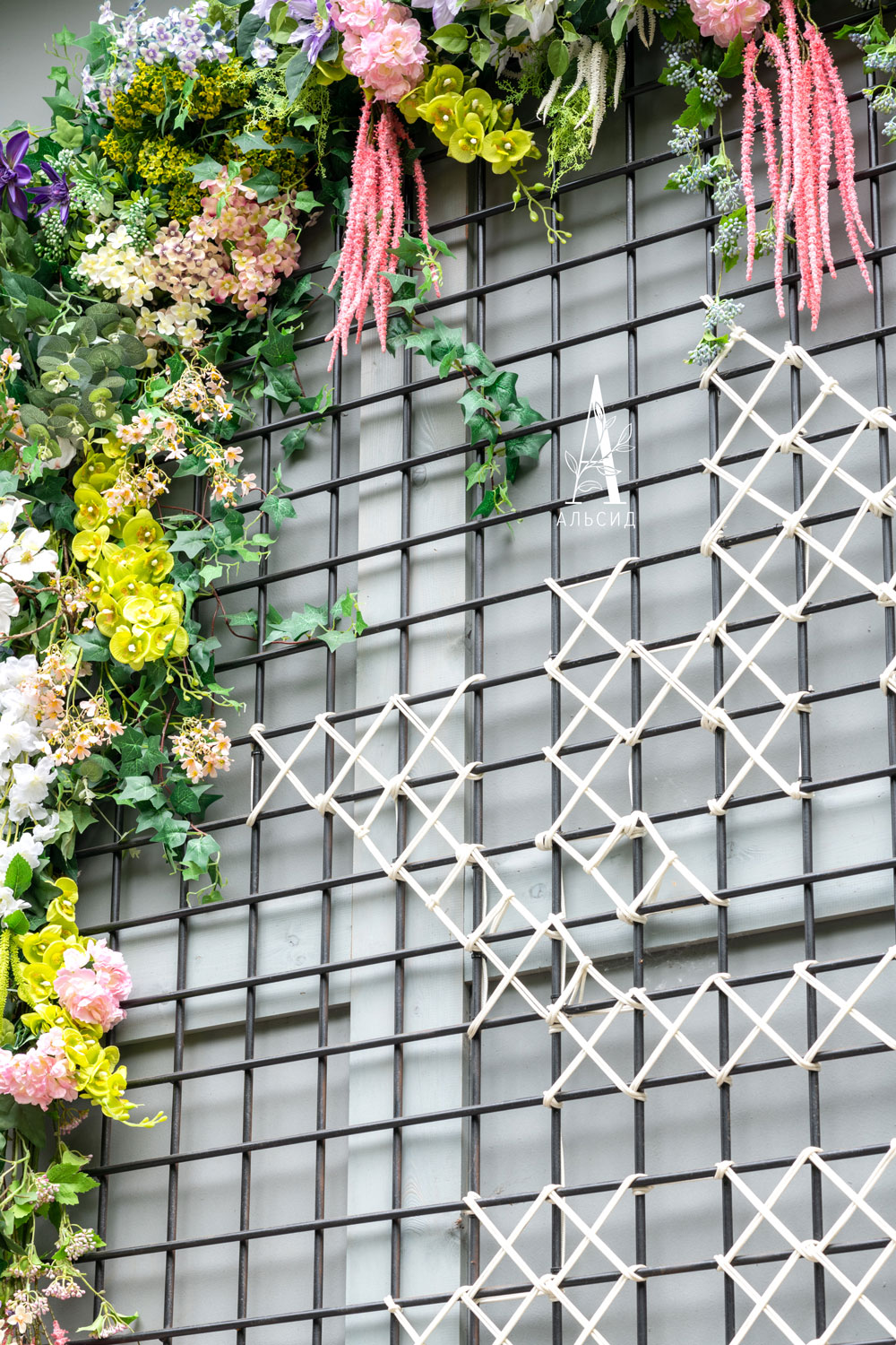 Летний образ логотипа ресторана, сделаный из искусственных растений, идеально сочетается с живыми цветами в клумбах у входа в заведение. Ресепшен также украшен обилием красочных лиан из цветочных композиций, подвешенные к потолку на натуральные коряги. Такой прием подходит не только для высоких потолков, но и для низких, так как можно регулировать длину ампельных растений под нужный размер.;