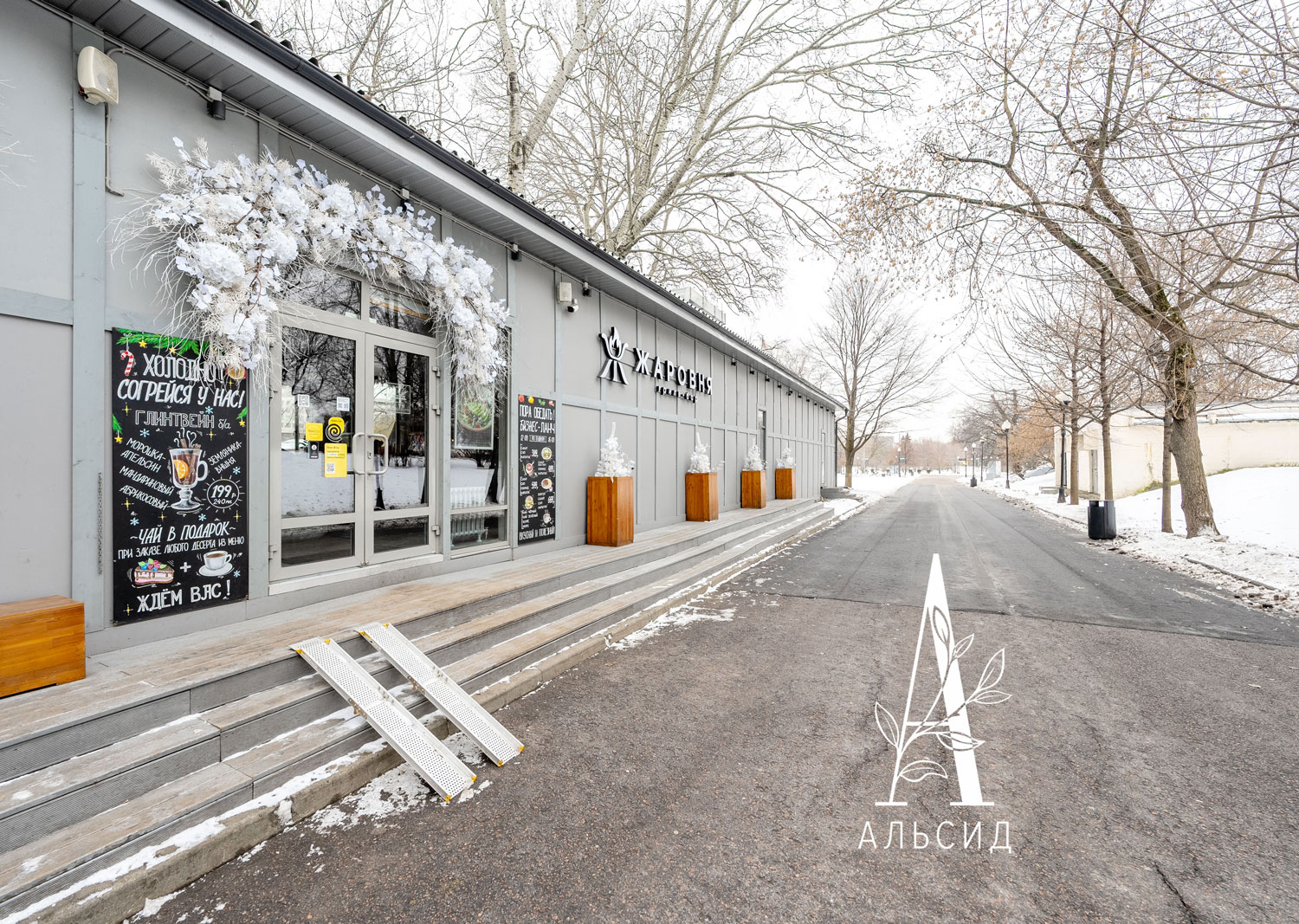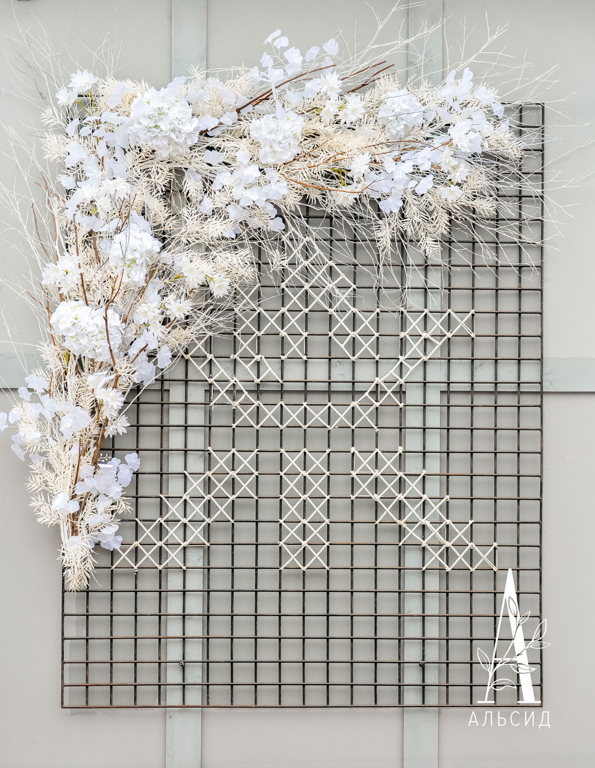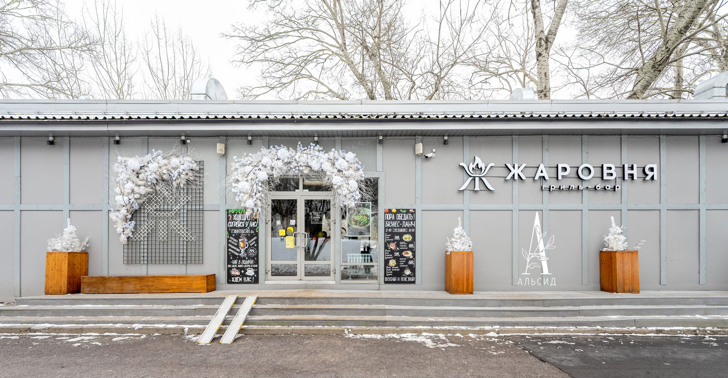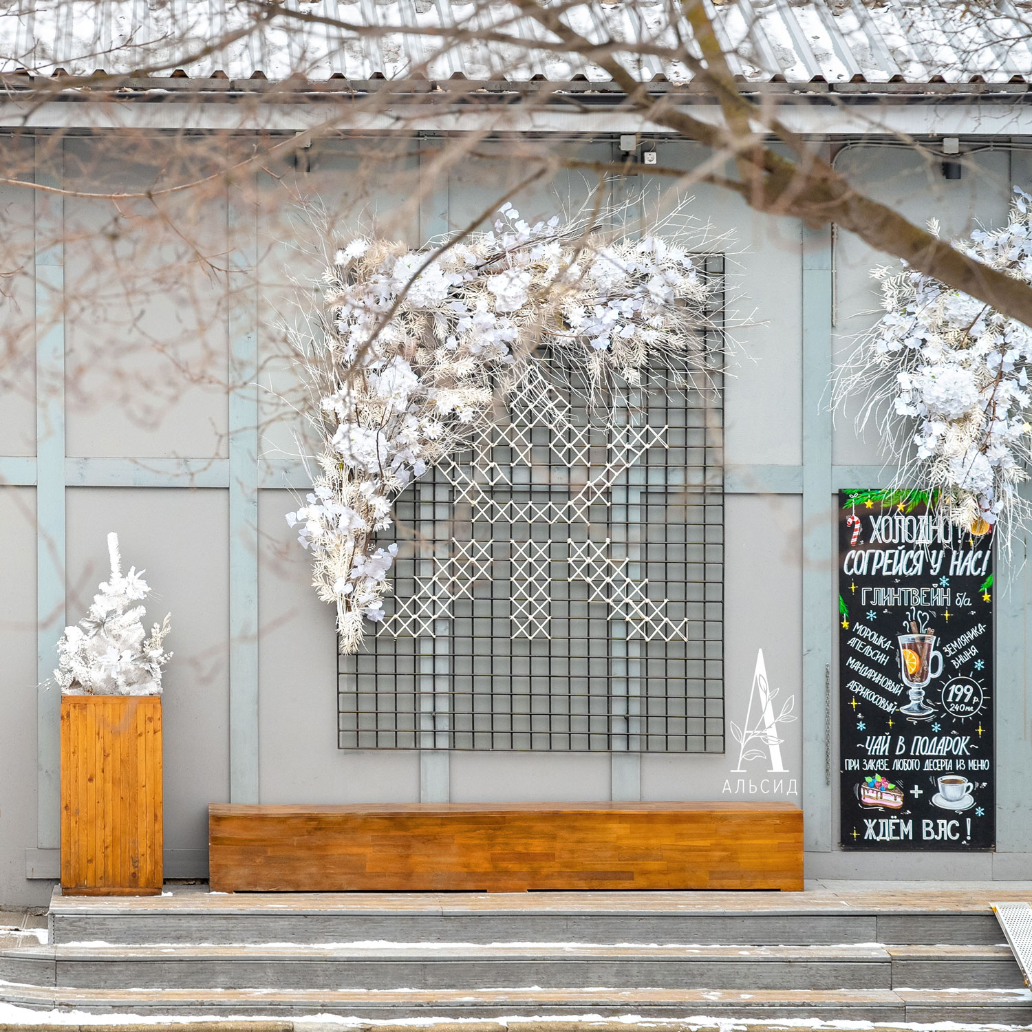 Зимнее оформление ресторана Жаровня выполнено в виде белых цветочных арок из