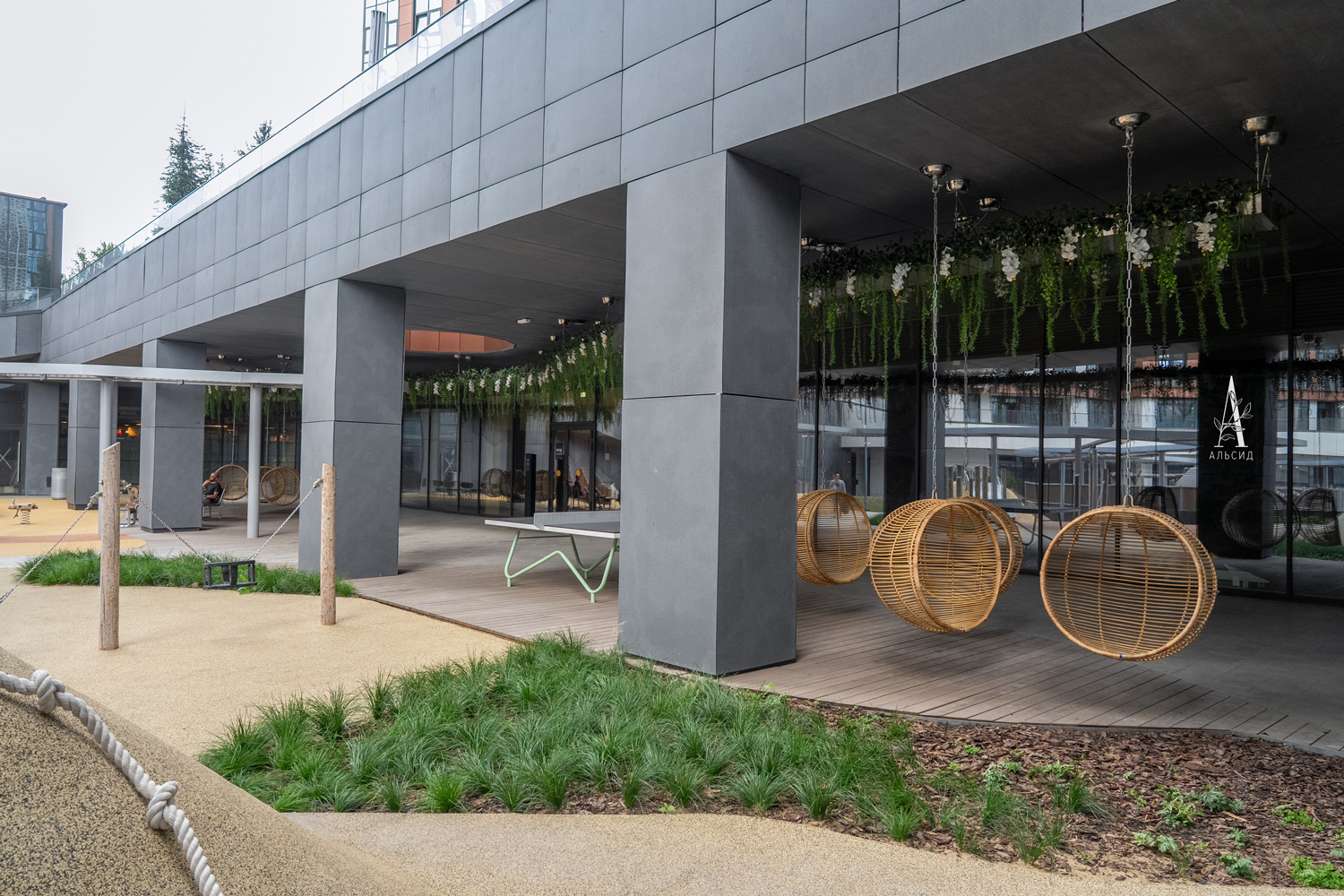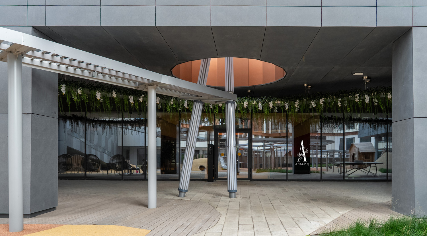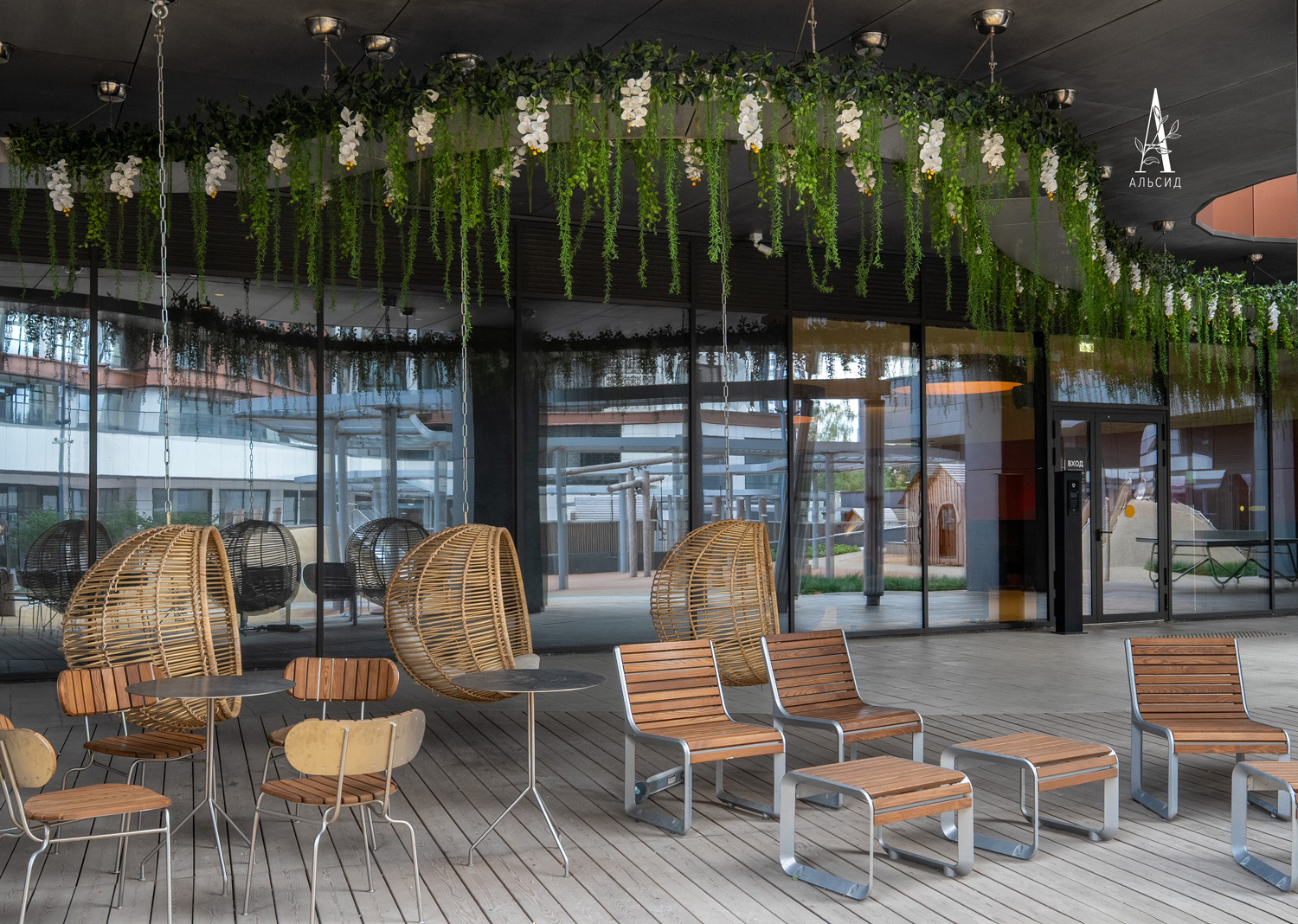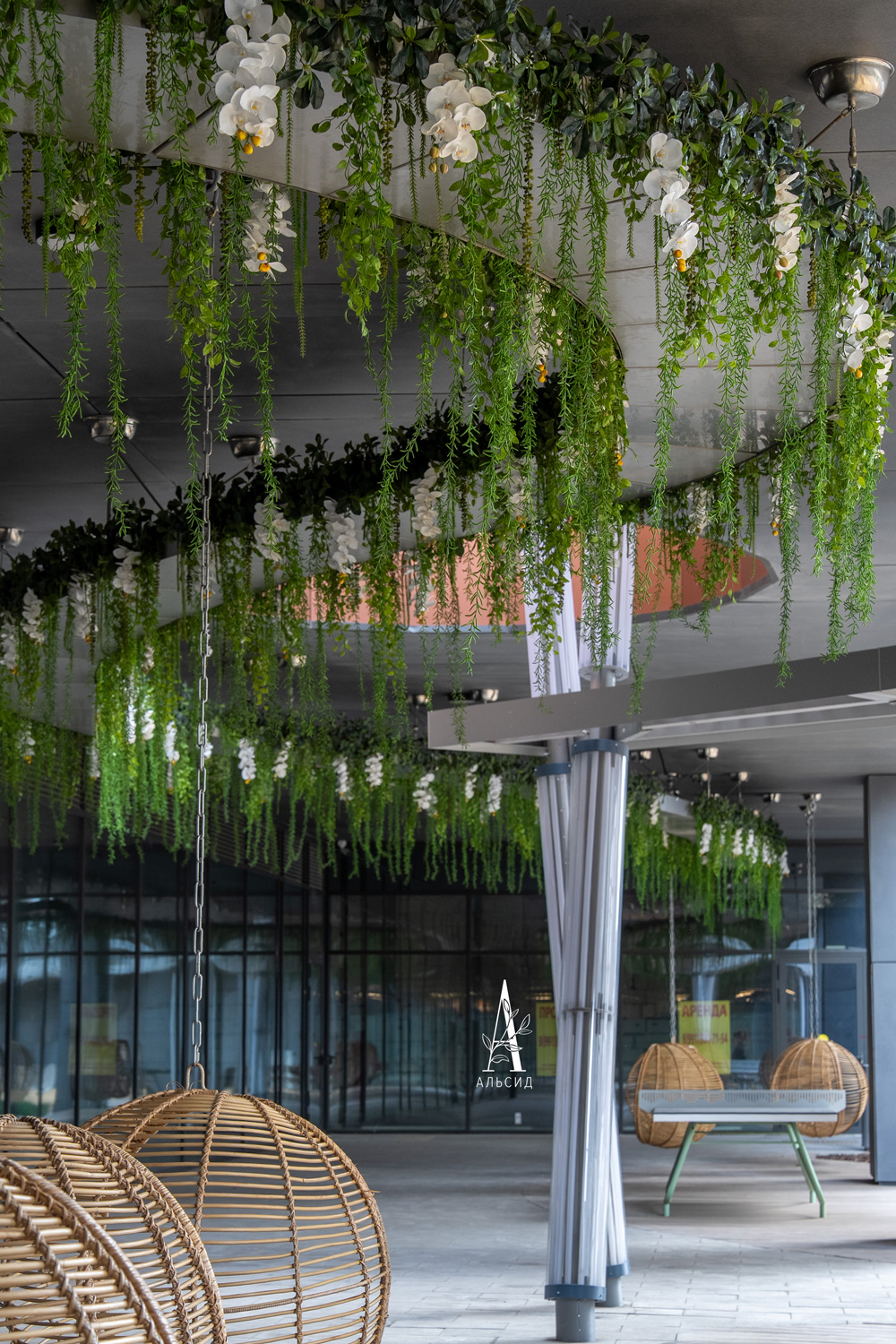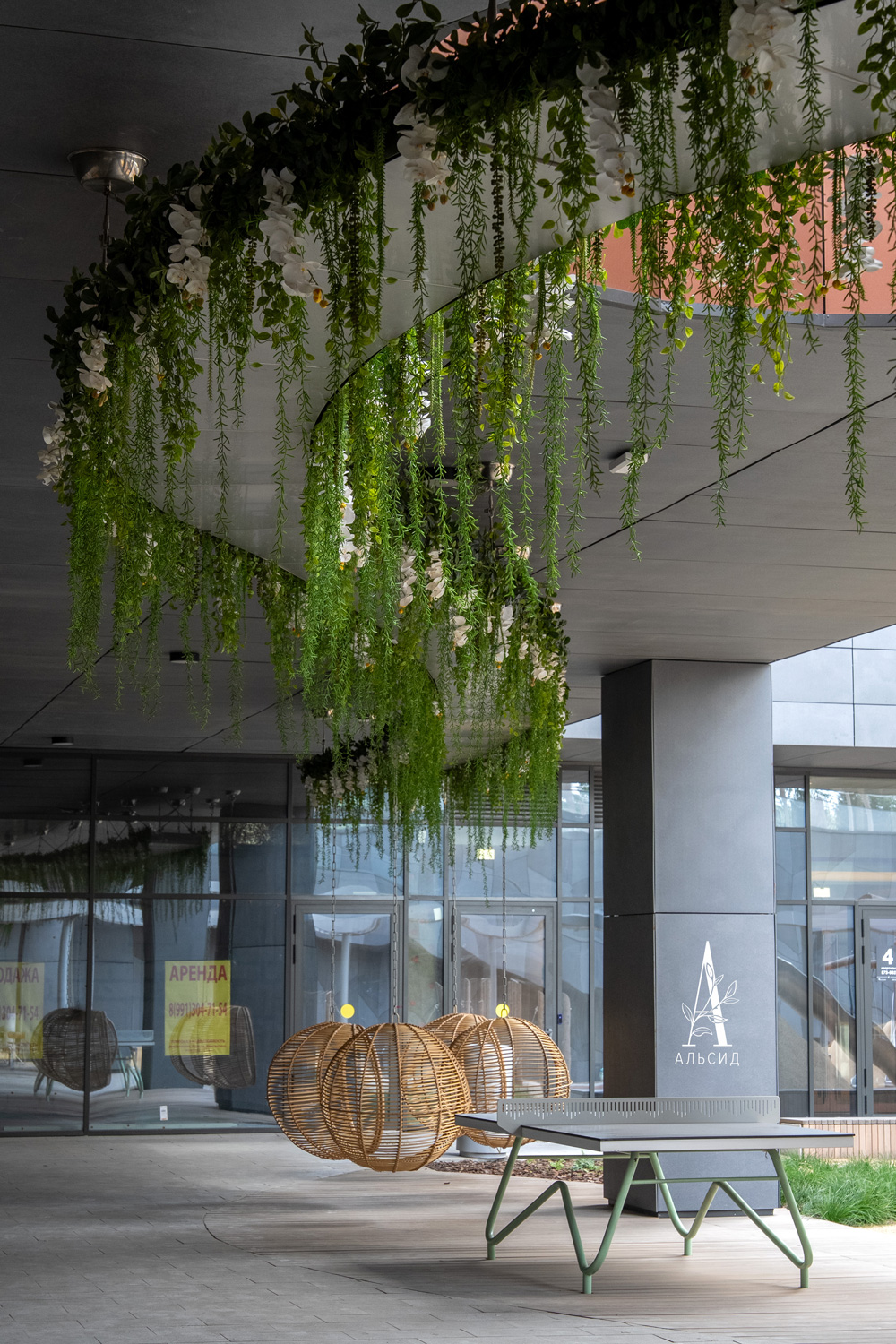 Еще один вариант уличного оформления - это совмещение искусственных растений с освещением. Во внутреннем дворике ЖК Архитектор тропические лианы с орхидеями украшают и прикрывают потолочные светильники в виде волны, идущей вдоль всей зоны отдыха. ;