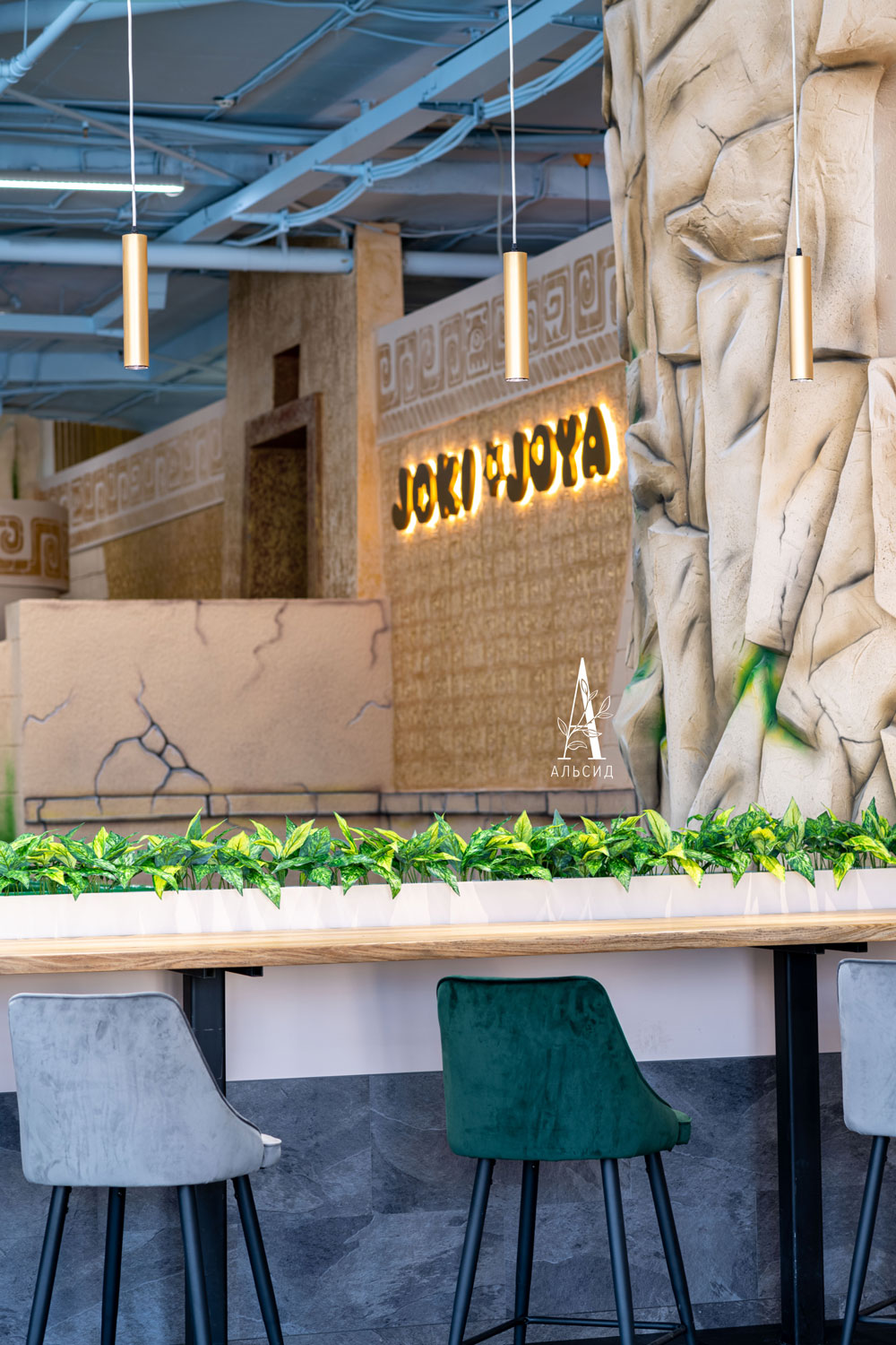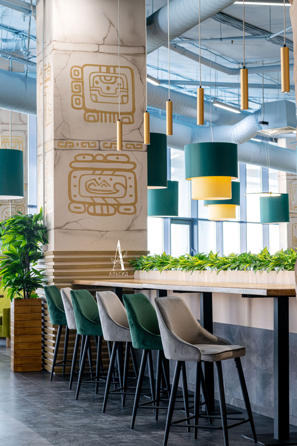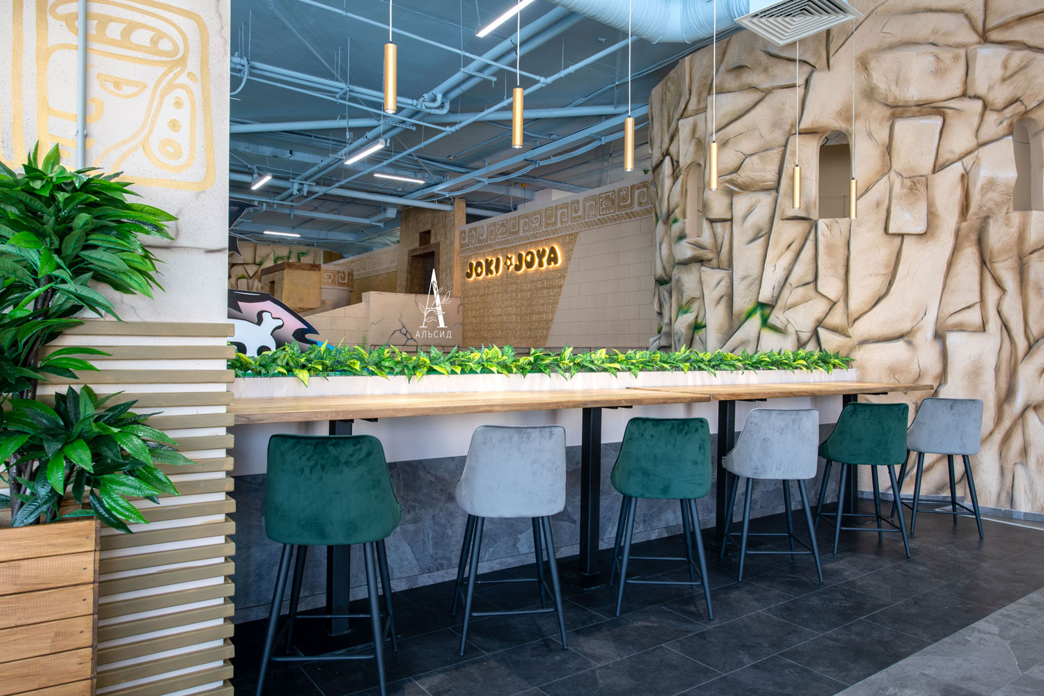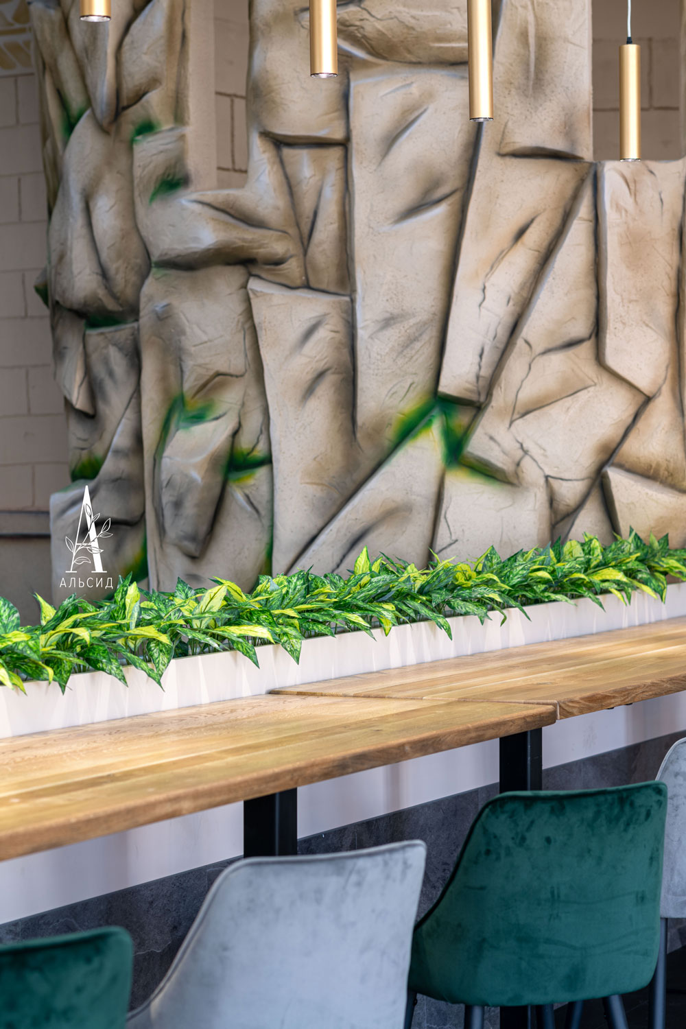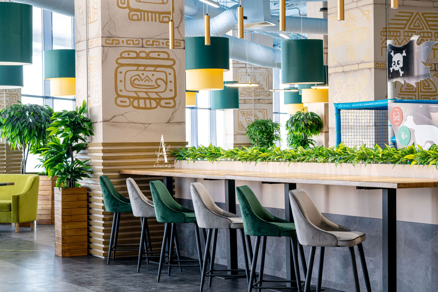 При оформлении помещений часто используют искусственные растения как часть зонирования пространства. Монстера в боксах из натурального кокосового волокна отлично дополняет островки, за которыми можно обустроить отдельную рабочую зону. А пестрая диффимбахия поддерживает тему тропиков на границе игровой и ресторанной зоны.;