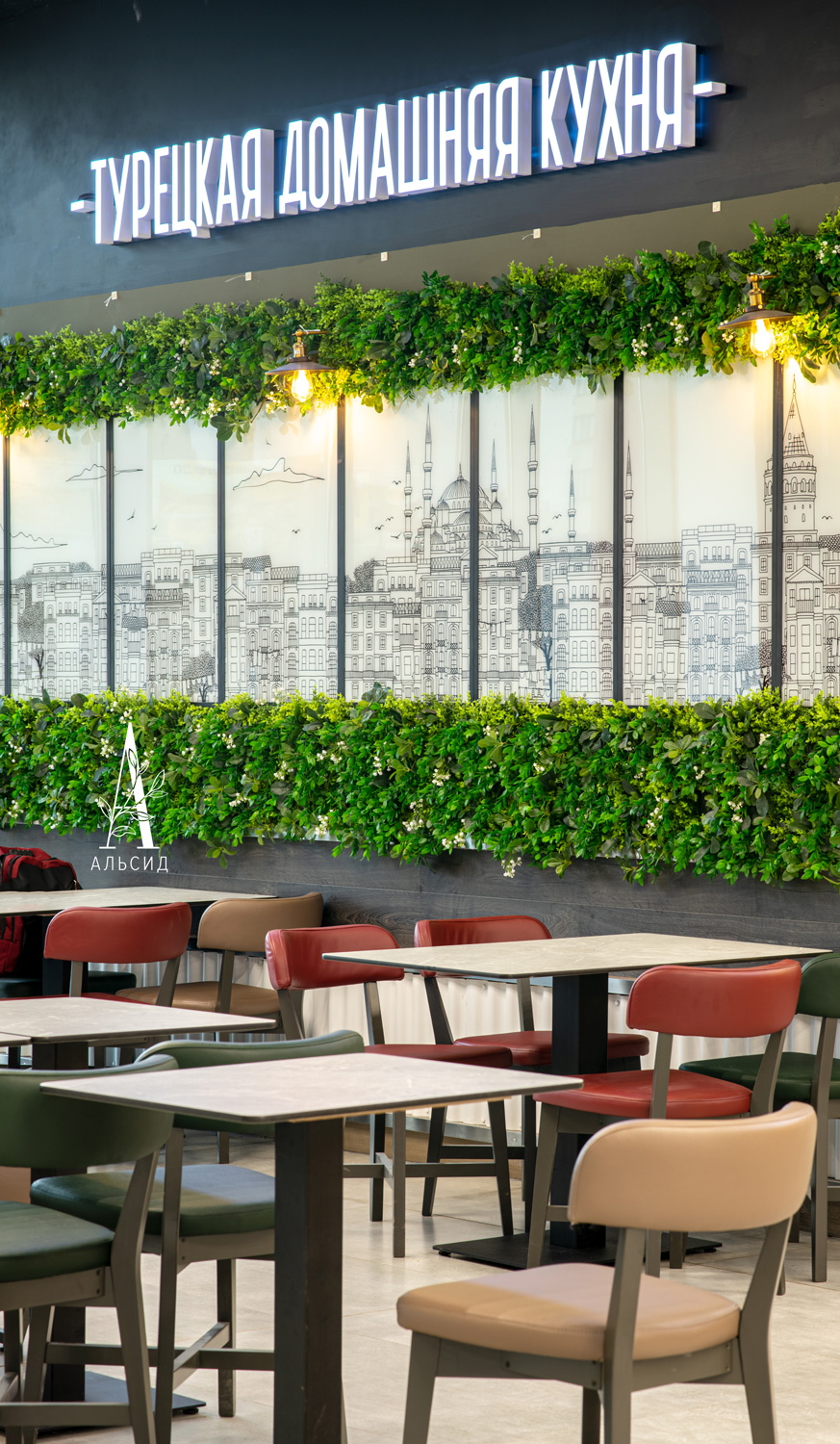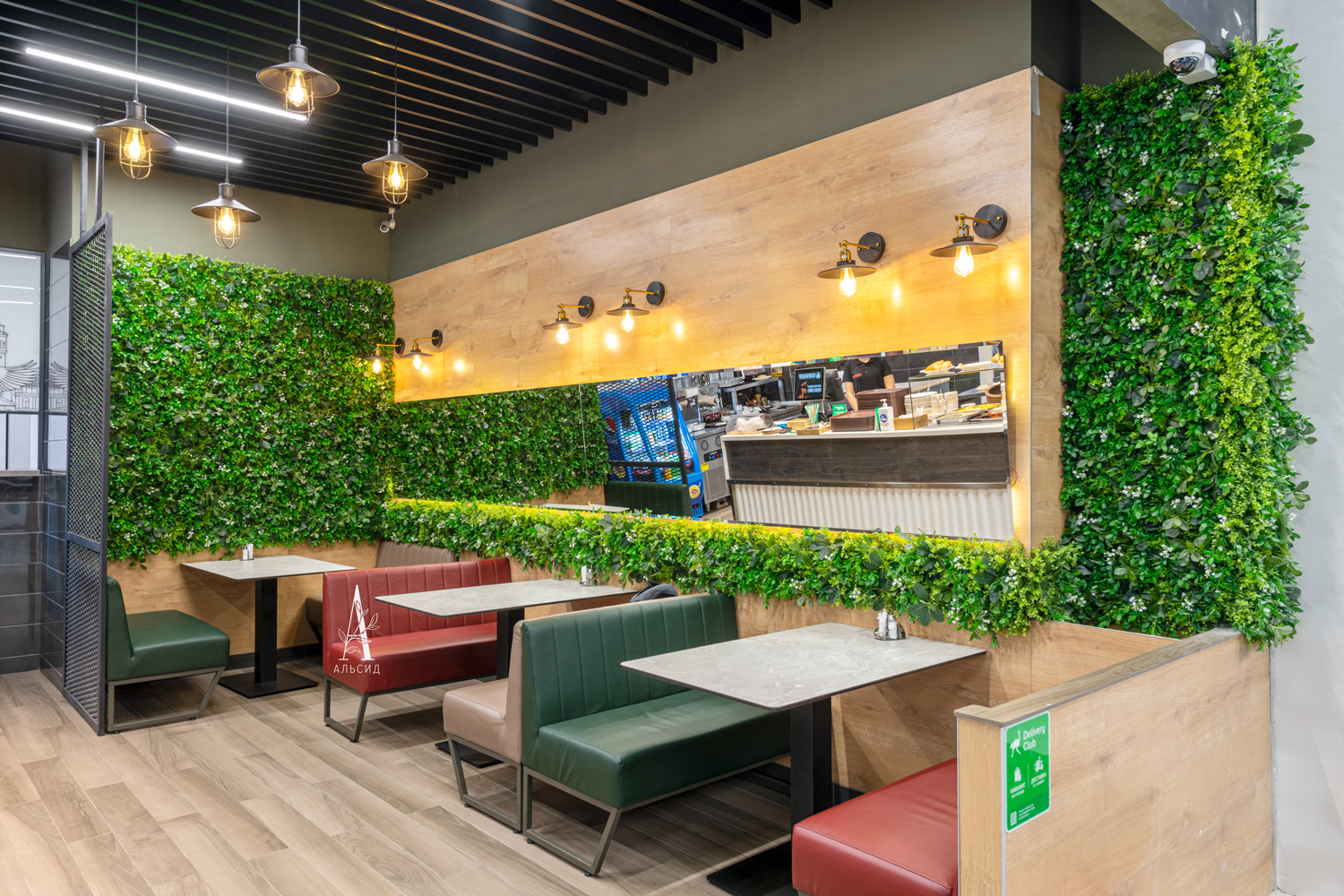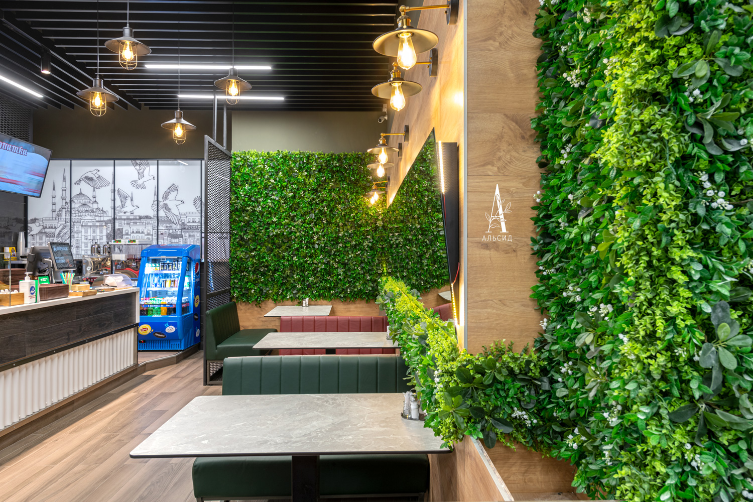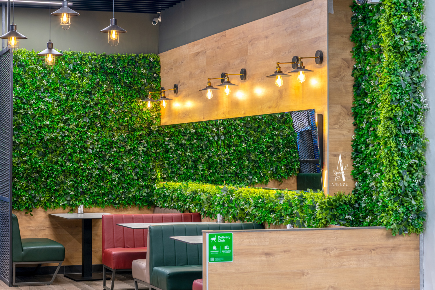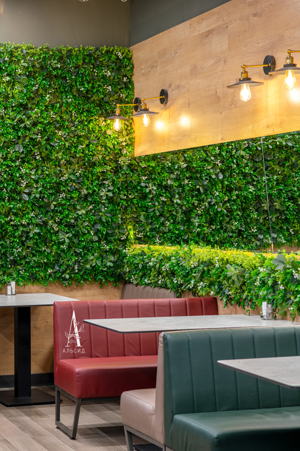 Для оформления кафе была использована фитостена с мелколистными растениями, которые больше подходят для помещений небольших размеров. Такое решение помогает сохранить легкость пространства, не перегружая его лишними элементами.;