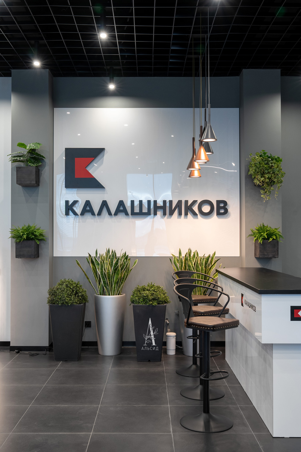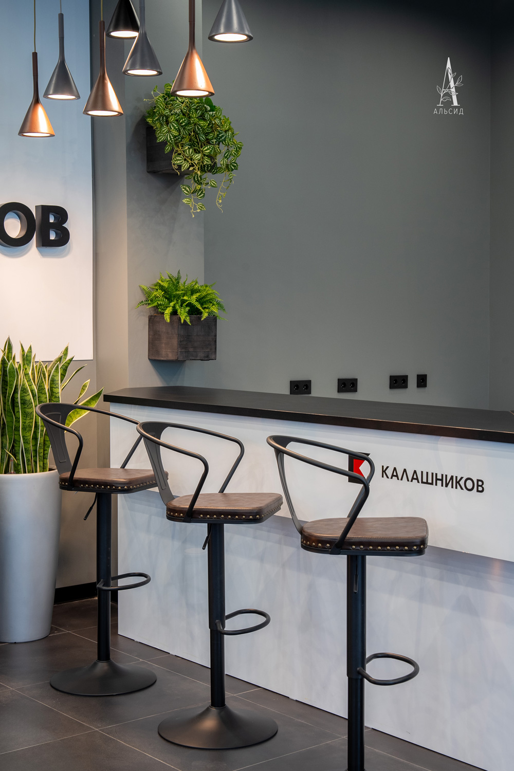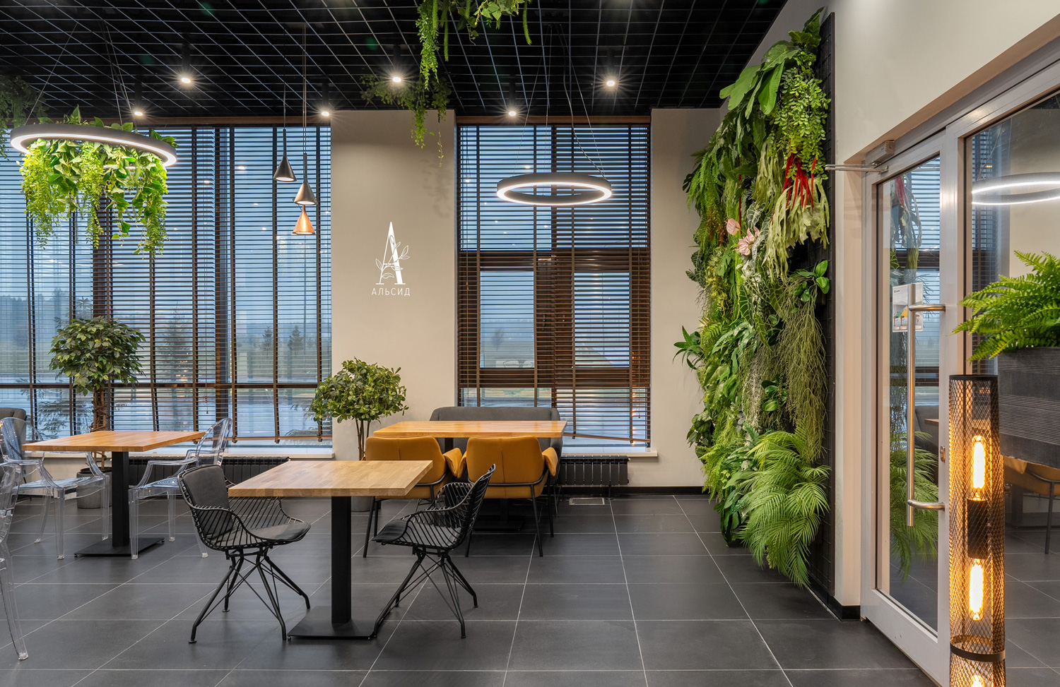 Для интерьера кафе в Огневом центре Калашников дизайнеры выбрали озеленение по всем уровням пространства. Красочная фитостена и логотип с горшечными композициями (папоротник, микс, монстера) сбалансированы между собой и сразу привелекают внимание. Также использованы напольные искусственные деревья (шеффлера, фикус мокламе, фикус) и потолочные ампельные растения: сциндапсус, шеффлера, микс. А вход украшают небольшие зеленые боксы: микс с бегонией, лавр, сциндапсус). ;