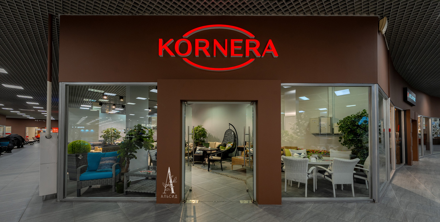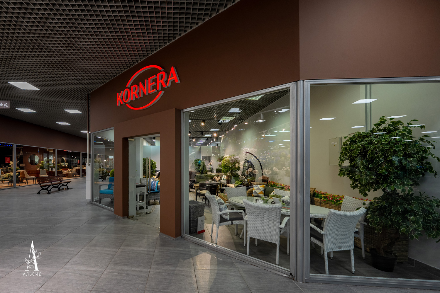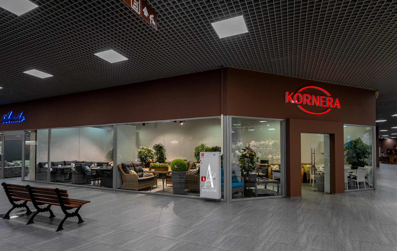Специализированный магазин садовой мебели оформлен деревьями (бонсай в кашпо со мхом, бамбук в кашпо со мхом, фикус Бенджамина, фикус, туя в кашпо со мхом, самшит, мандарин) и цветочными композициями, которые точно передают направленность бренда и создают характерную атмосферу.;