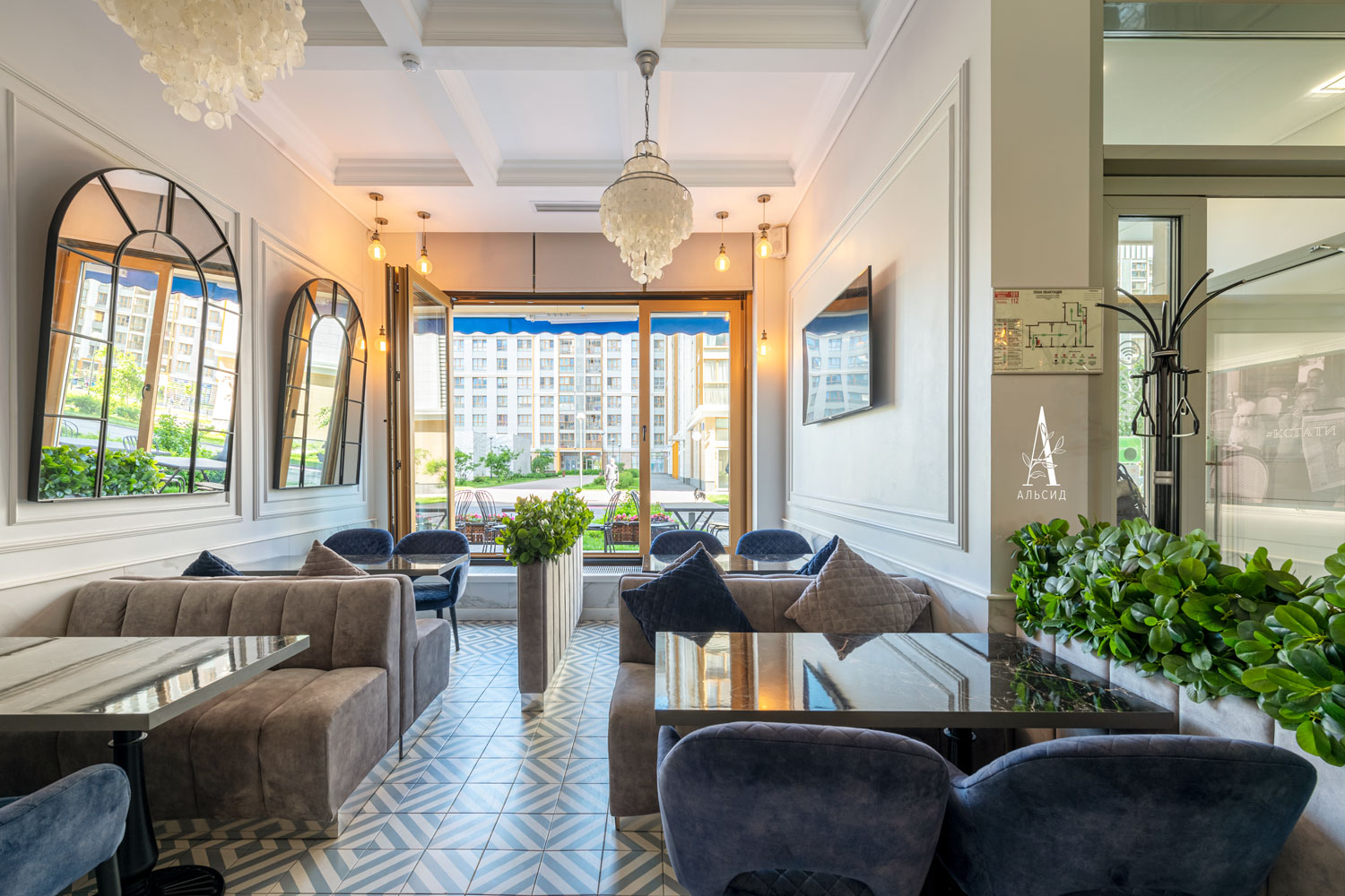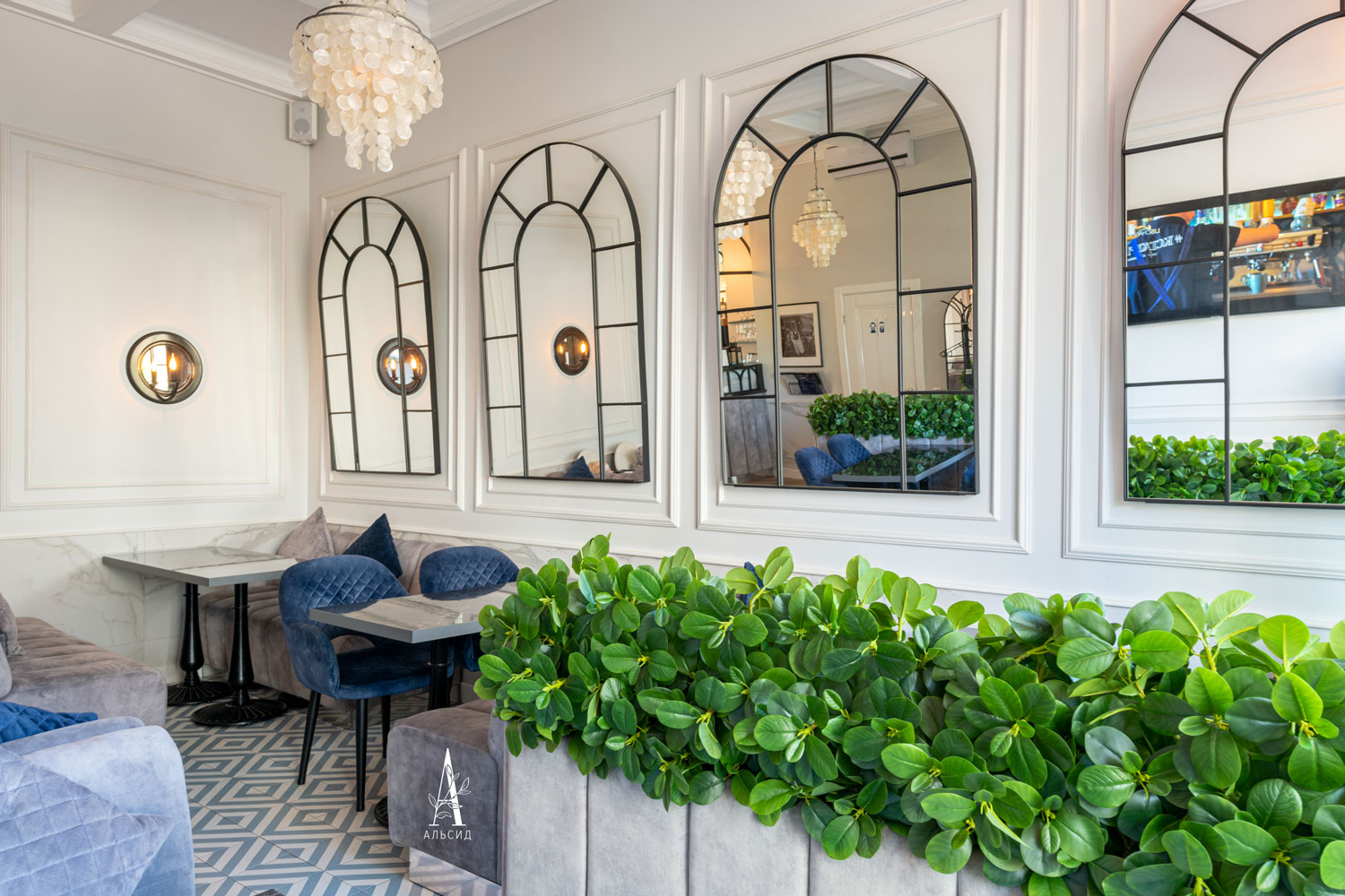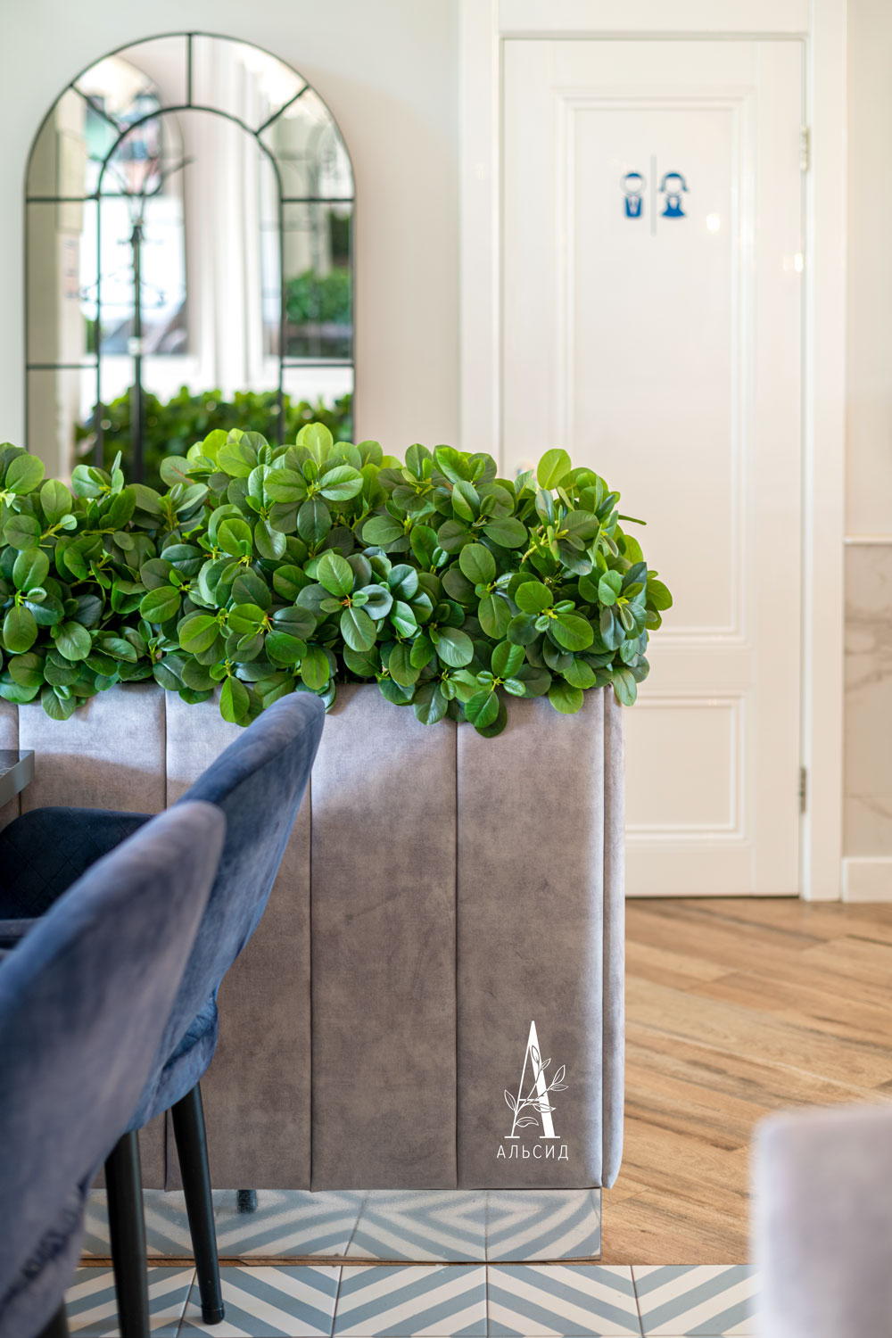 Монокомпозиция из шеффлеры не только украшает и освежает залы кафе #Кстати, но также несет дополнительную функцию по зонированию пространства и разделению столиков друг от друга для создания повышенного комфорта и уюта гостей.;