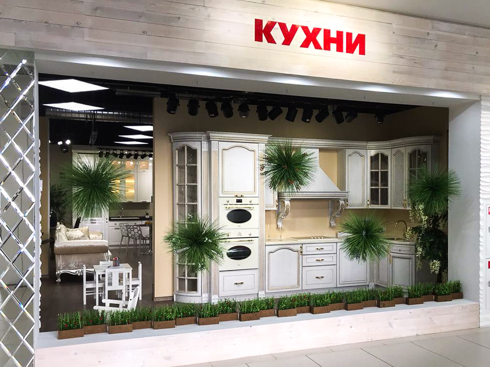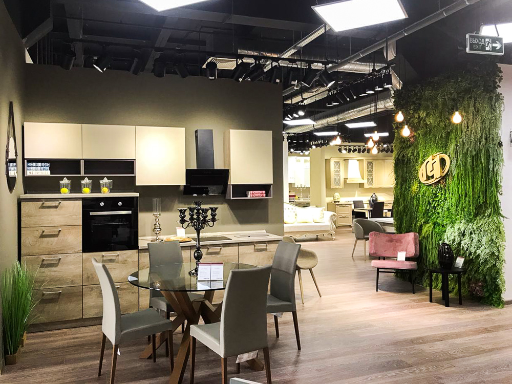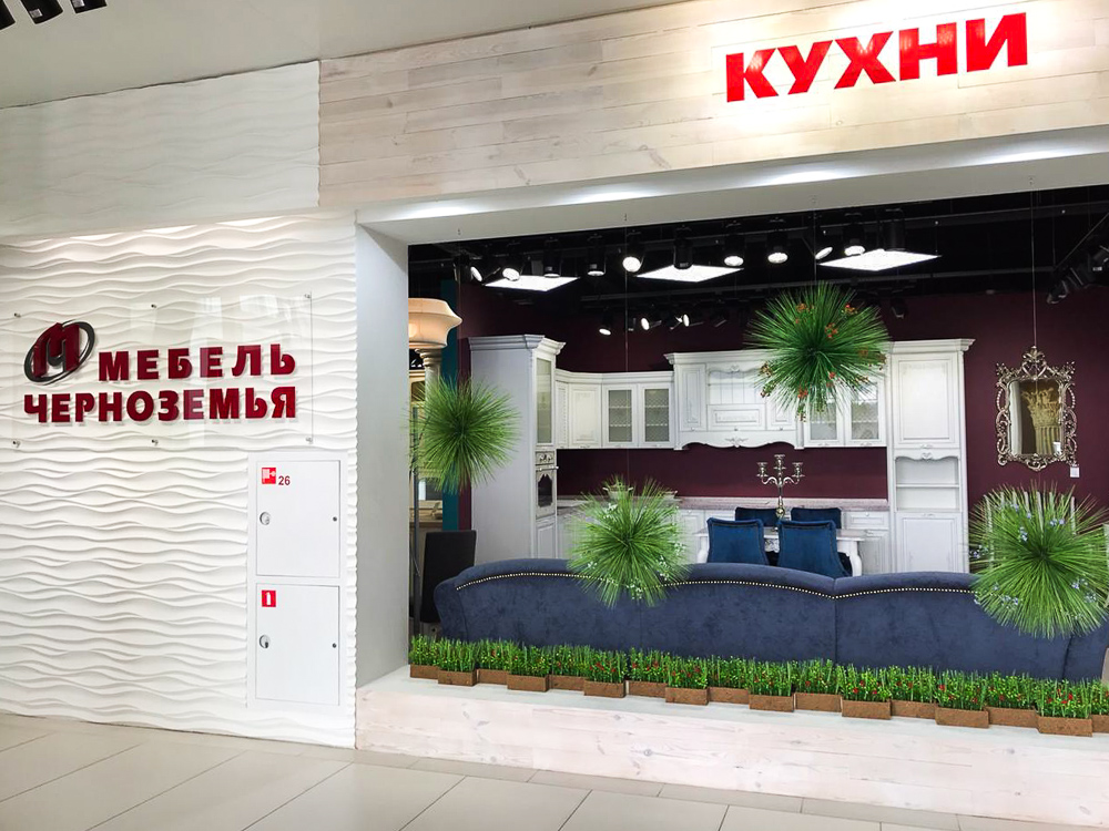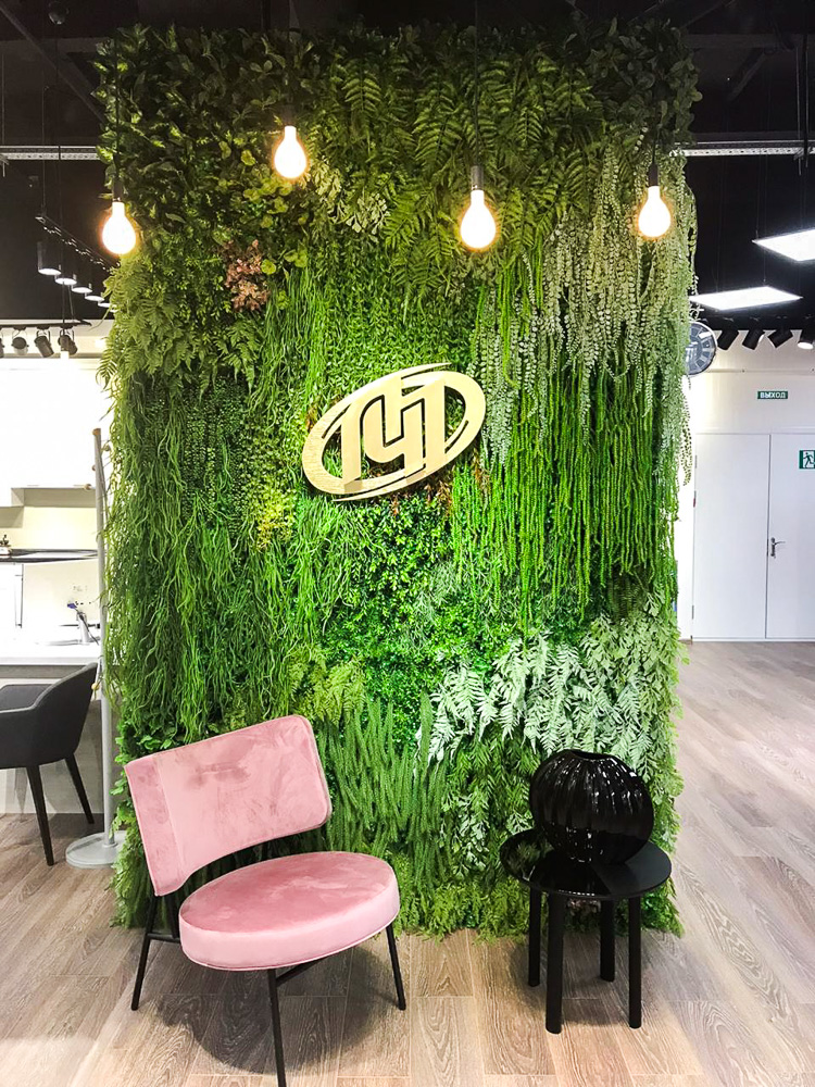 Озеленение выставочного зала мебельной марки «Мебель Черноземья». ; В центре зала расположена наша популярная фитостена с папоротниками и ампельными растениями на которой закреплён логотип компании. В витрине подвешены шары из осоки с гипсофилой, которые мы изготавливали под заказ. По залу расставлены кокосовые боксы и кашпо с травой. ; Искусственные растения максимальной реалистичности подчеркнули утонченный дизайн и сделали пространство более уютным и современным. ;