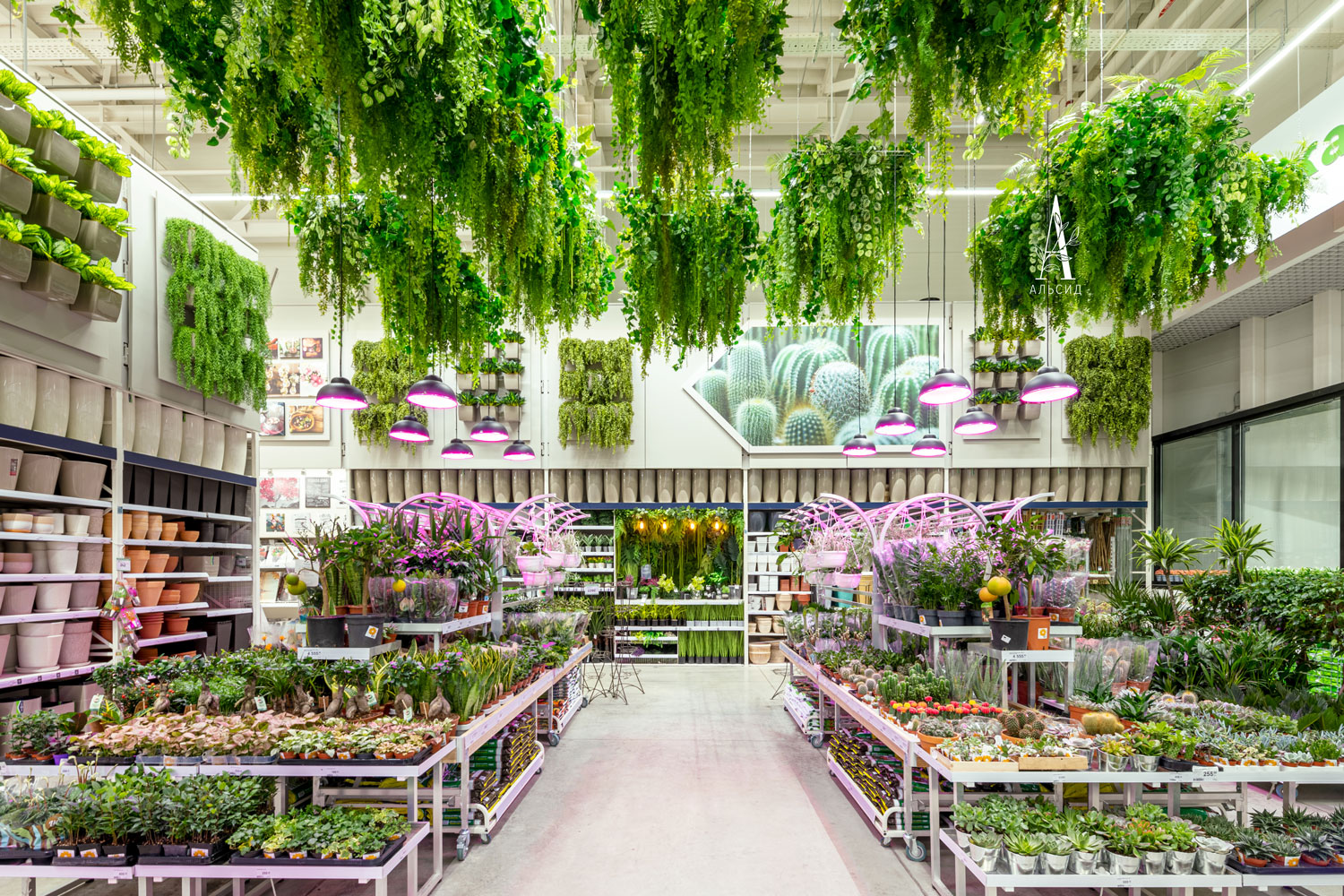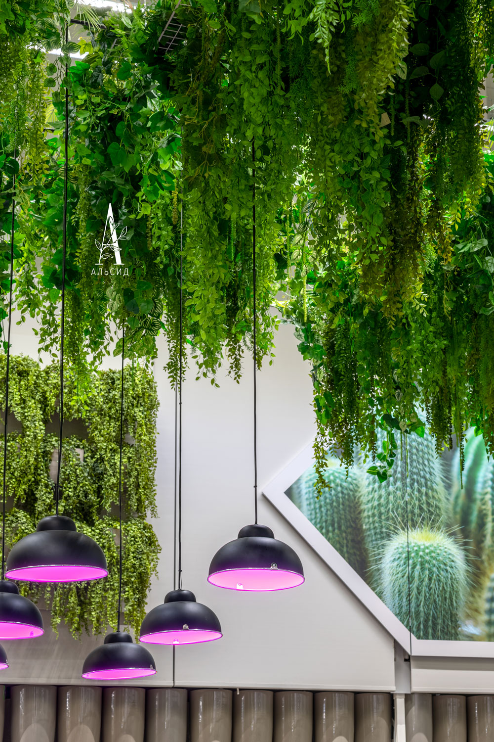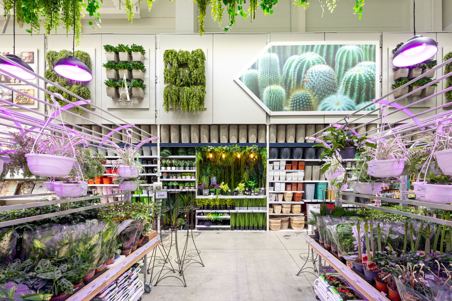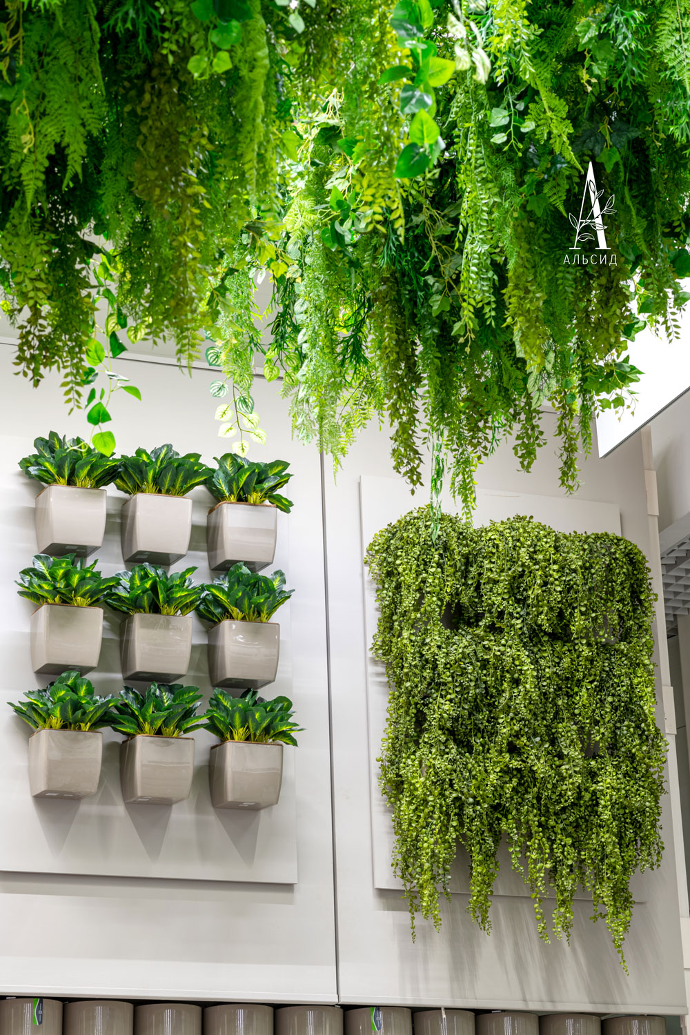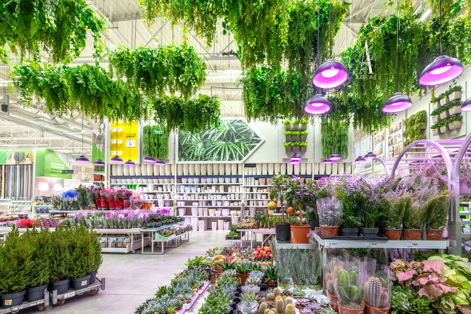 Наше производство может справиться и с таким объемом задач, как оформление отделов гипермаркета Леруа Мерлен. В зоне проектирования кухни искусственные растения (папоротник, хедера, микс) представлены в качестве декора, который все чаще появляется на обычных домашних кухнях, ведь они стойко выдерживают любые условия без потери внешнего вида. Большой отдел с растениями сразу привлекает внимание своим потолочным оформлением в виде множества различных ампельных растений (аспарагус, лианы микс, адиантум, палочник, нефролепис, монстера), а на стенах собраны композиции из горшечных растений. В центре отдела встроена тропическая фитокартина, которая так гармонично сочетается вместе с живыми растениями. ;
