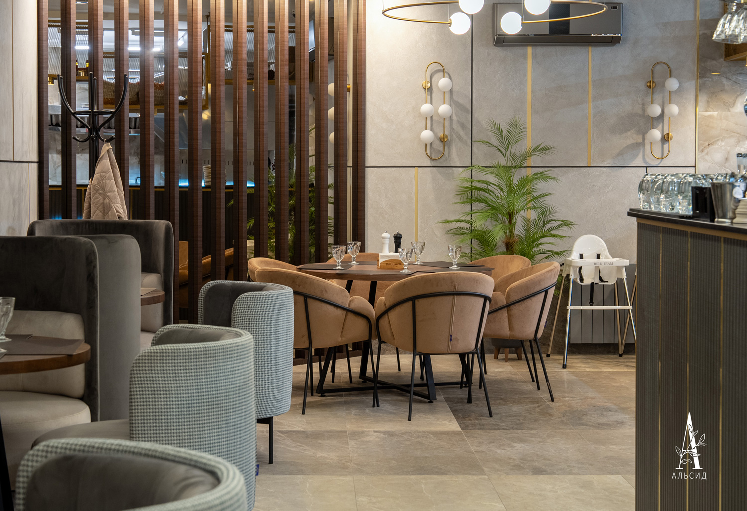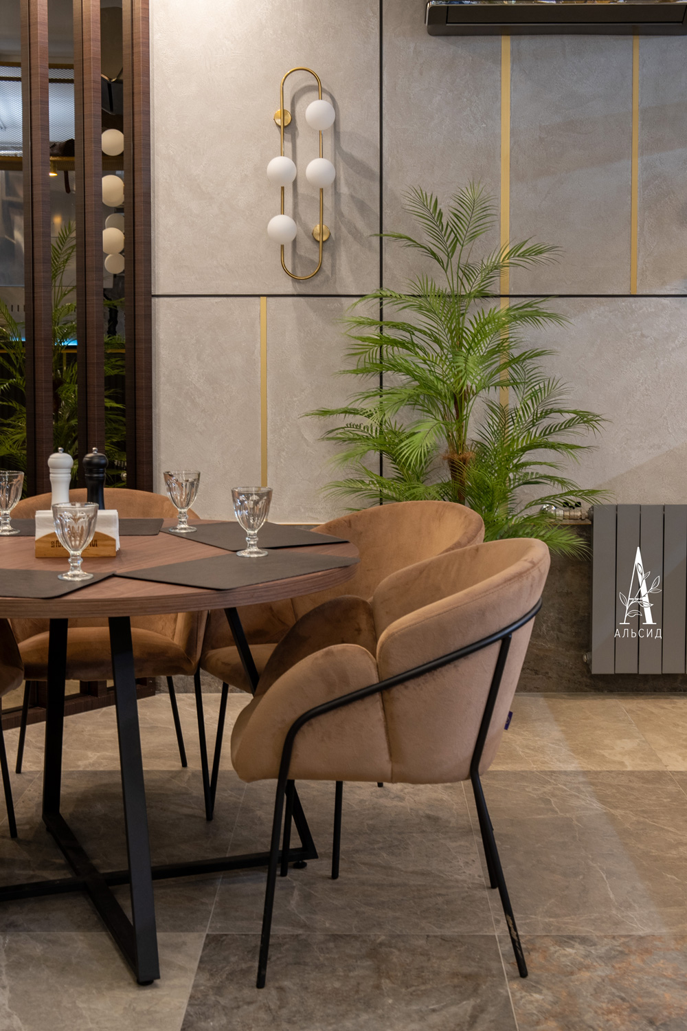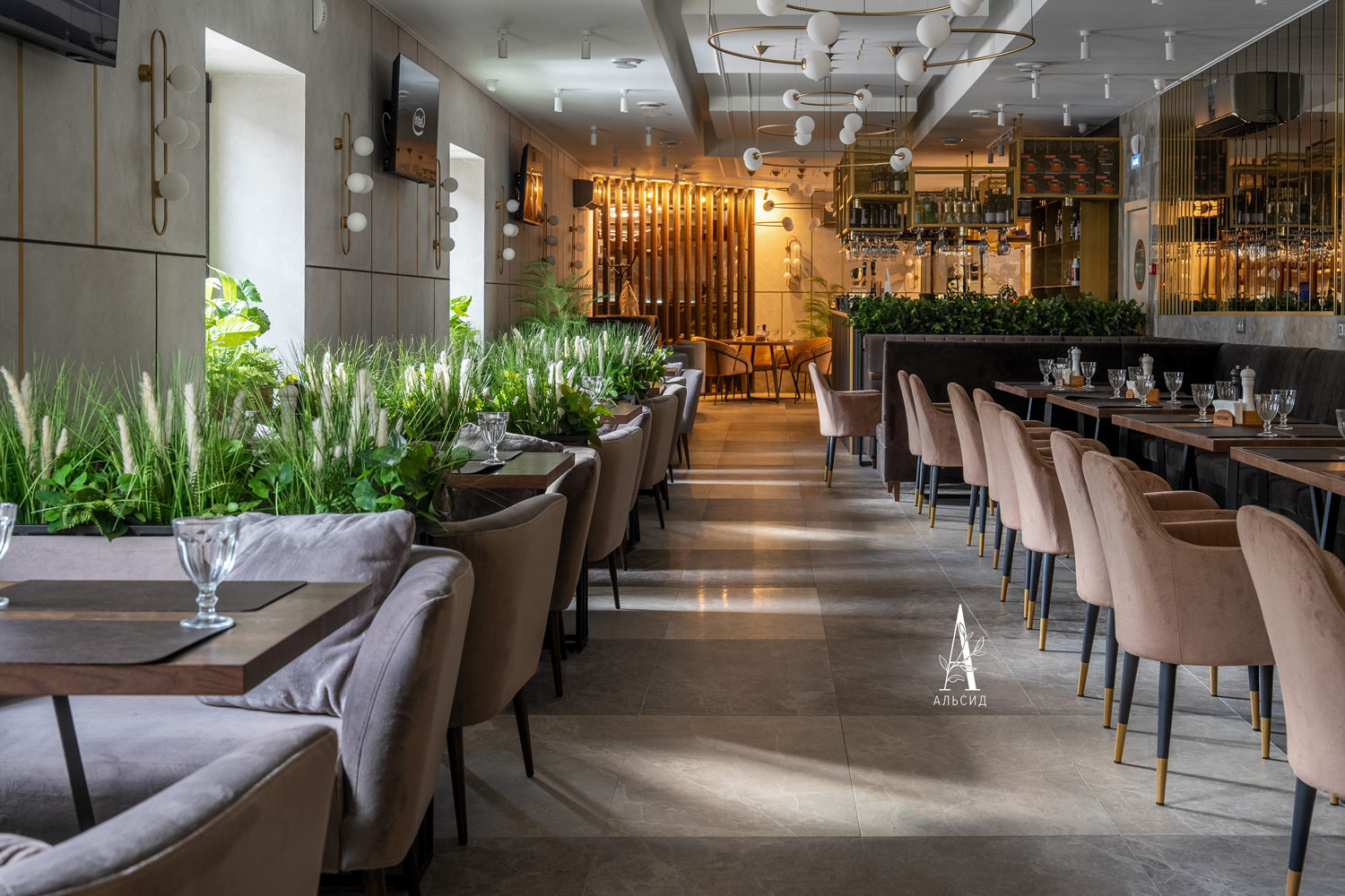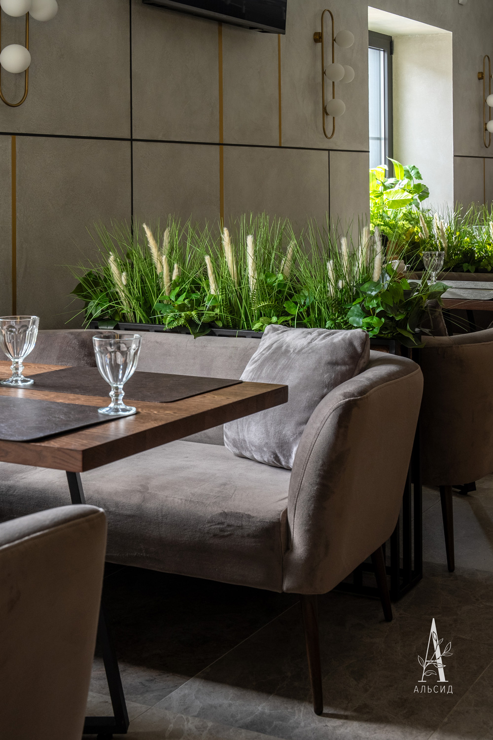 Озеленение растениями стало неотъемлемой частью оформления ресторанов. Композиции в кокосовых боксах (шеффлера) идеально зонируют столики и пространство, а тропический микс оттеняет свет от окна. Экзотическая пальма украшает и освежает дальний уголок, а папоротники и боксы с ампельной травой дополняют настенные ниши. ; ;