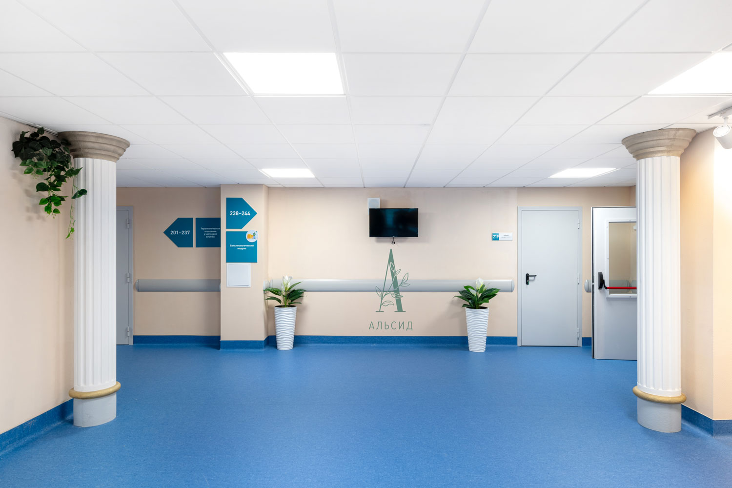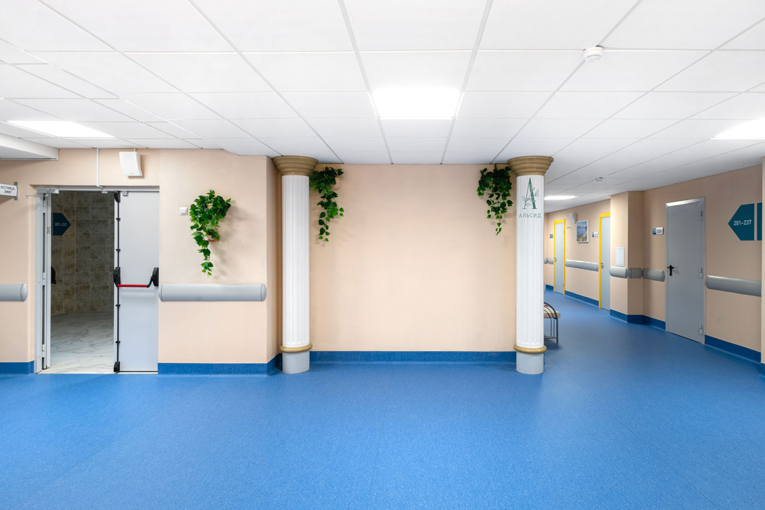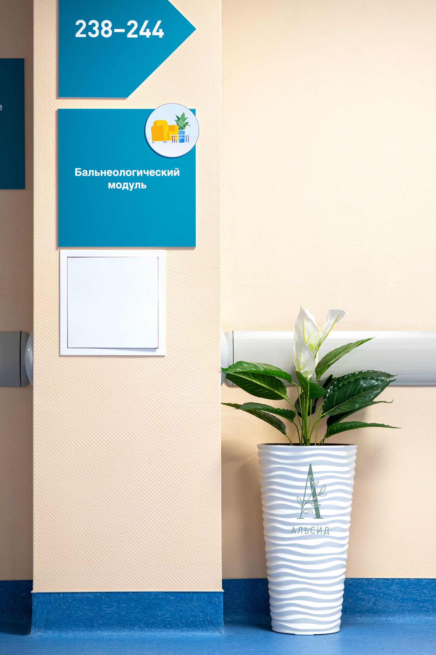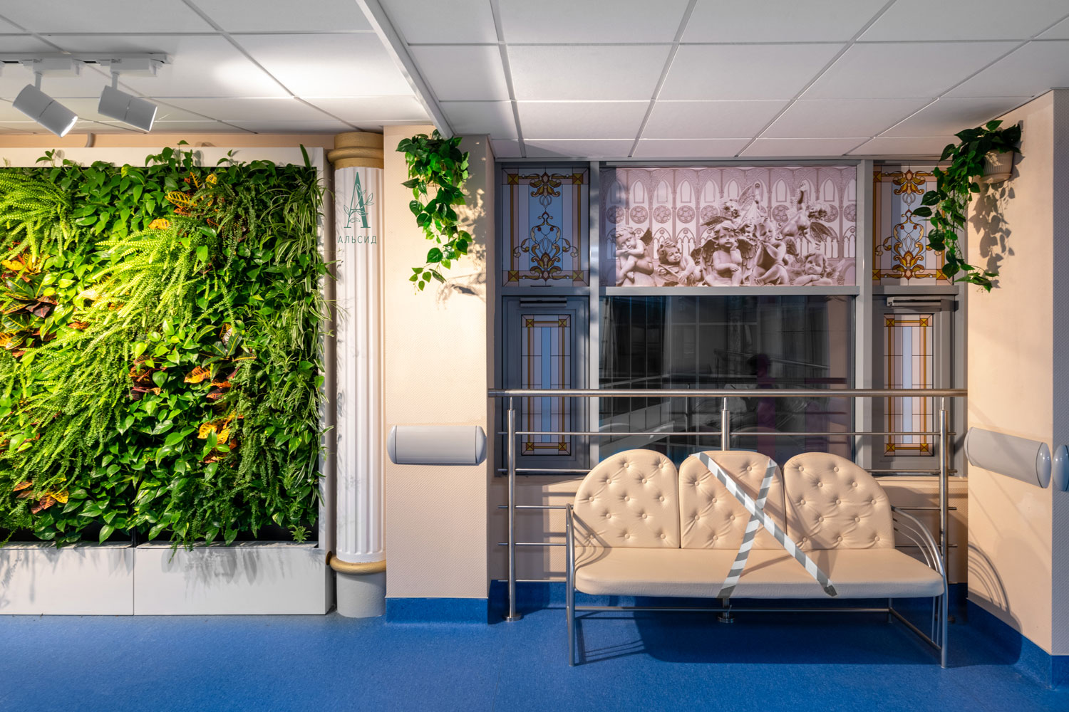 Новый городской медицинский центр в Сертолово построен в соответствии со всеми современными требованиями, которые повышают уровень комфорта пациентов. Различные направления медицины, удобная навигация и успокаивающий интерьер, декорированный ампельными и напольными растениями из искусственных премиальных материалов. Как и кабинеты, длинные коридоры без окон также нуждаются в озеленении. Сциндапсус в подвесных кашпо и спатифиллум в высоких кашпо смотрятся очень натурально в стенах медицинского центра, при этом не требуют особого ухода.;