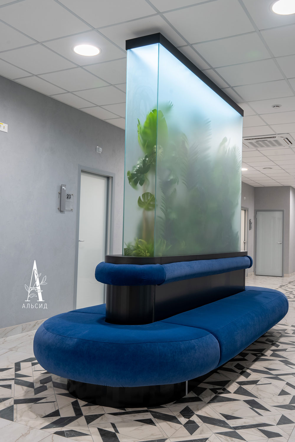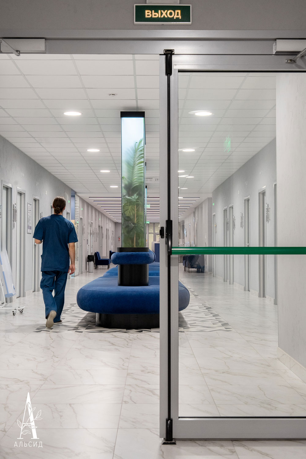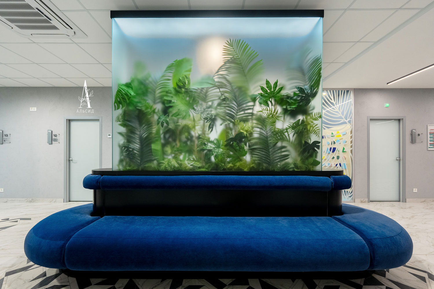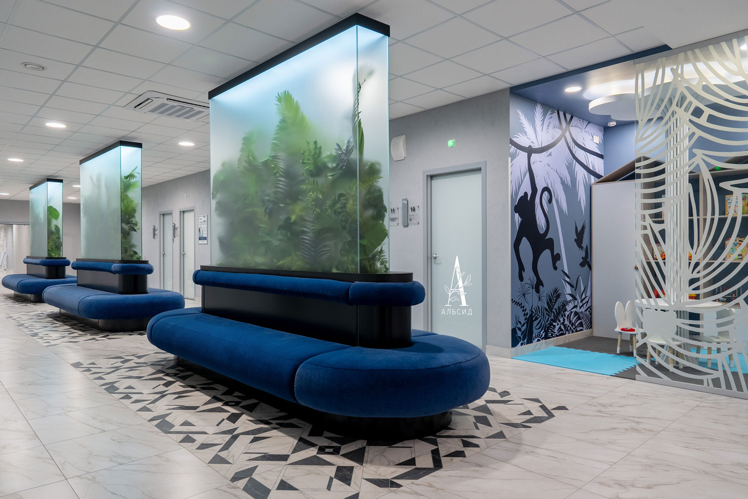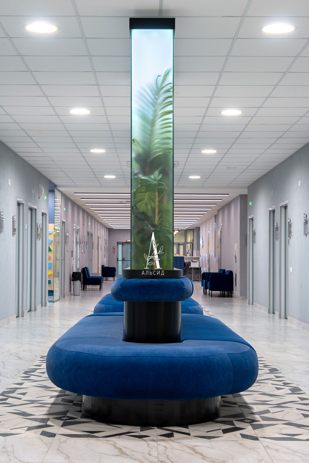 Медицинский центр многопрофильного уровня был спроектирован дизайнерами, которые реализовали скамейки для ожидания в виде оазиса посередине коридора. Во флорариумах расположены тропические композиции из искусственных растений в ящике и на подставке.;