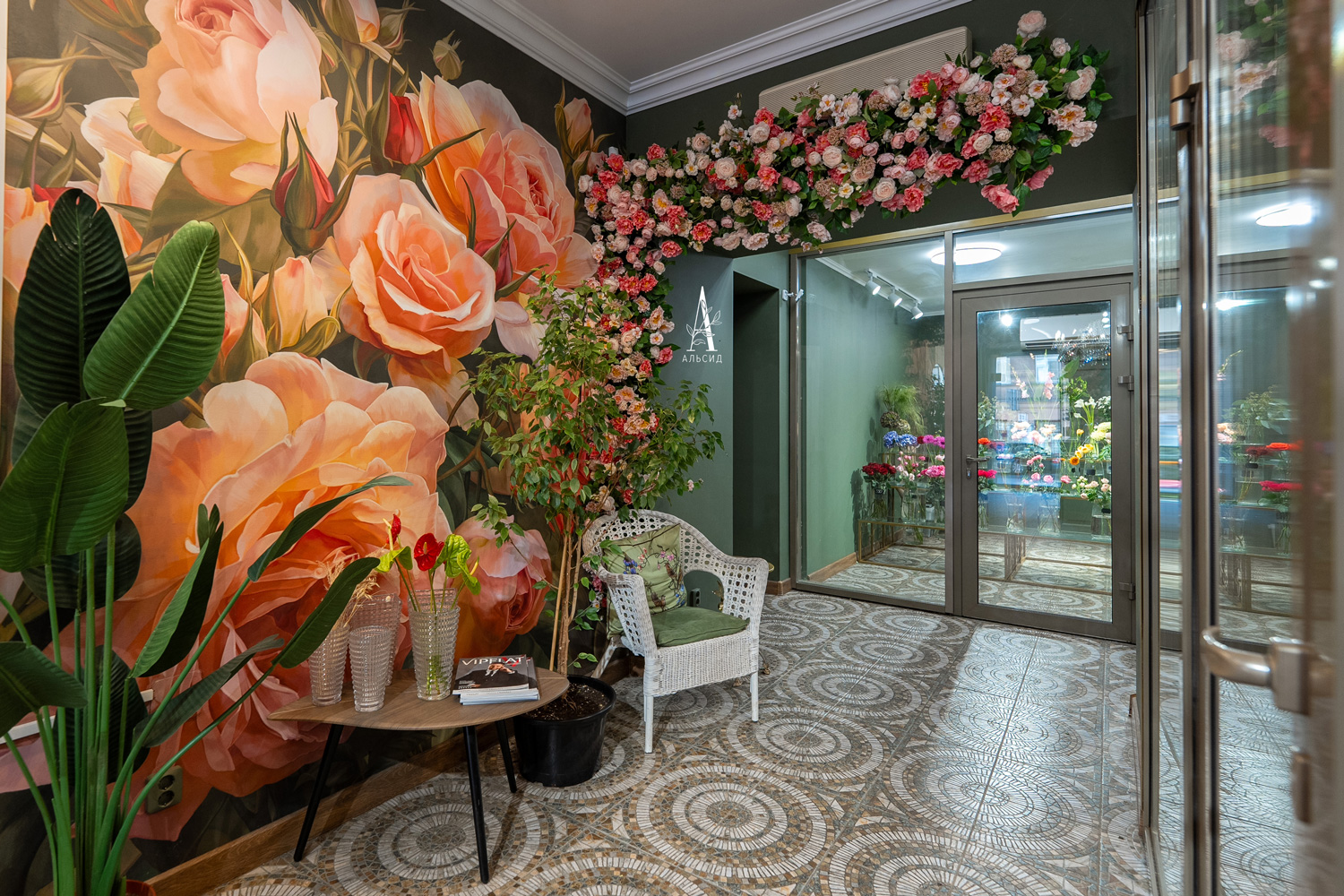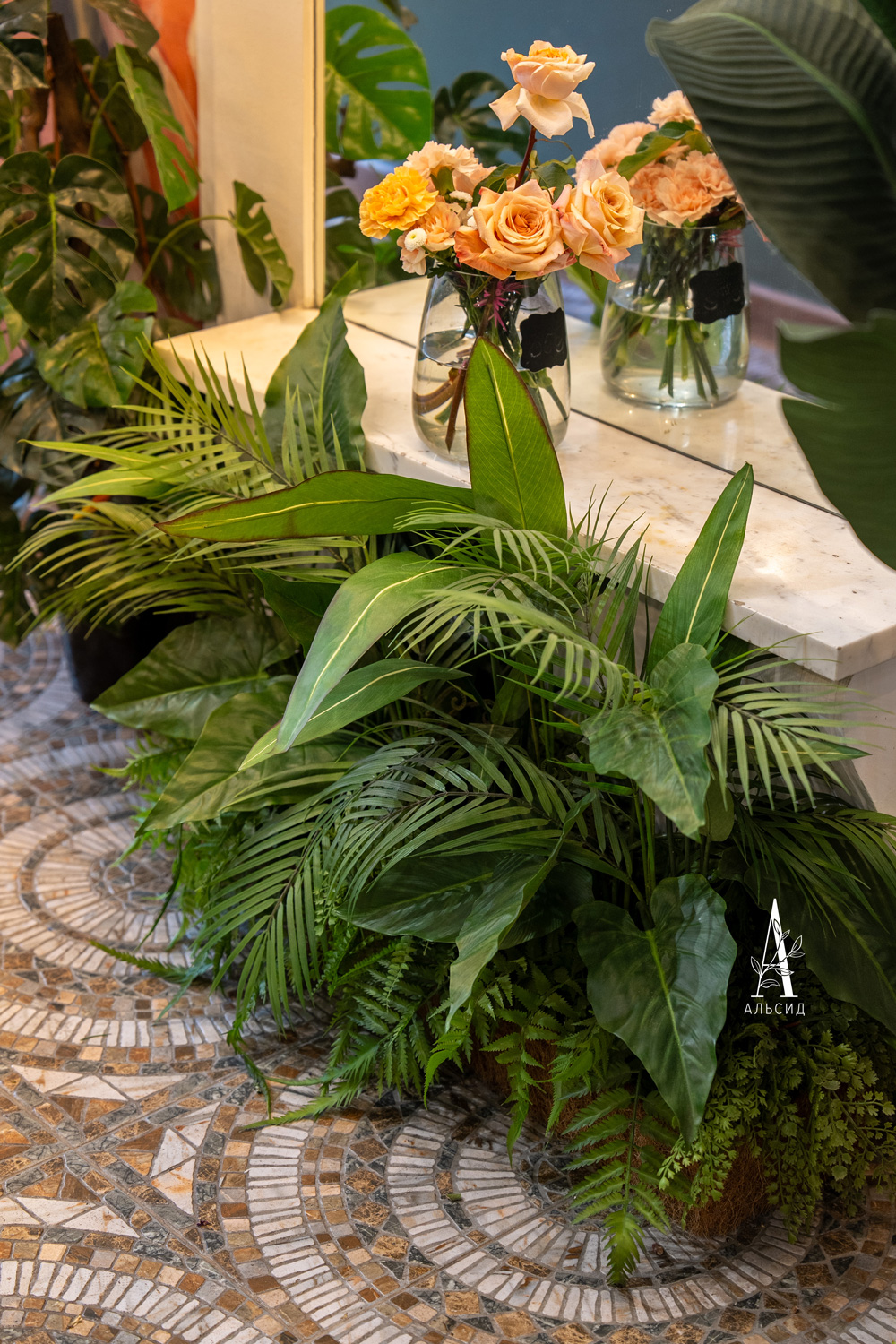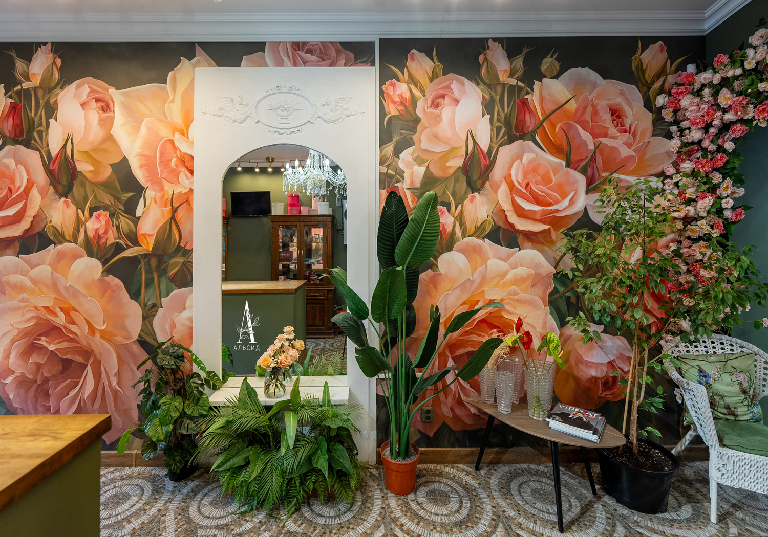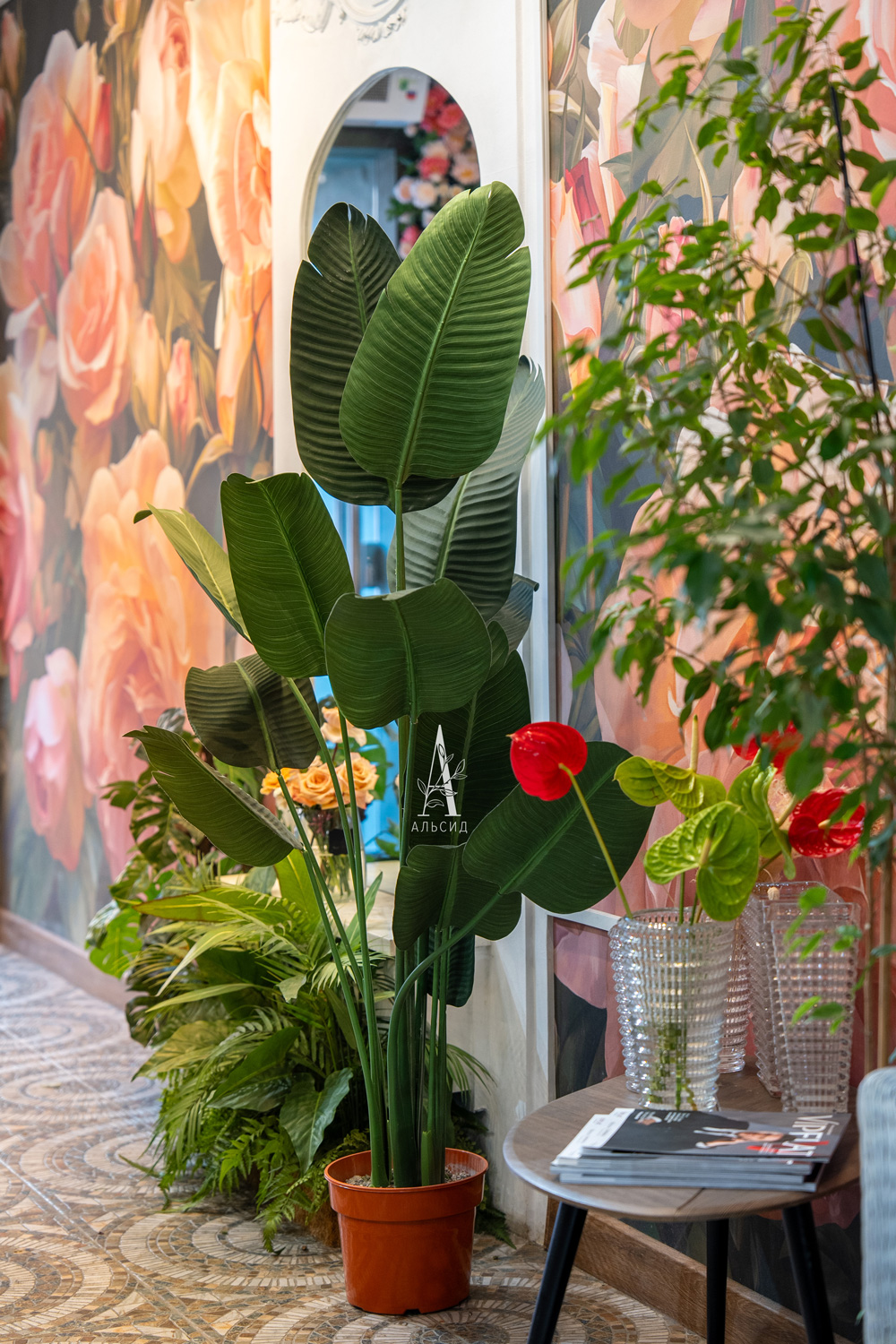 В цветочном бутике искусственные растения гармонично сочетаются с живыми, так как выполнены из премиального материала и практически не отличаются от настоящих. Композиция из нежных бутонов на фоне цветочной фрески подобраны под общую цветовую гамму интерьера и обрамляют дверь и арочку. Банан и тропический микс создают дополнительный объем настенным рисункам. Вход в бутик украшают яркие лианы, которые видны с любой стороны улицы.;