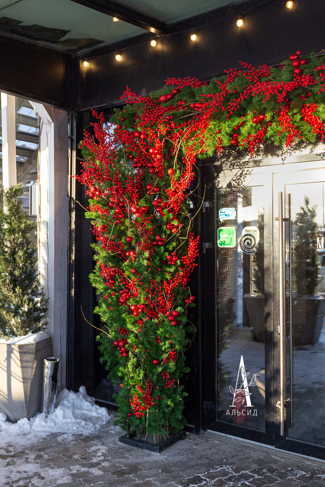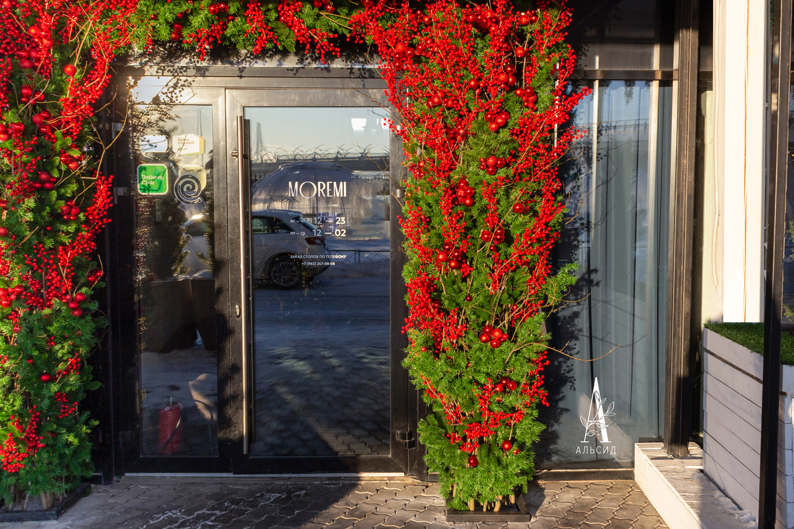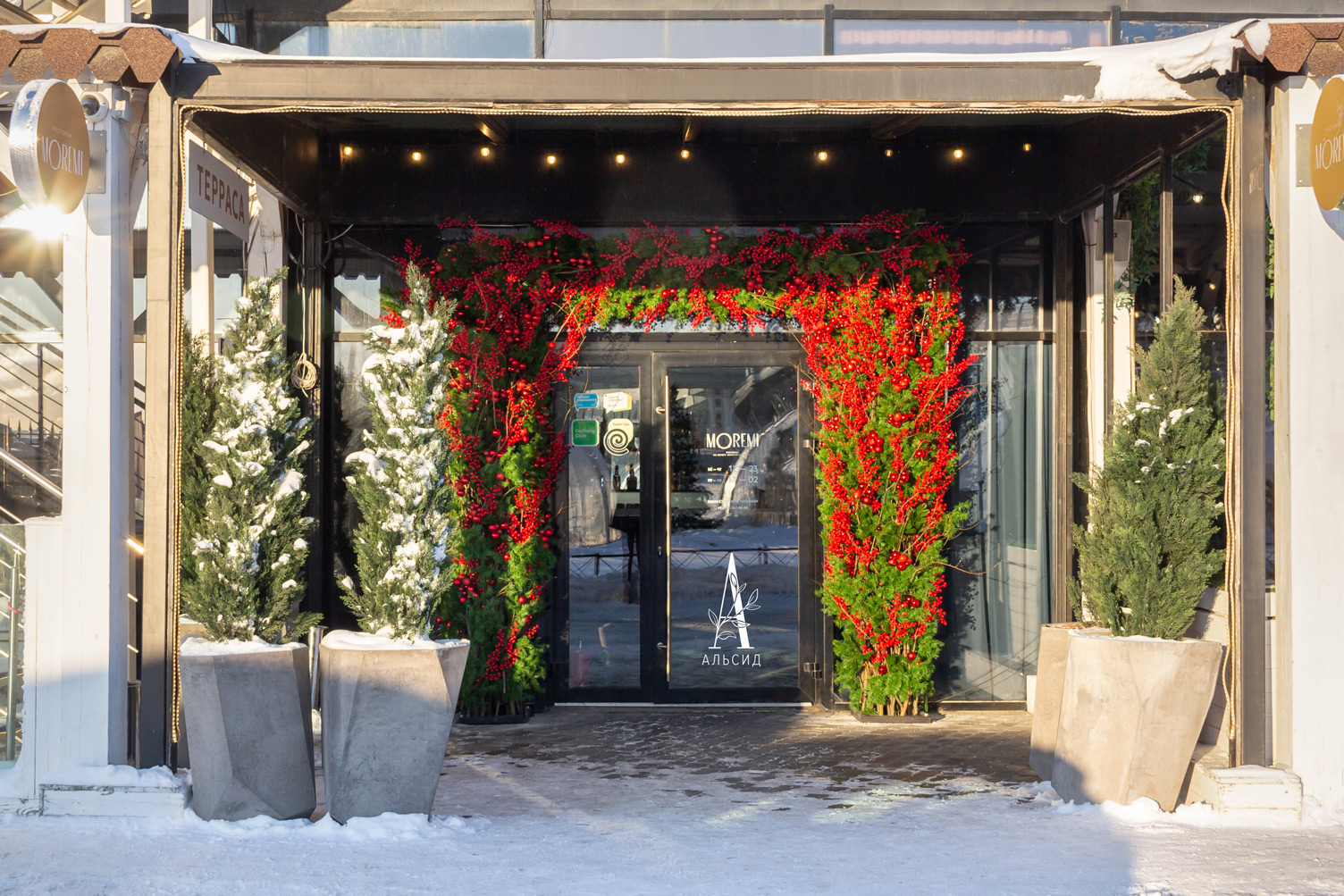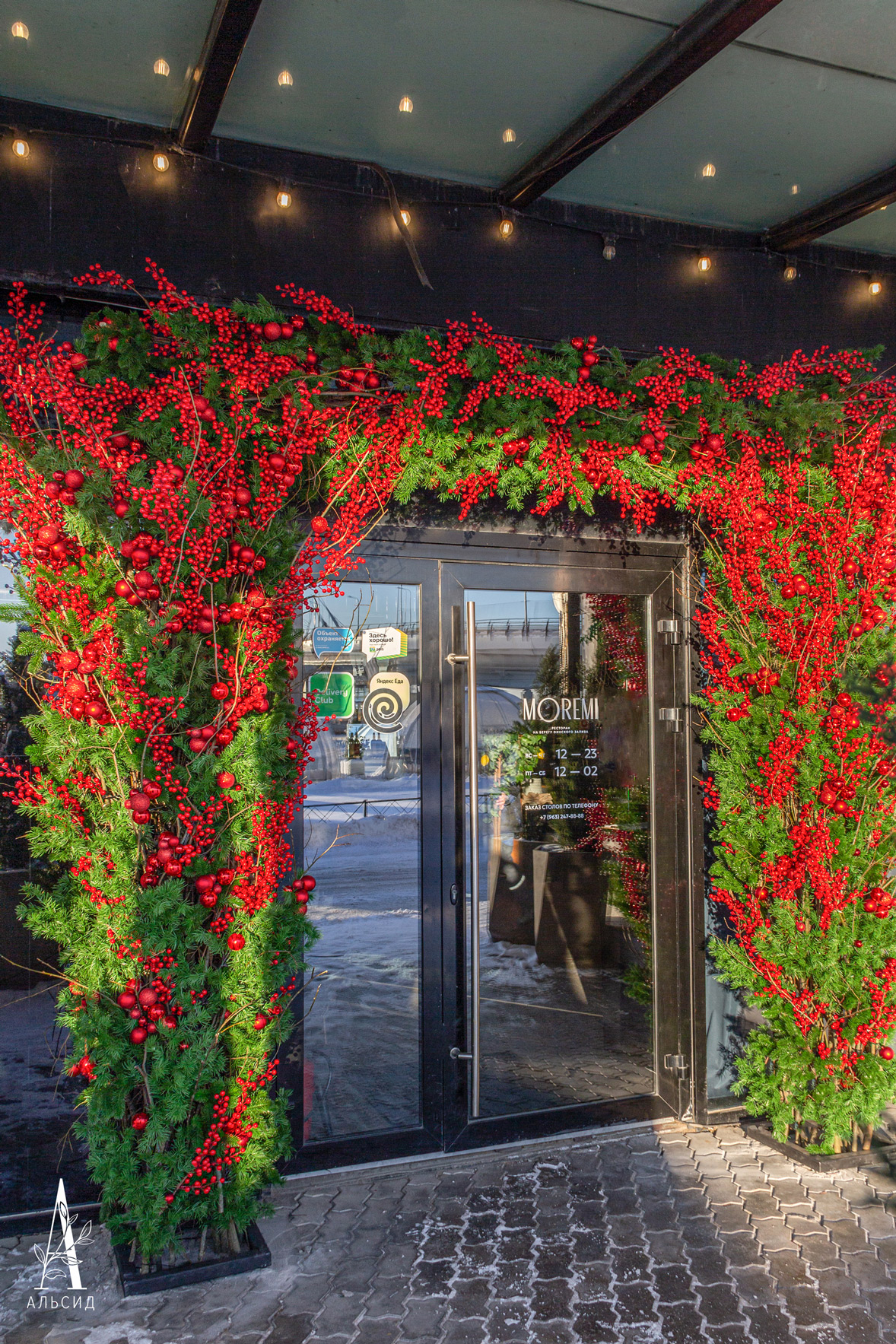Потрясающая арка украшает входную группу ресторана Moremi на берегу Финского залива. Хвойные ветви в сочетании с красными зимними ягодками являются классическим, но в то же время удивительным по своей красоте вариантом новогоднего декора. В лучах зимнего солнца такое оформление выглядит особенно манящим и привлекательным.;