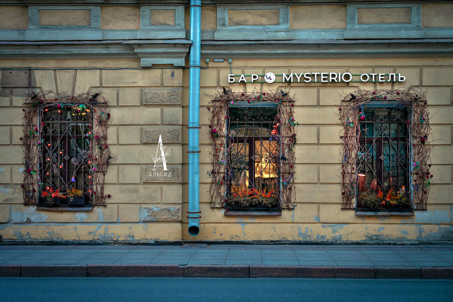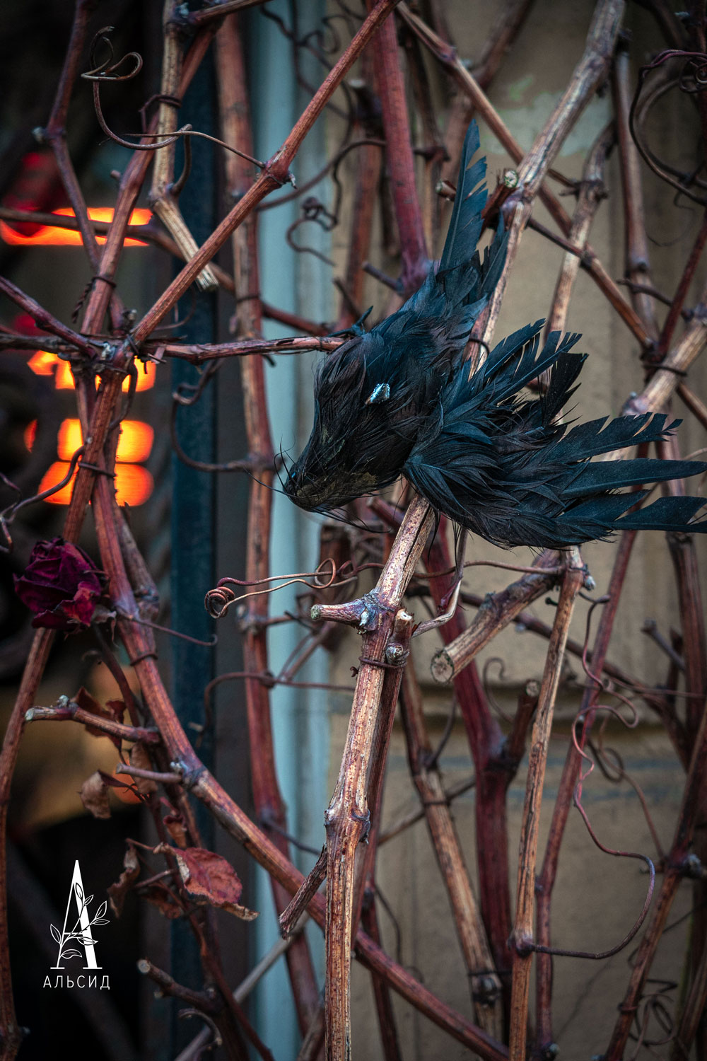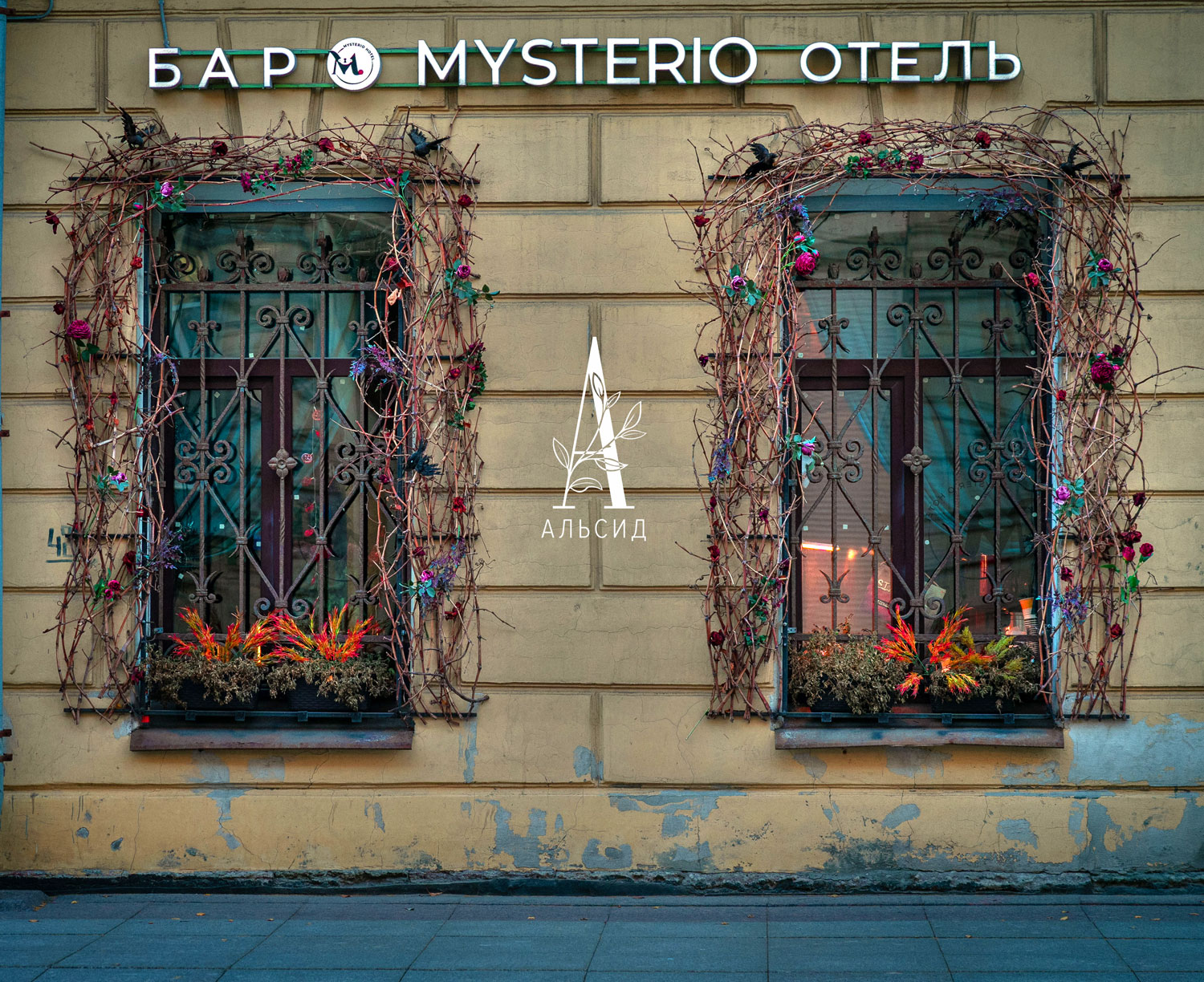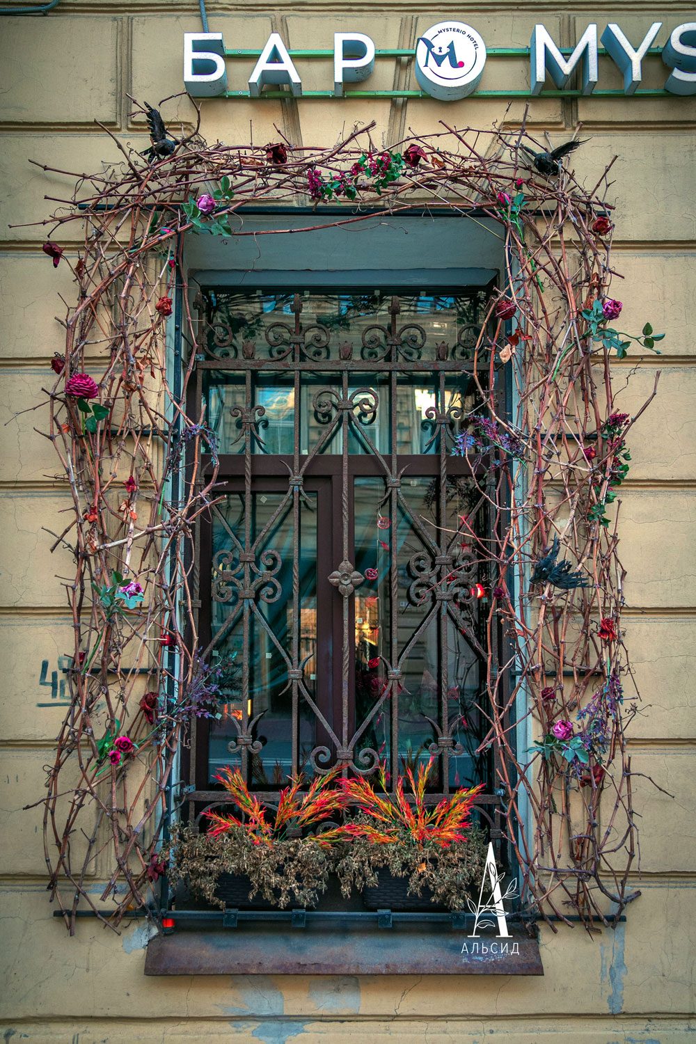 Осенний декор окон отеля Mysterio сразу привлекает внимание, ведь они опутаны натуральной лозой с искусственными и увядшими розами, в которых запутались птички. Для заведения такой символизм раскрывает концепцию, а для наших дизайнеров - это интересный проект уличного оформления для Хэллоуина.;