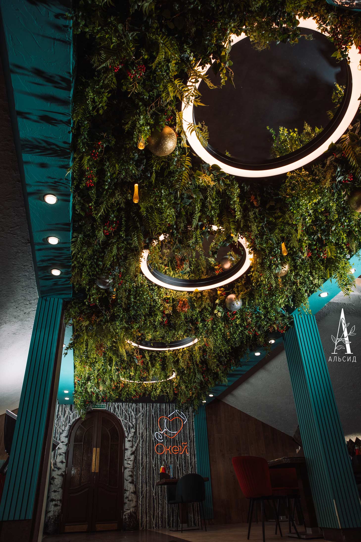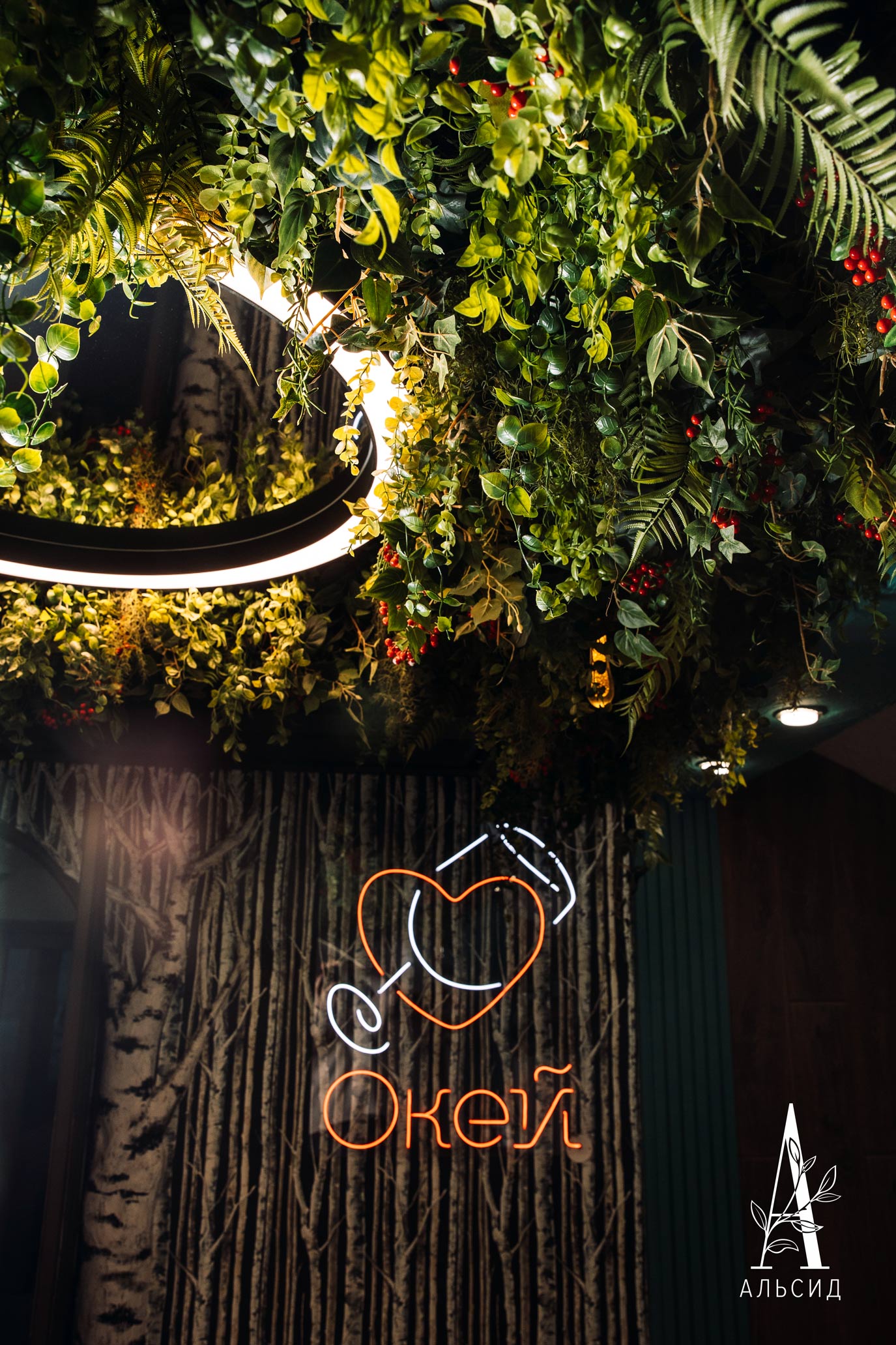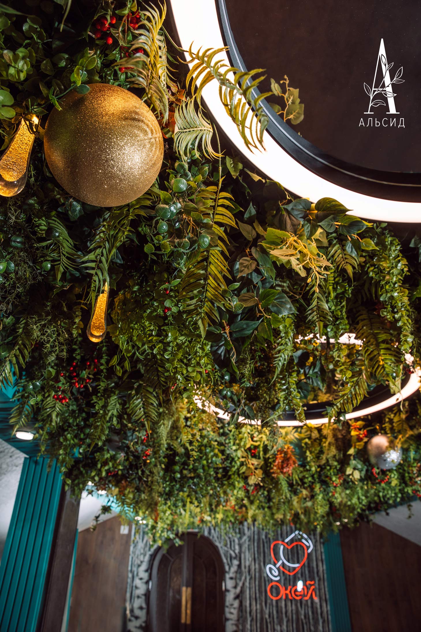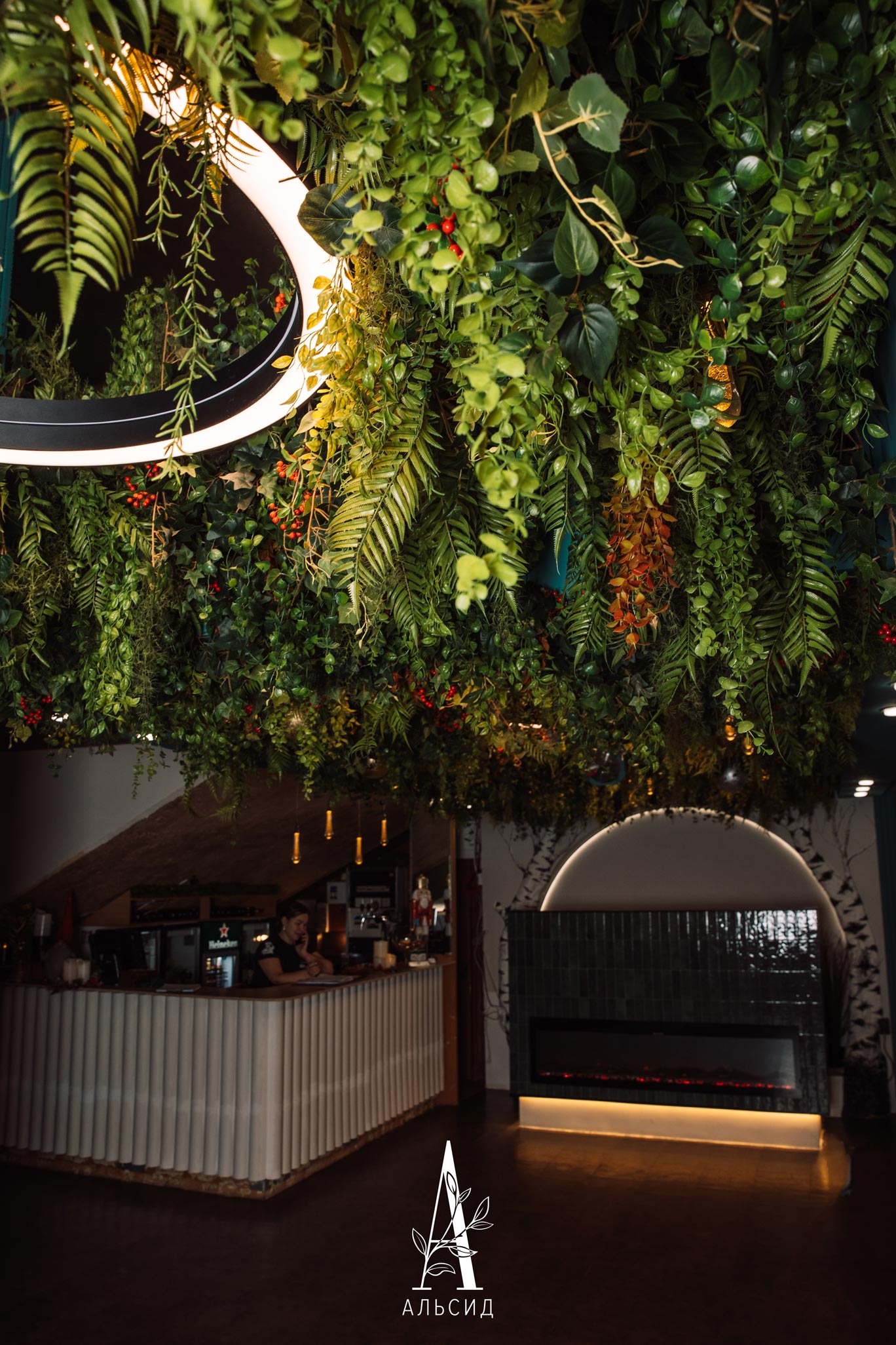 Как часто мы имеем возможность насладиться ужином на природе в окружении зелени и свисающих листьев? Наше комплексное искусственное озеленение явилось гармоничным оформлением ресторана в Карелии, где ампельные папоротники смело сочетаются с скандинавским мотивом. Ампельные растения и ягодные ветви заполнили все пространство потолка, сохраняя при этом легкость и воздушность. Фантазийное искусственное дерево в зоне гостевых столиков завершает комплексное озеленение ресторана, оставляя у посетителей незабываемые впечатления.;