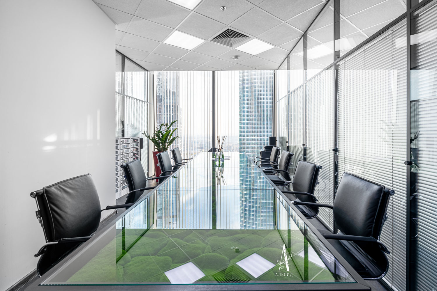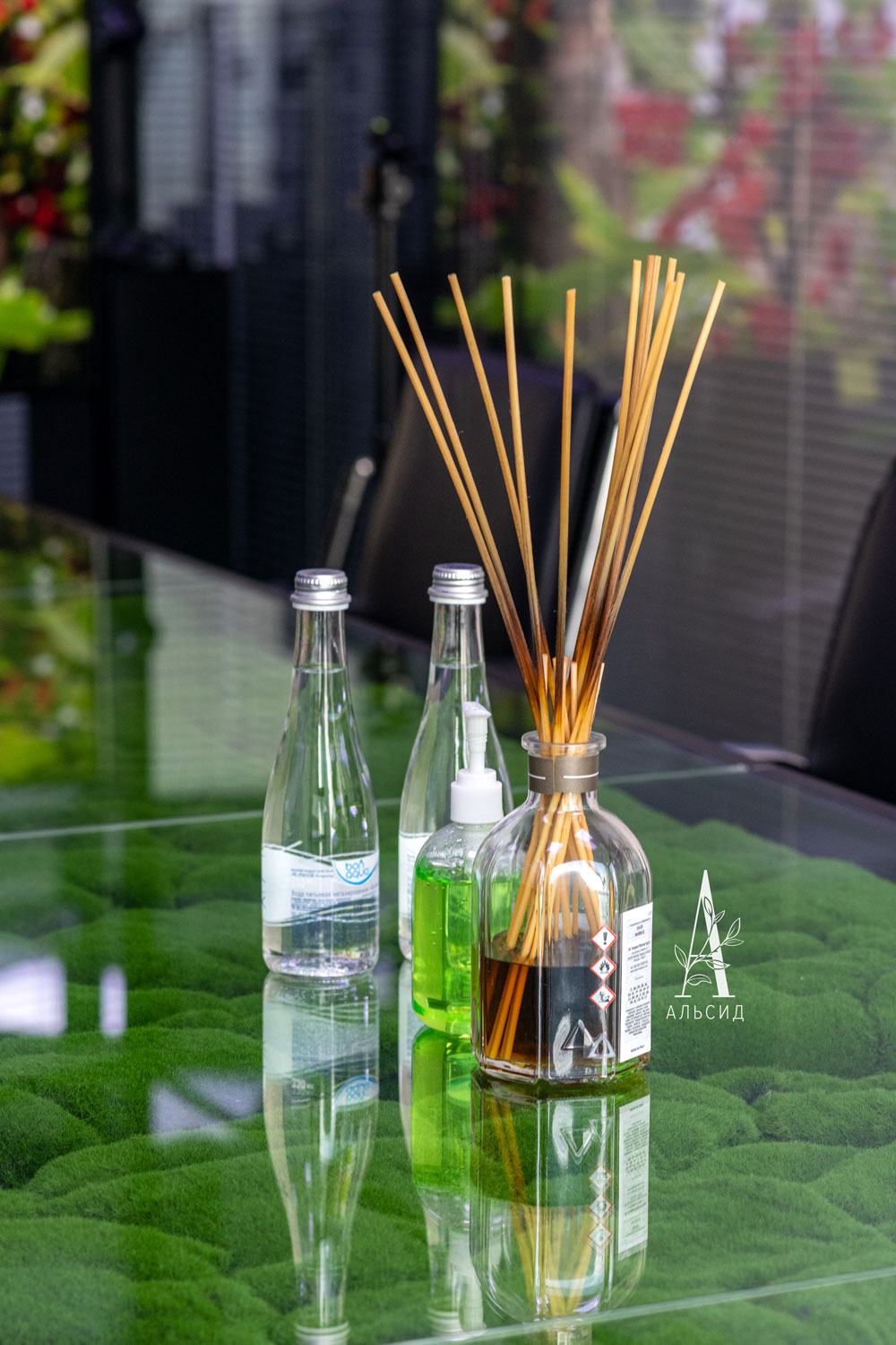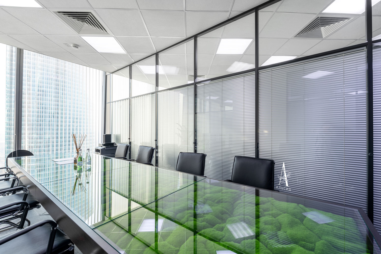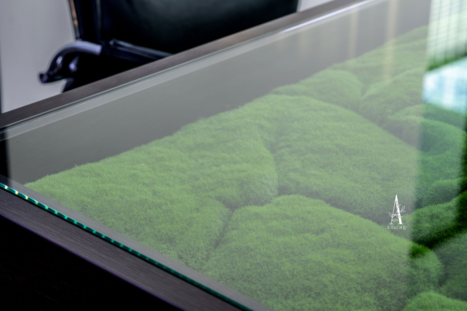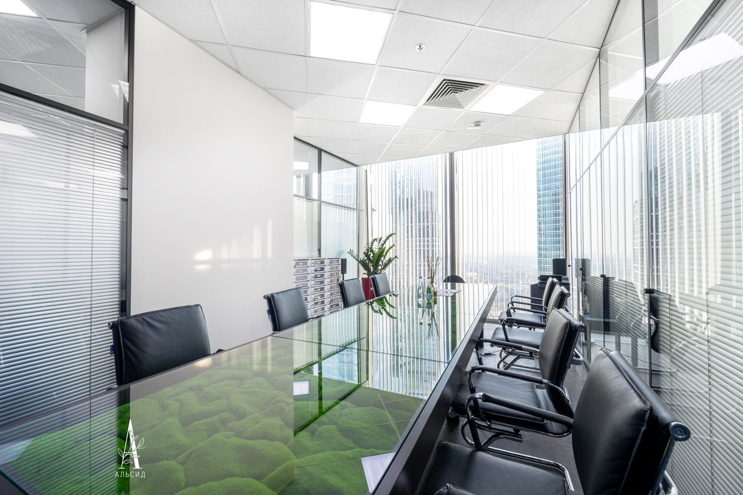 Озеленение и освещение помогают разбавить выдержанный строгий стиль в офисе. Для оформления коридоров, куда не попадает солнечный свет, лучше всего подходят искусственные растения, из которых можно сделать большие фитостены разных форм и размеров. А в переговорной стол задекорировать мшистими камнями, которые при разном освещении отражают разную глубину объема.;