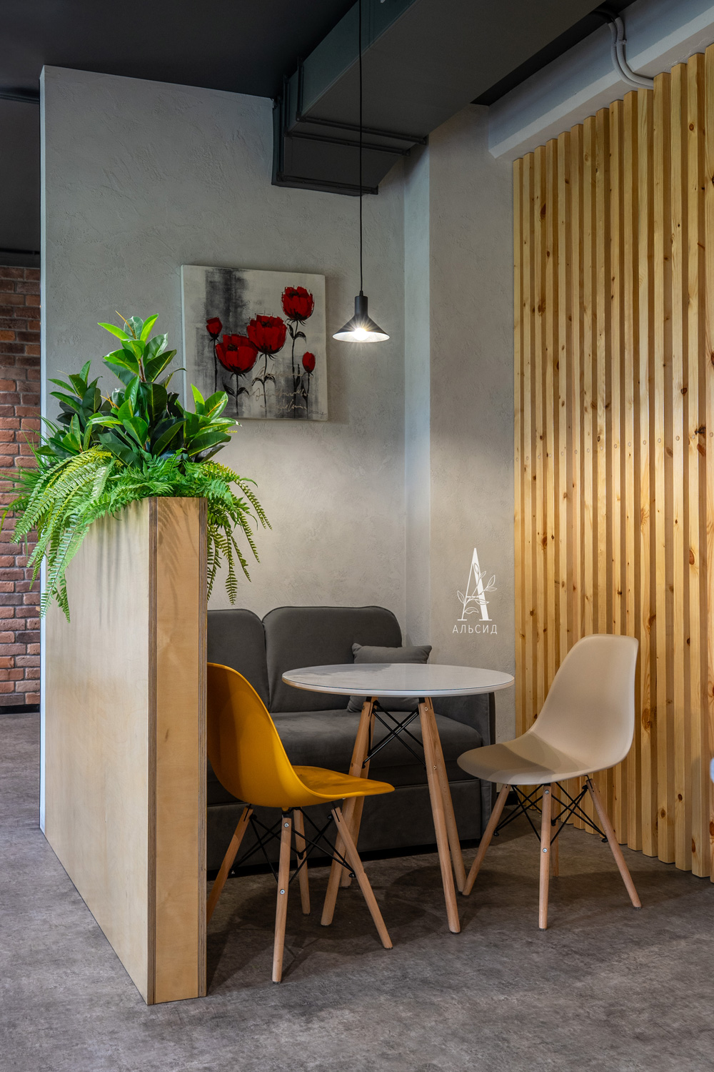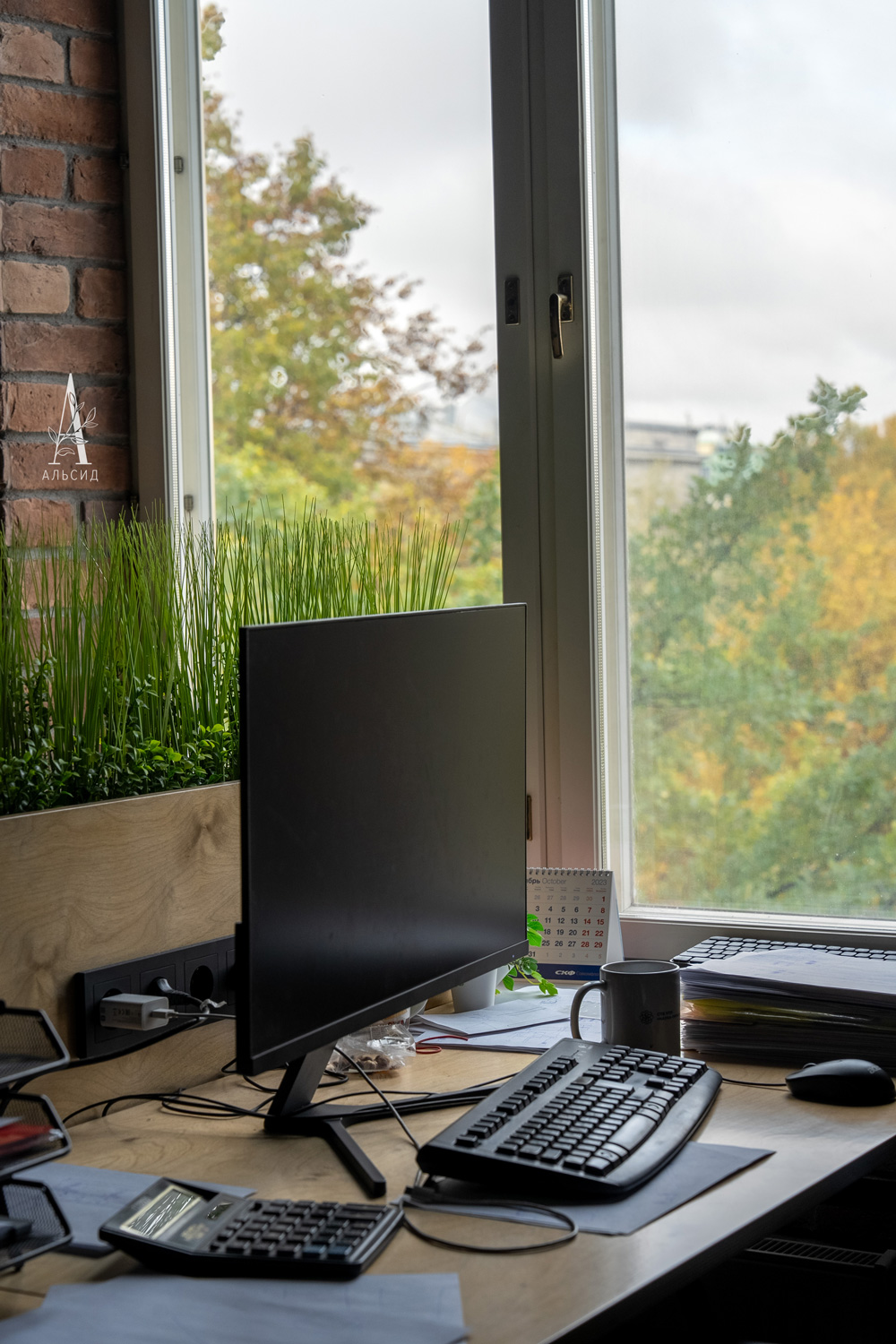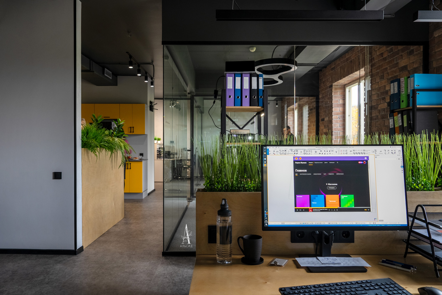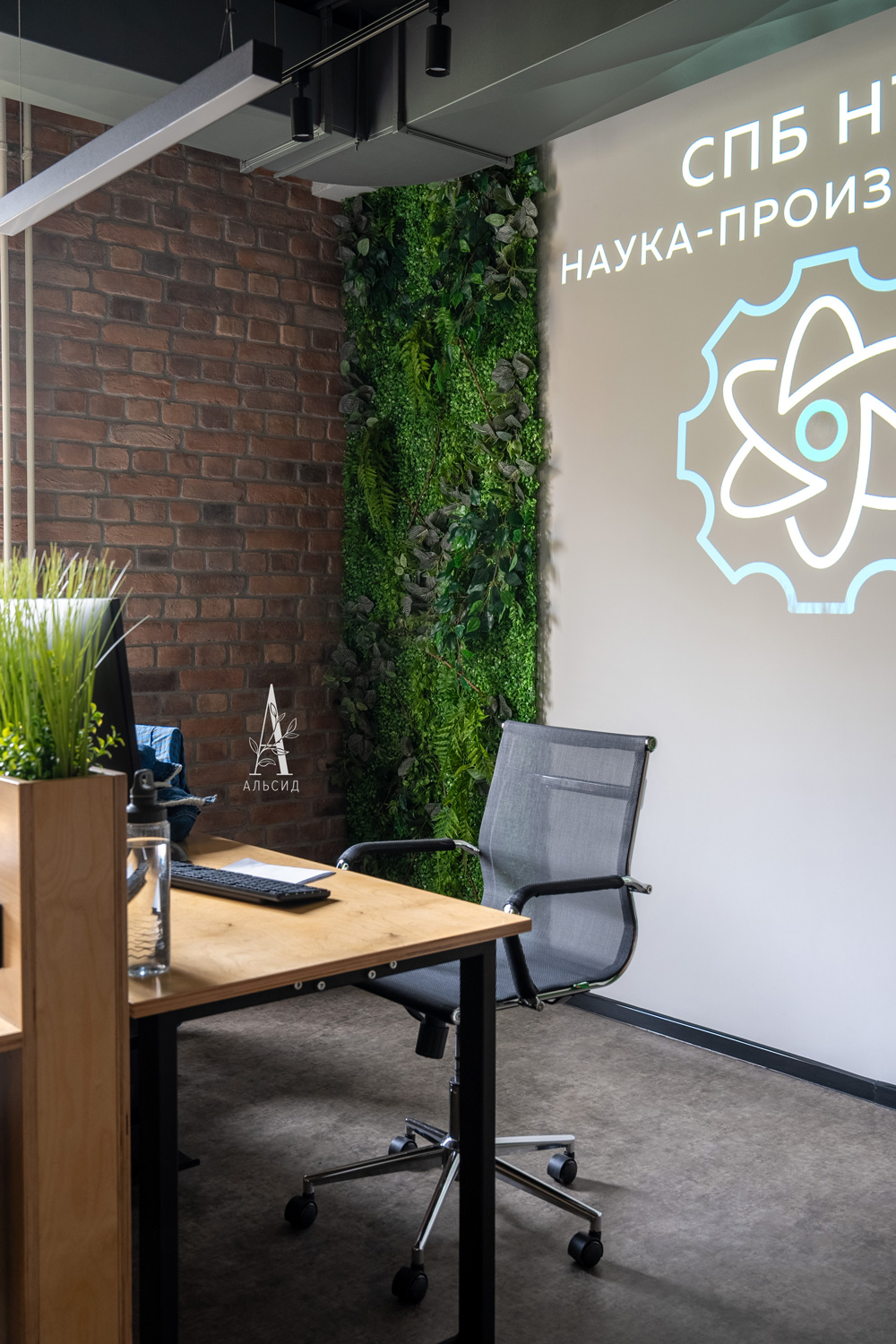 Современные офисы часто используют озеленение для создания комфортной деловой среды. Высокой травой можно не только зонировать рабочие столы, но и создать успокаивающий фон для глаз. Зону отдыха так же отделяет и украшает композиция из высоких растений. А большая белая стена оформлена фитомодулями, которые обрамляют слайды во время презентации.;