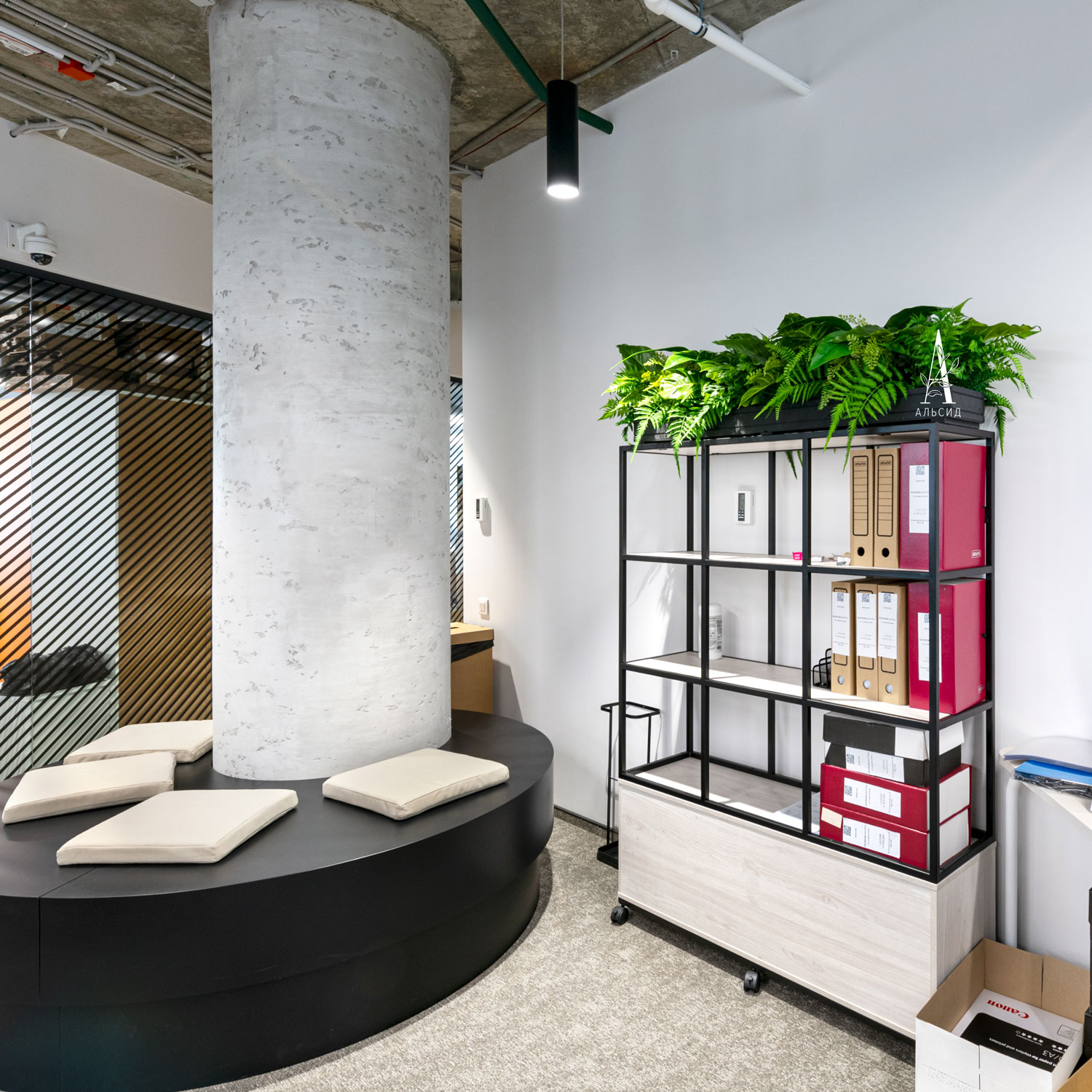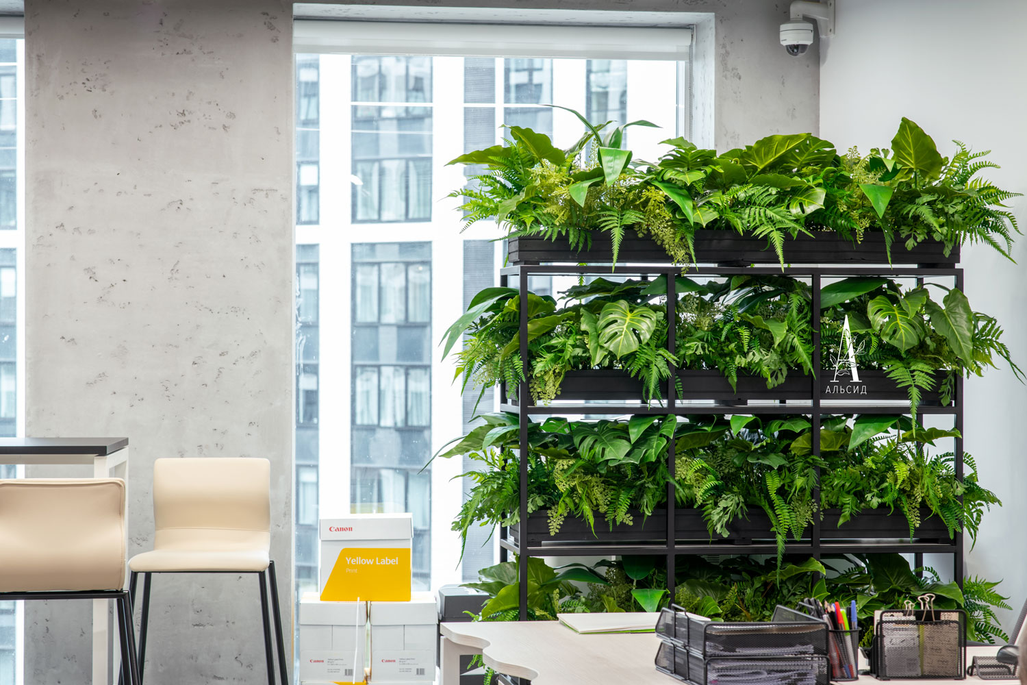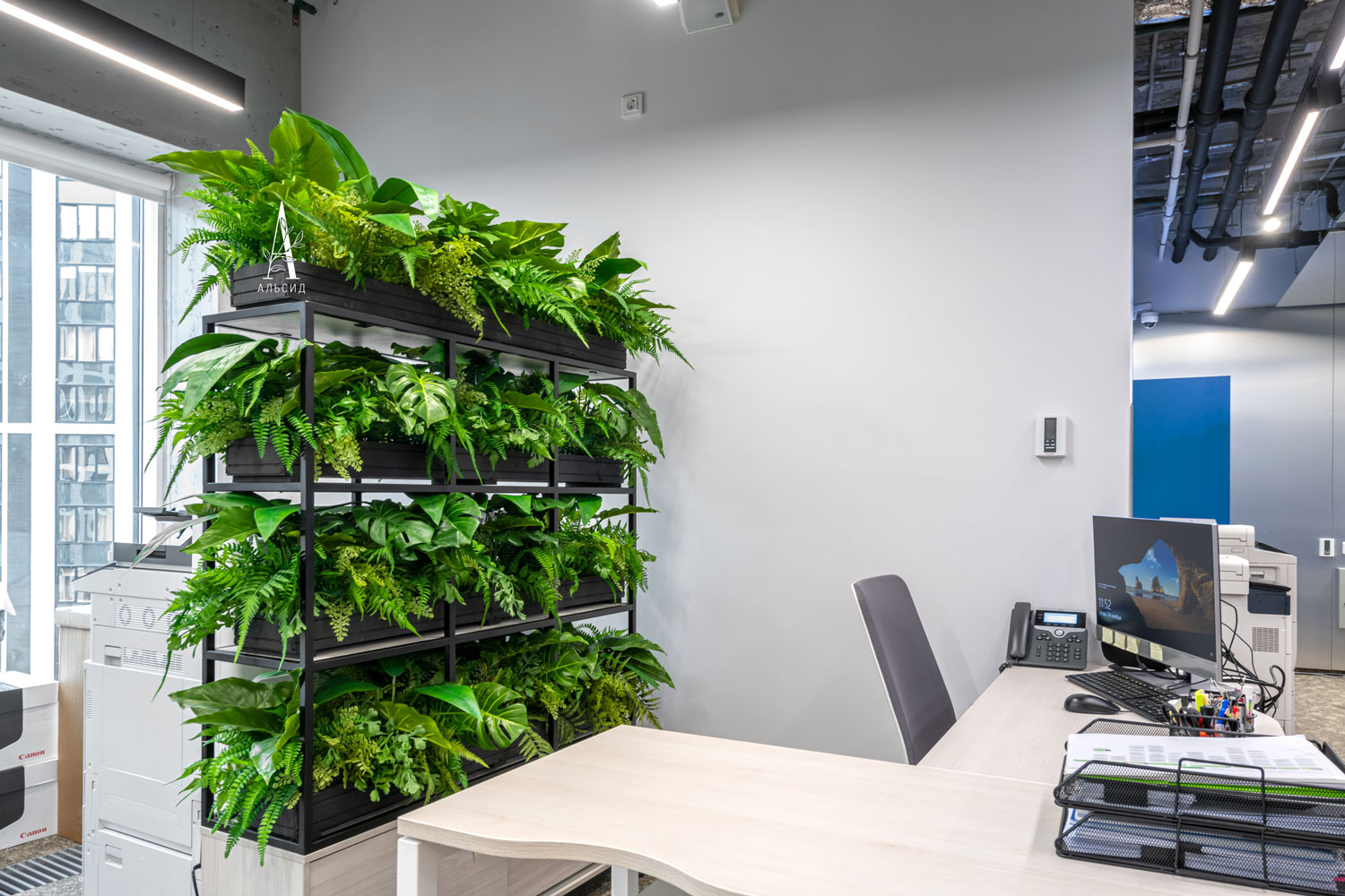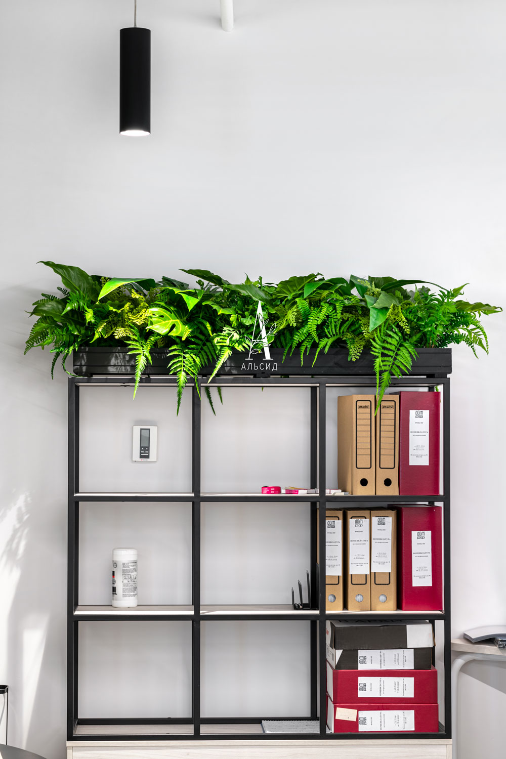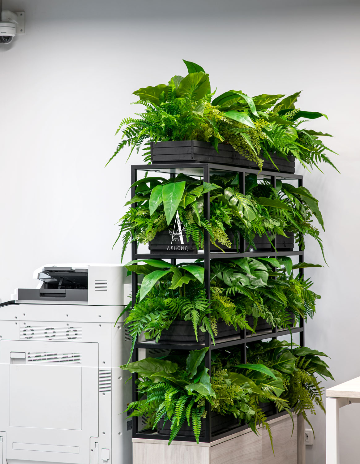 Оформление искусственными растениями офисного пространства также требовательно, как и в любом другом общественном объекте, ведь необходимо подобрать растения согласно фирменной концепции. Строгий выдержаный стиль офиса подчеркивают композиции из зеленых растений в черном деревянном ящике, специально изготовленном для проекта. Композиции можно использовать как в качестве перегородки для отделения зоны принтера, так и для украшения стеллажей. ;