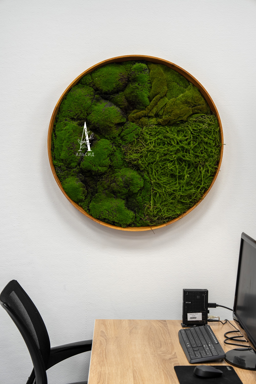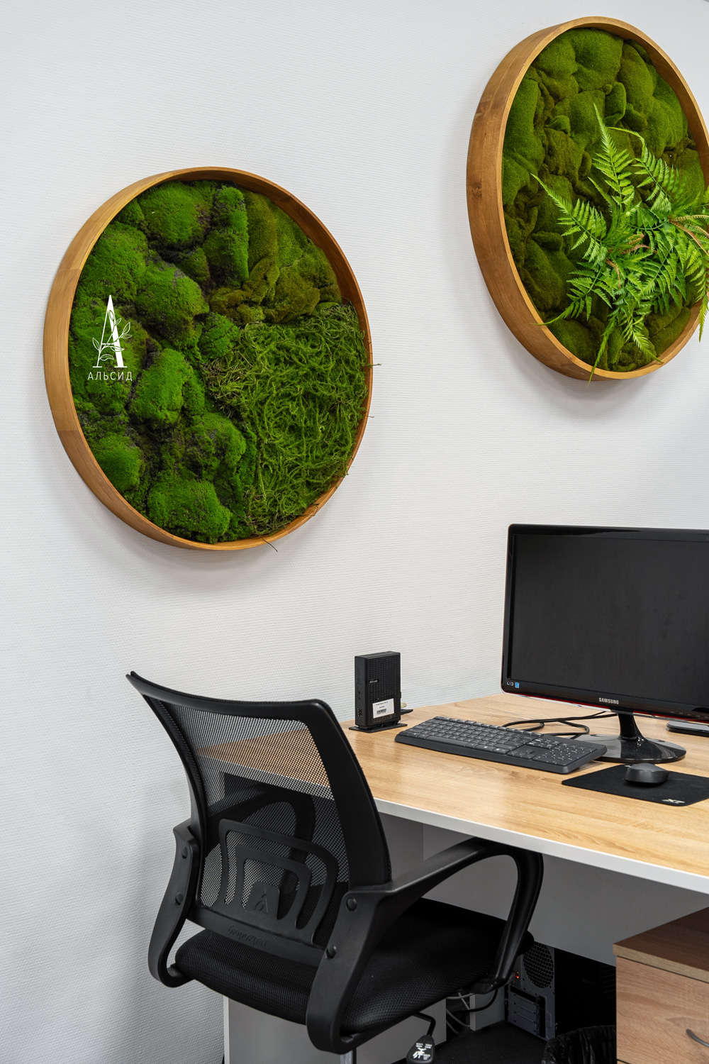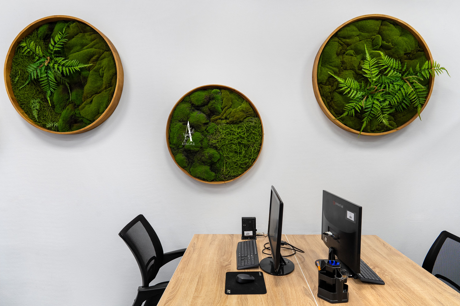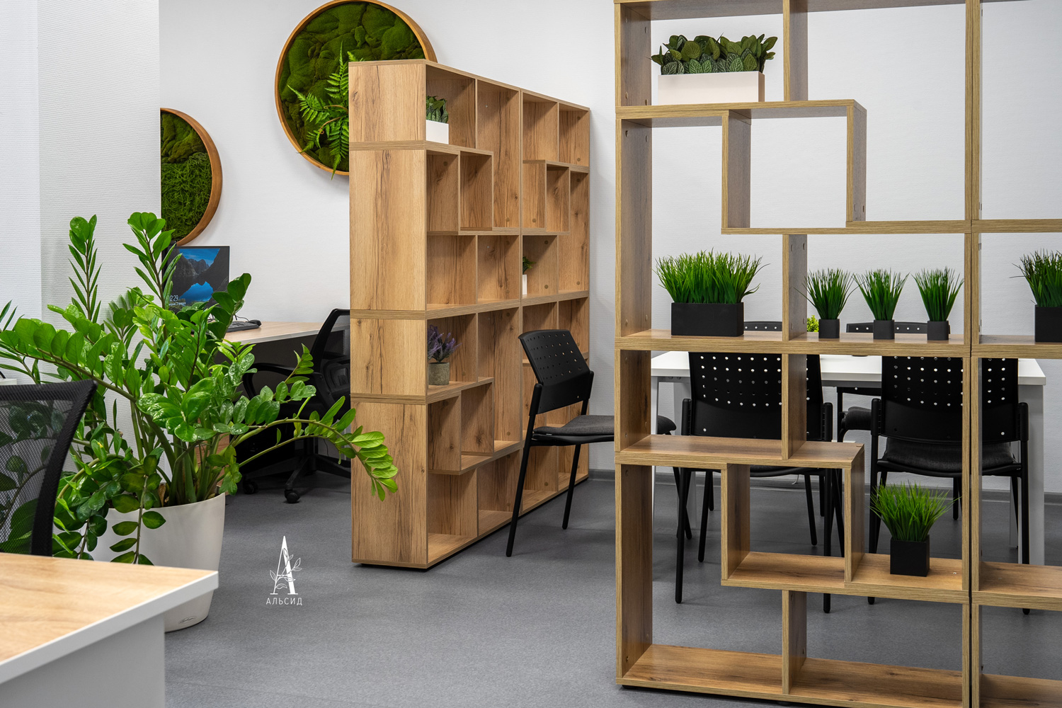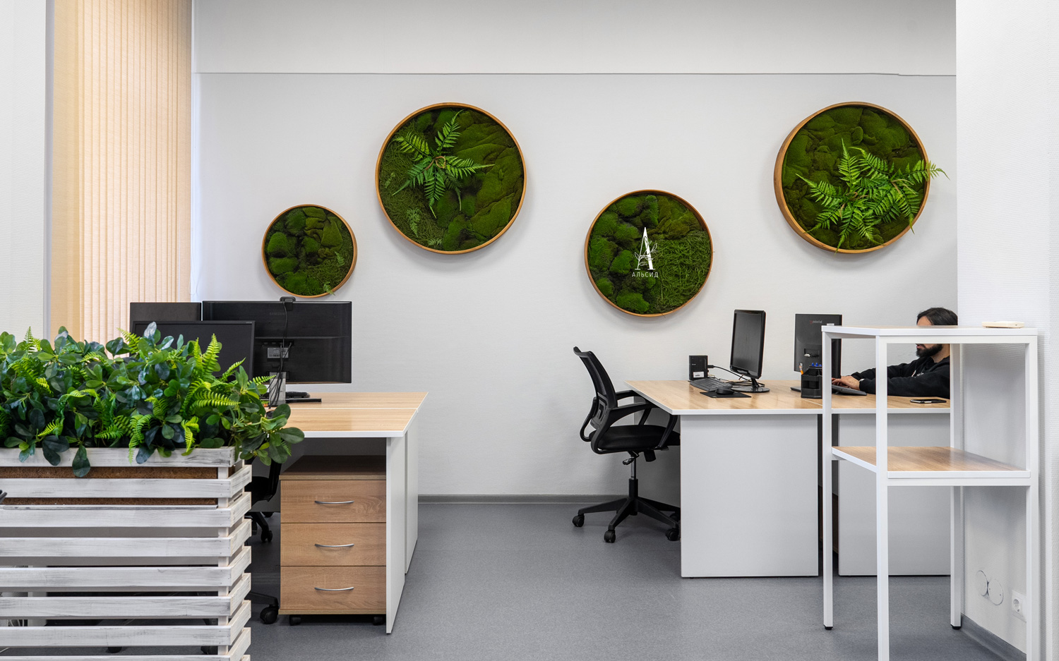 В современных офисах нередко используют искусственные растения как декор, комбринируя его с живыми растениями. Выполненное на заказ настенное панно из круглых рам дает визуальный эффект сглаживания острых углов, которыми наполнено пространство. Композициия с шеффлерой в высоком ящике помогает зонировать рабочие места.;
