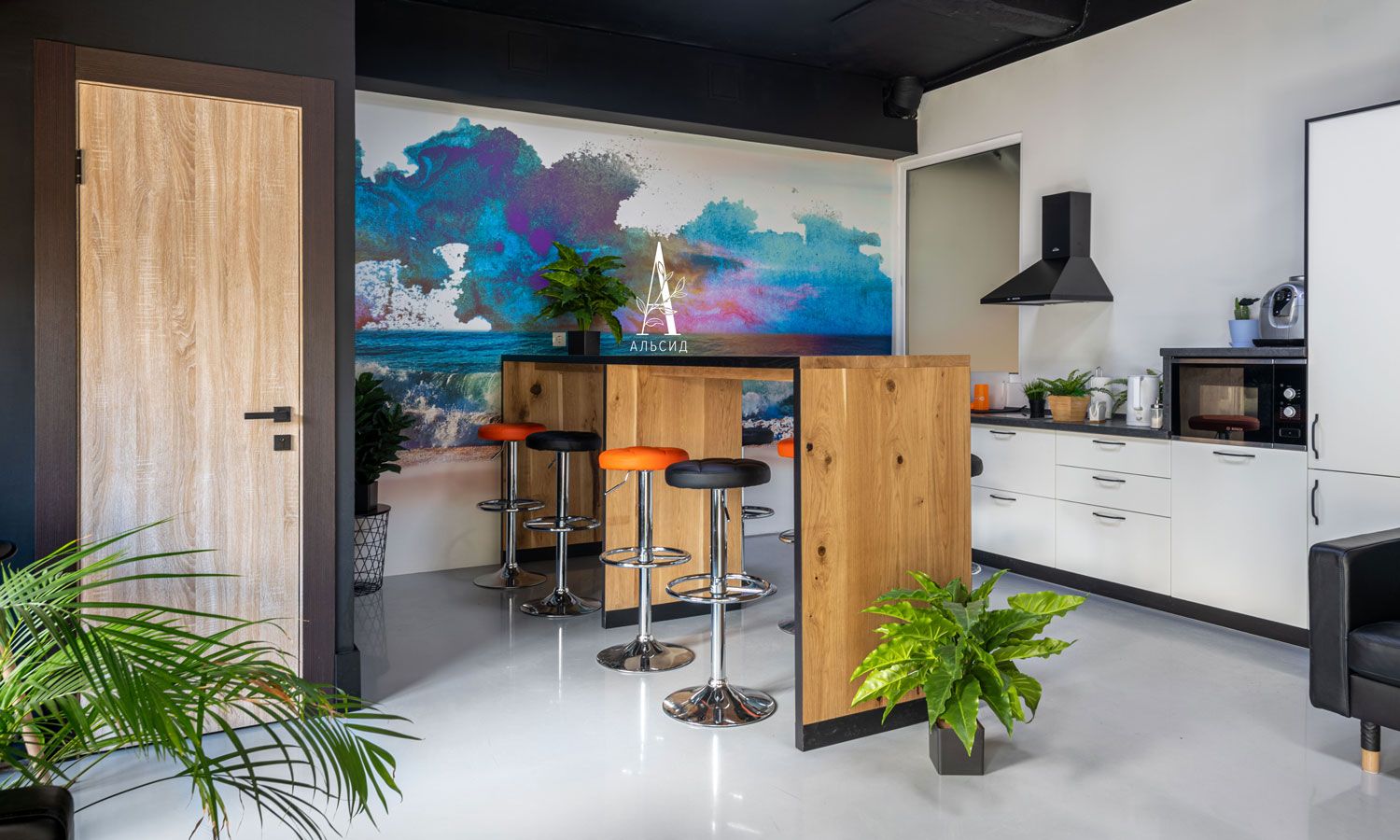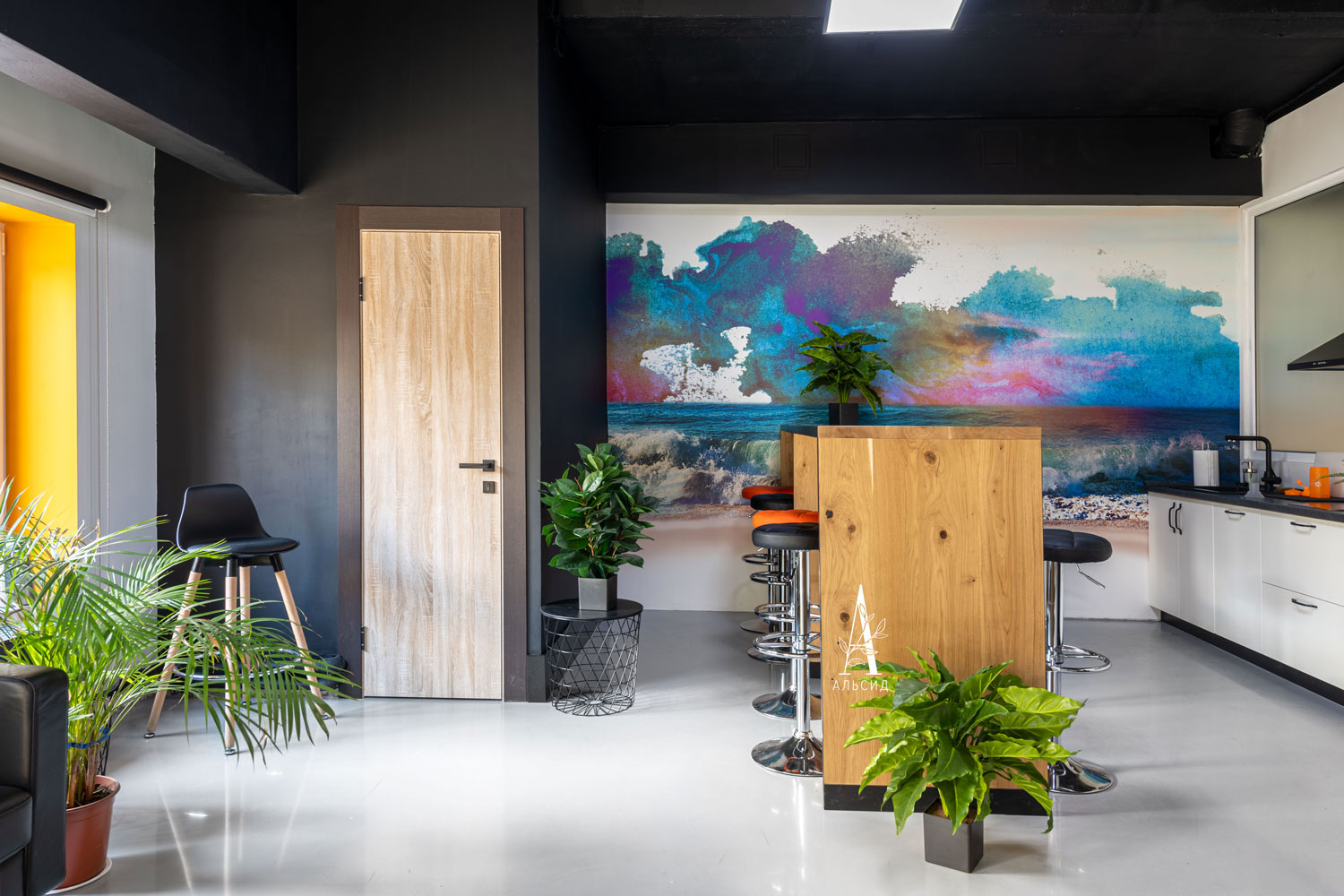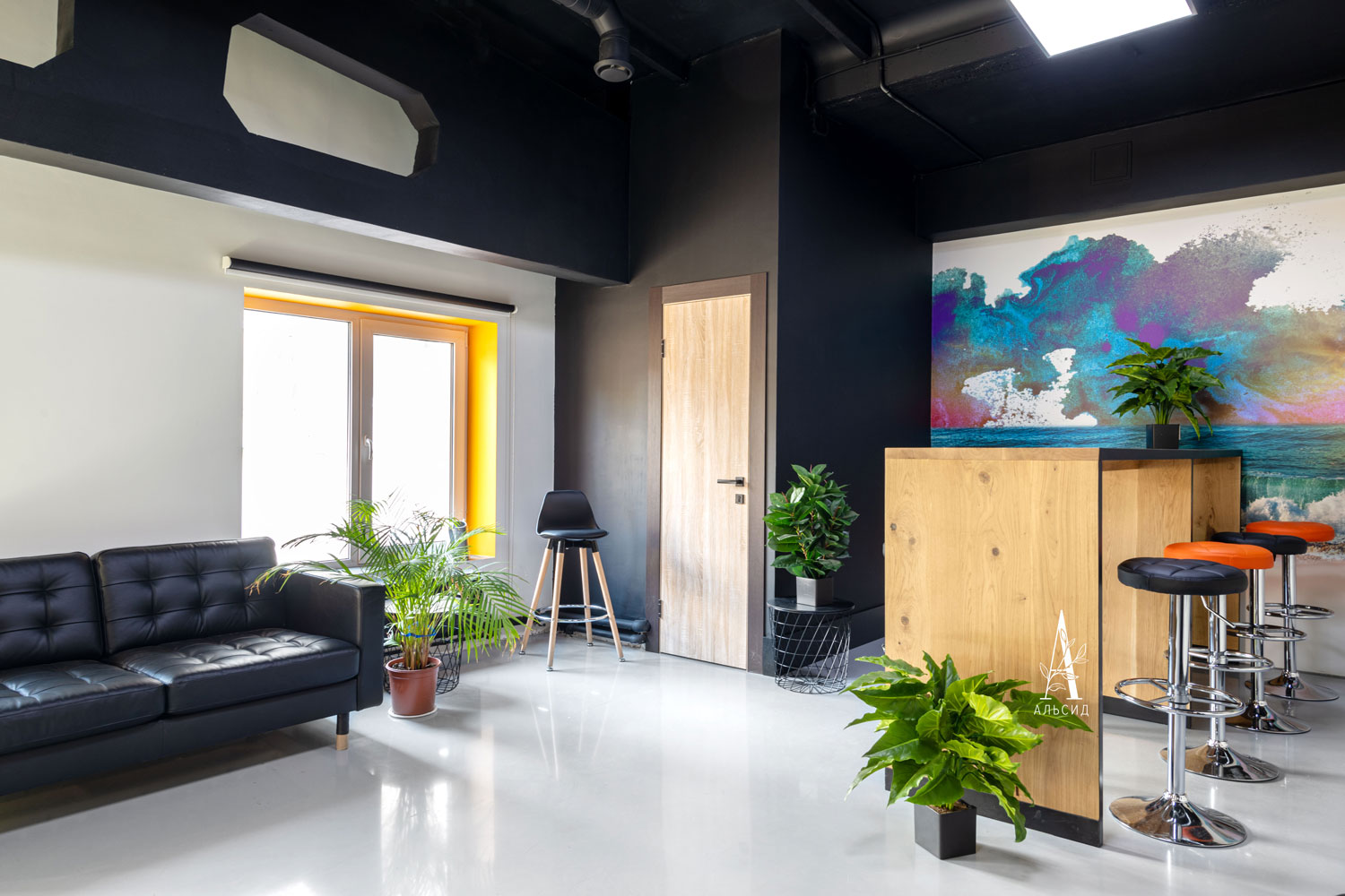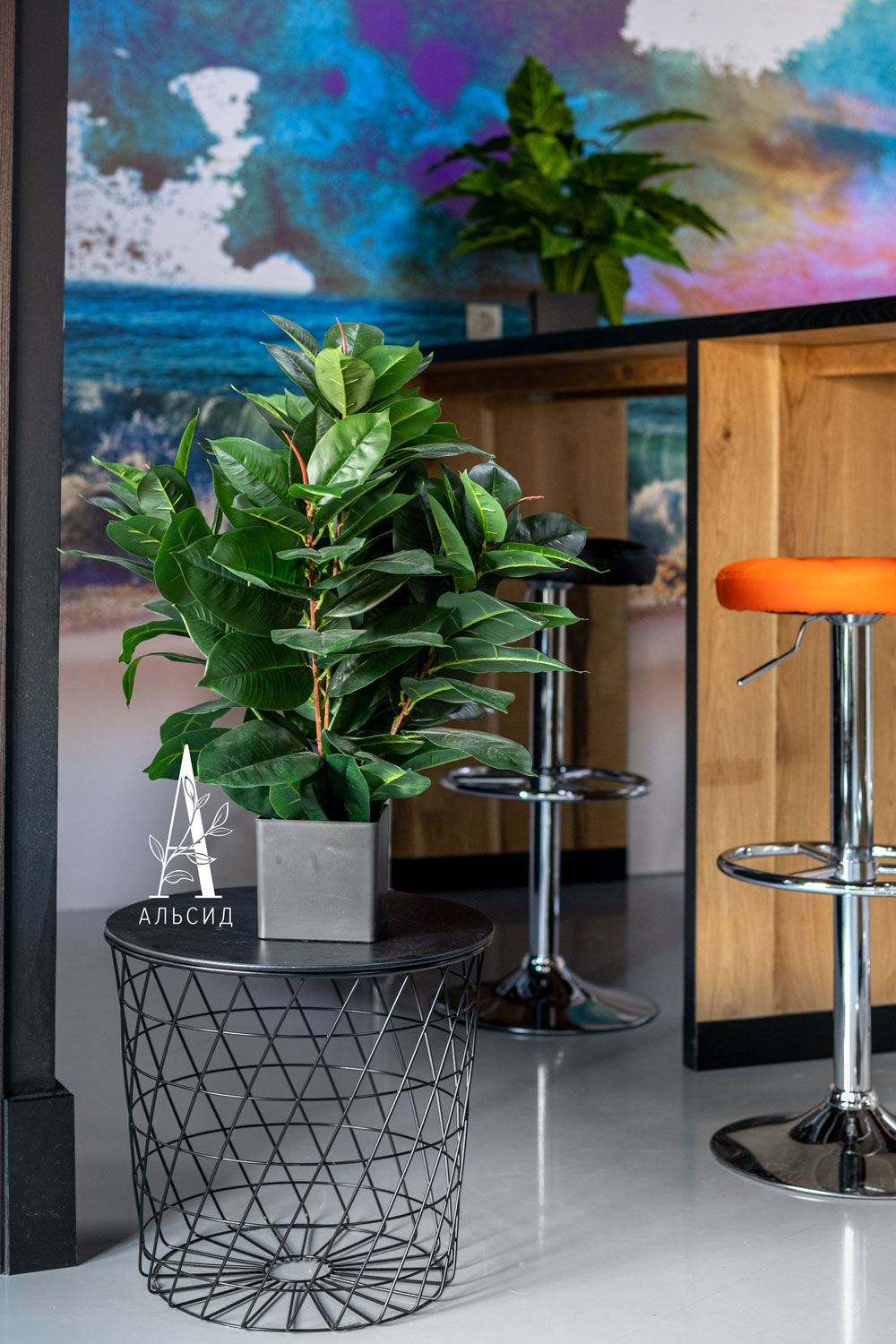 При создании рабочего пространства в последнее время компании все больше уделяют внимание комфорту и эстетике. Тенденция озеленения укрепляется и дает множество вариаций для оформления помещений. Озеленение можно использовать как искусственное, так и смешаное: живые растения поставить у окна, а искусственные (например, фикус эластика и калладиум) расставить в любом другом месте. Переговорный кабинет украшен монстерой и напольным фикусом, а холл - фитостеной, замиокулькасом и фикусом Бенджамина. Также интересное решение использовано в уборной комнате: стрелиция не боится воды и может стоять рядом с раковинами. ;