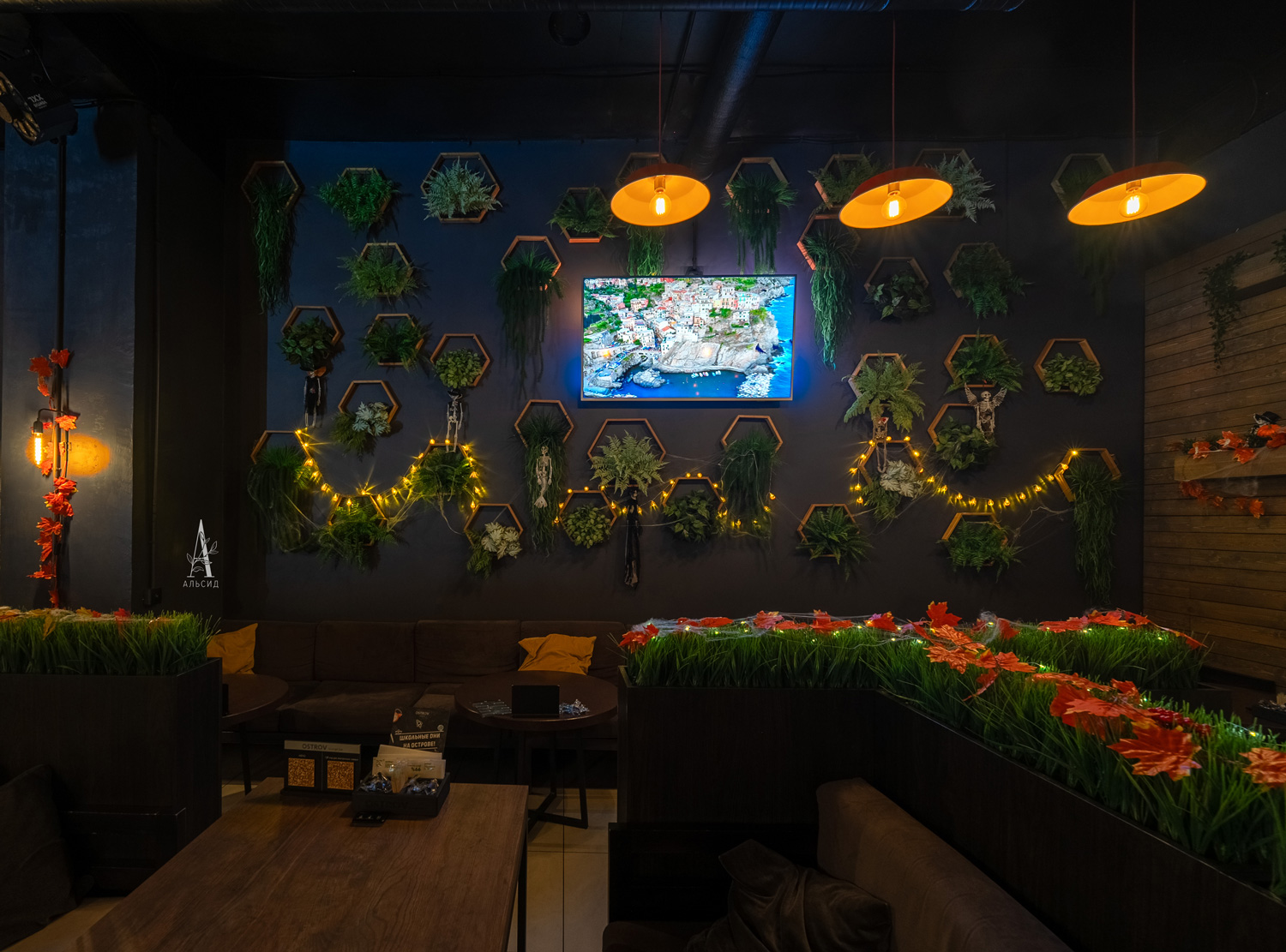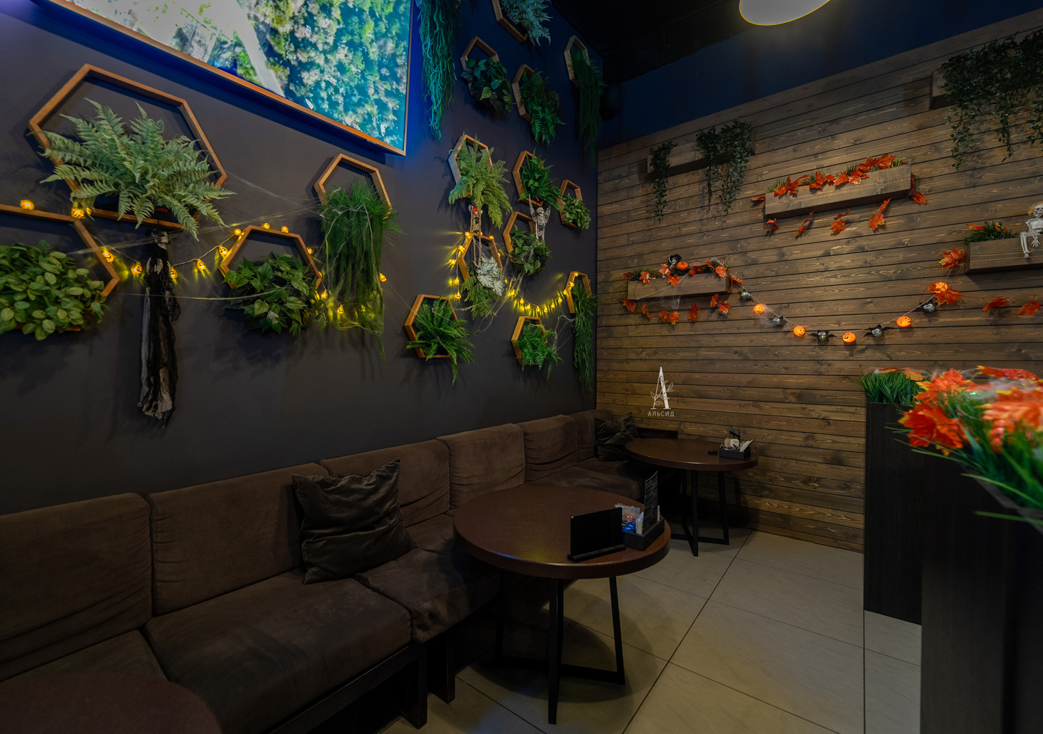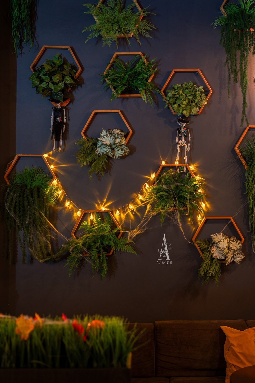 Только искусственные растения смогут выдержать темноту и дым, поэтому они идеально подходят для оформления кальянных. Для украшения стены бара была использована большая композиция из одиночных сот из светлого дерева с разными видами растений, чтобы добавить контраст темному интерьеру. ;