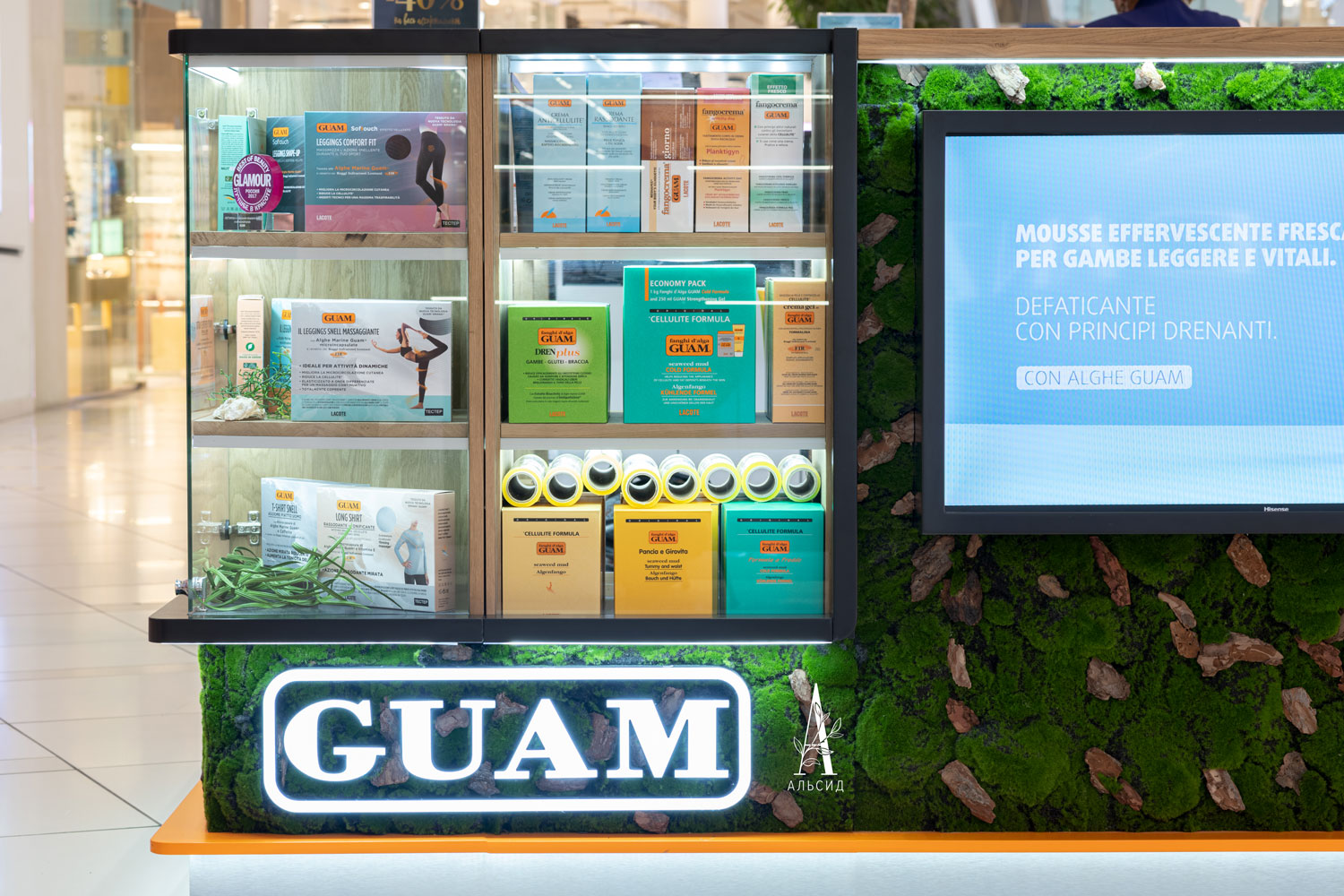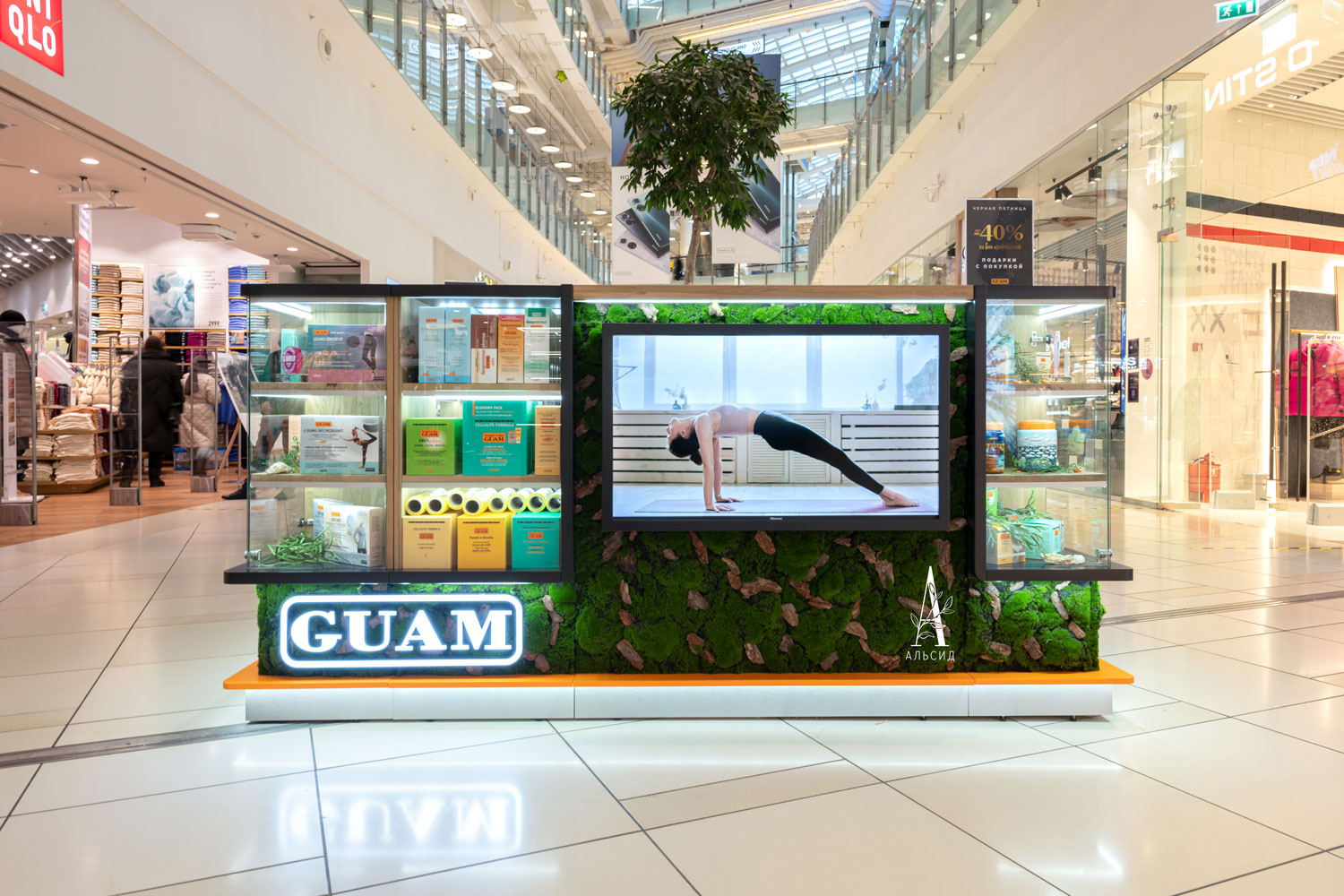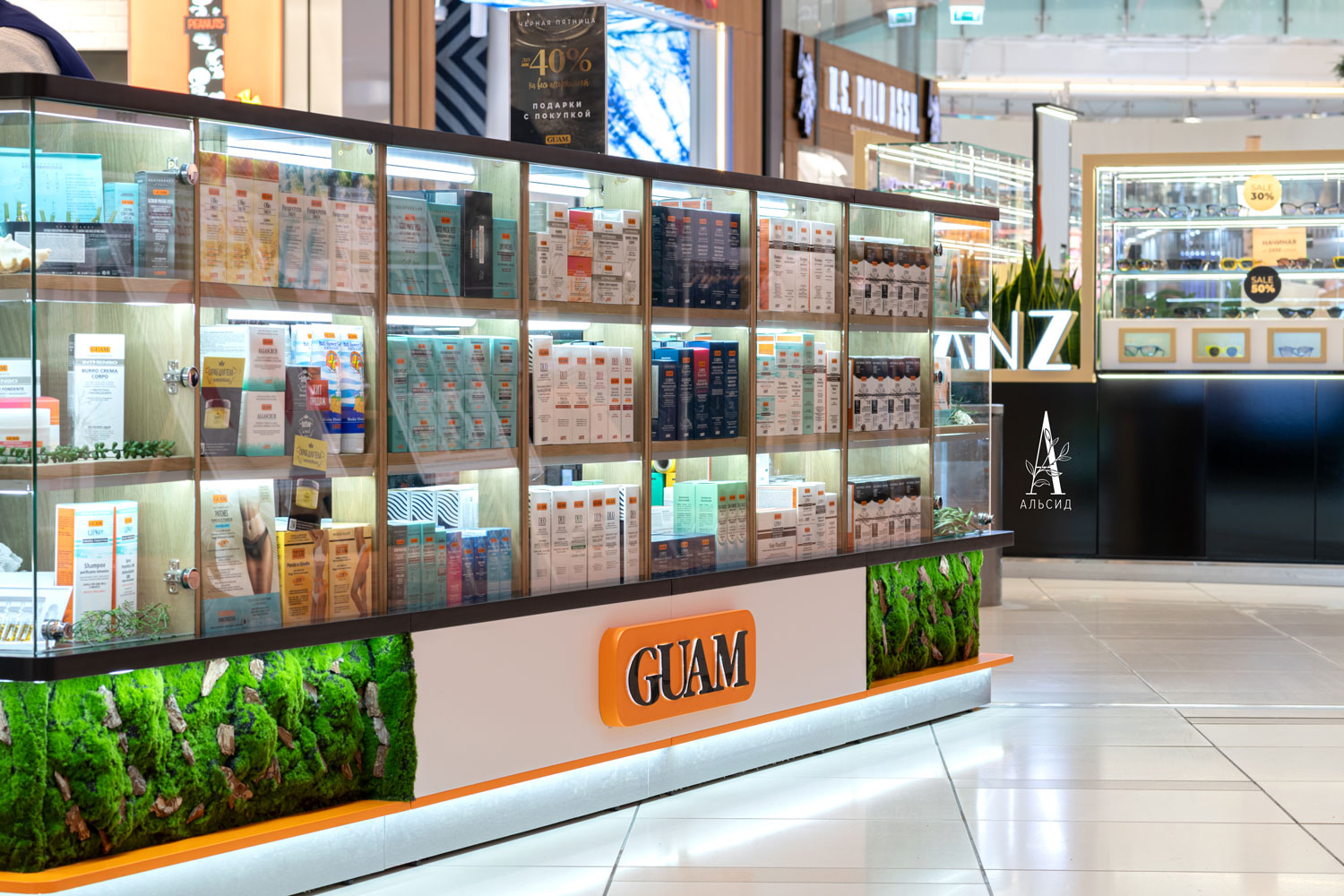 Запросы по оформлению искусственными растениями коммерческих объектов расширяются, и наши дизайнеры могут разработать проект даже по озелению острова в торговом центре. Для Guam идеально подошло обрамление искусственным мхом с натуральной корой по всему периметру островка. ;