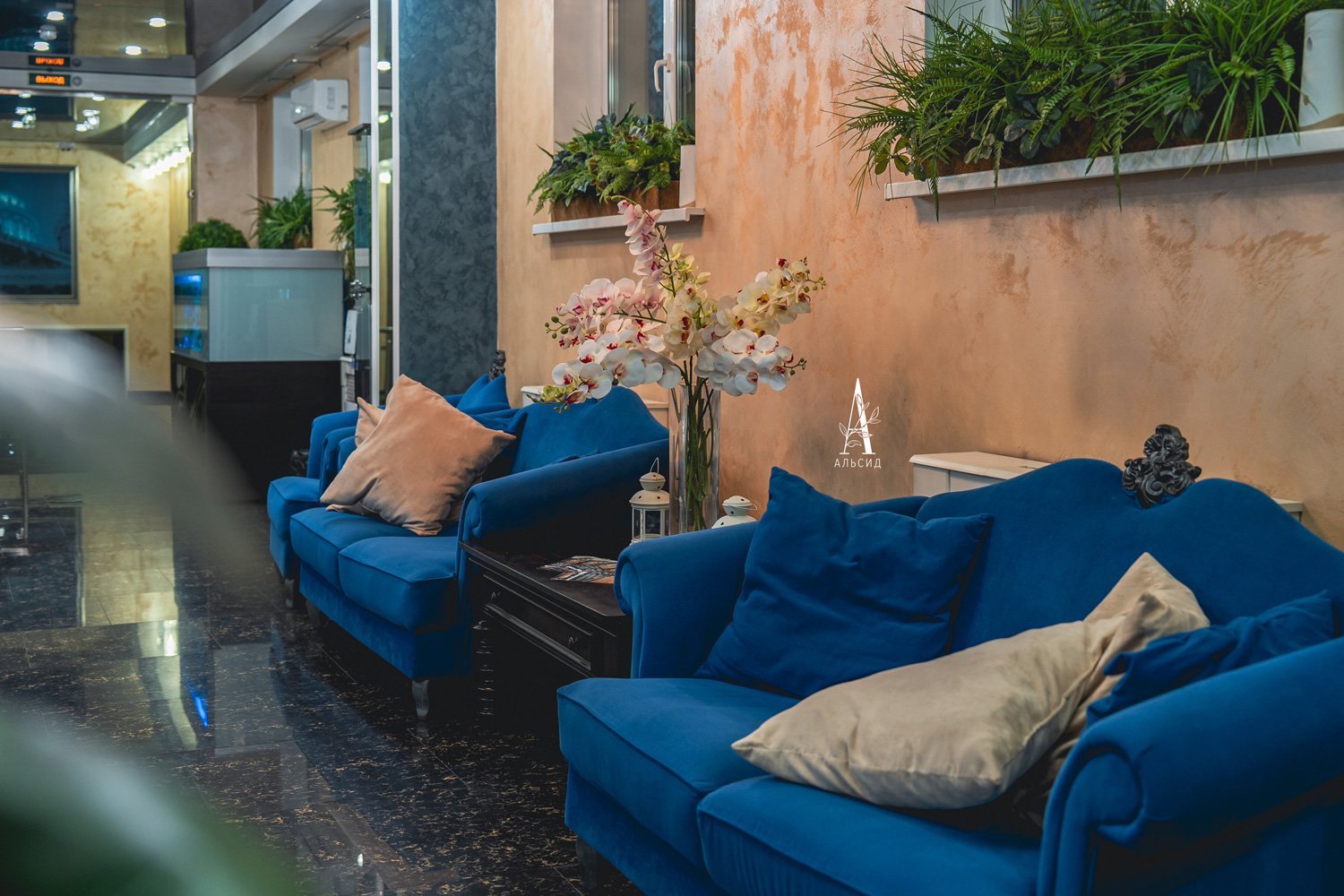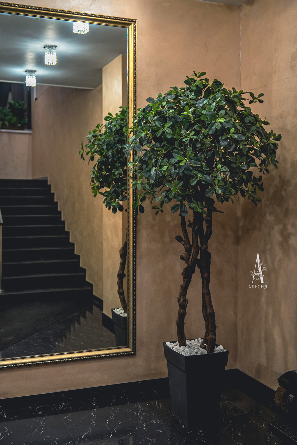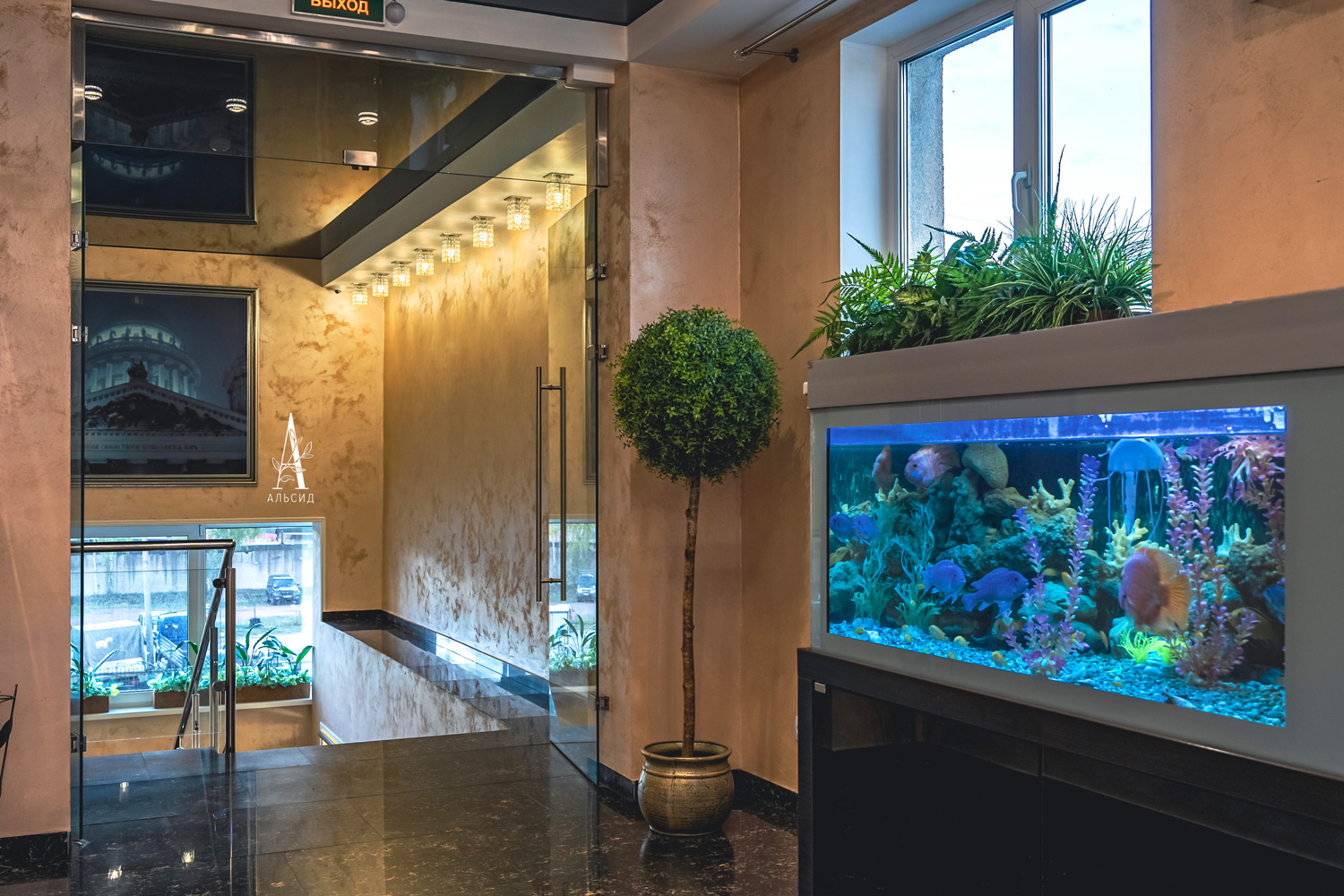 Интерьер отелей уже сложно представить без растений: тропические композиции в боксах из натурального материала (папоротник с шеффлерой, зеленый микс, микс со сциндапсусом, сциндапсус, микс с ампельными растениями, отлично заполняют и освежают небольшие подоконники. На входе встречают высокая шеффлера и самшит, а ресепшн украшают орхидеи и фикус Эластика.;