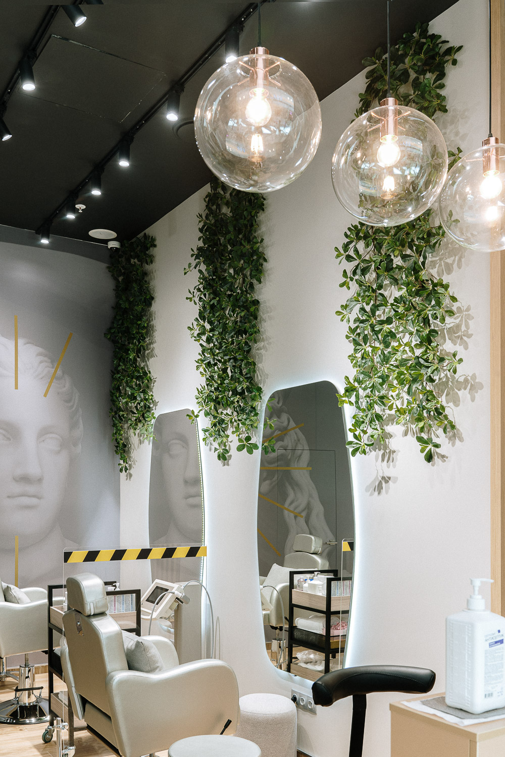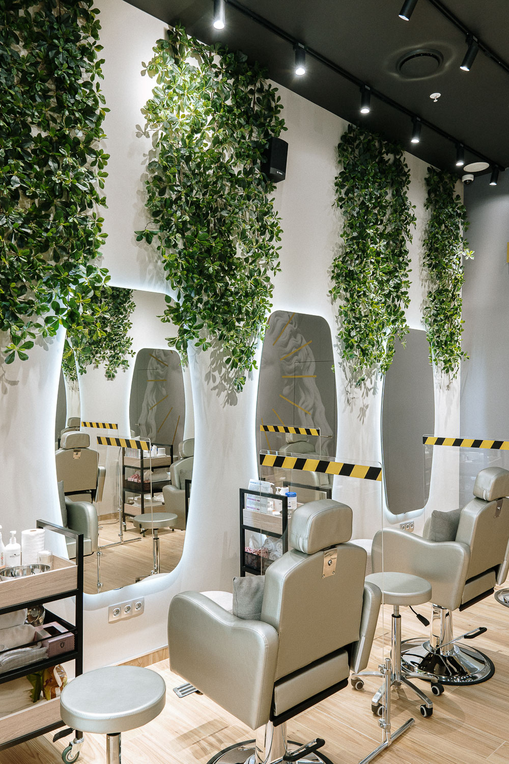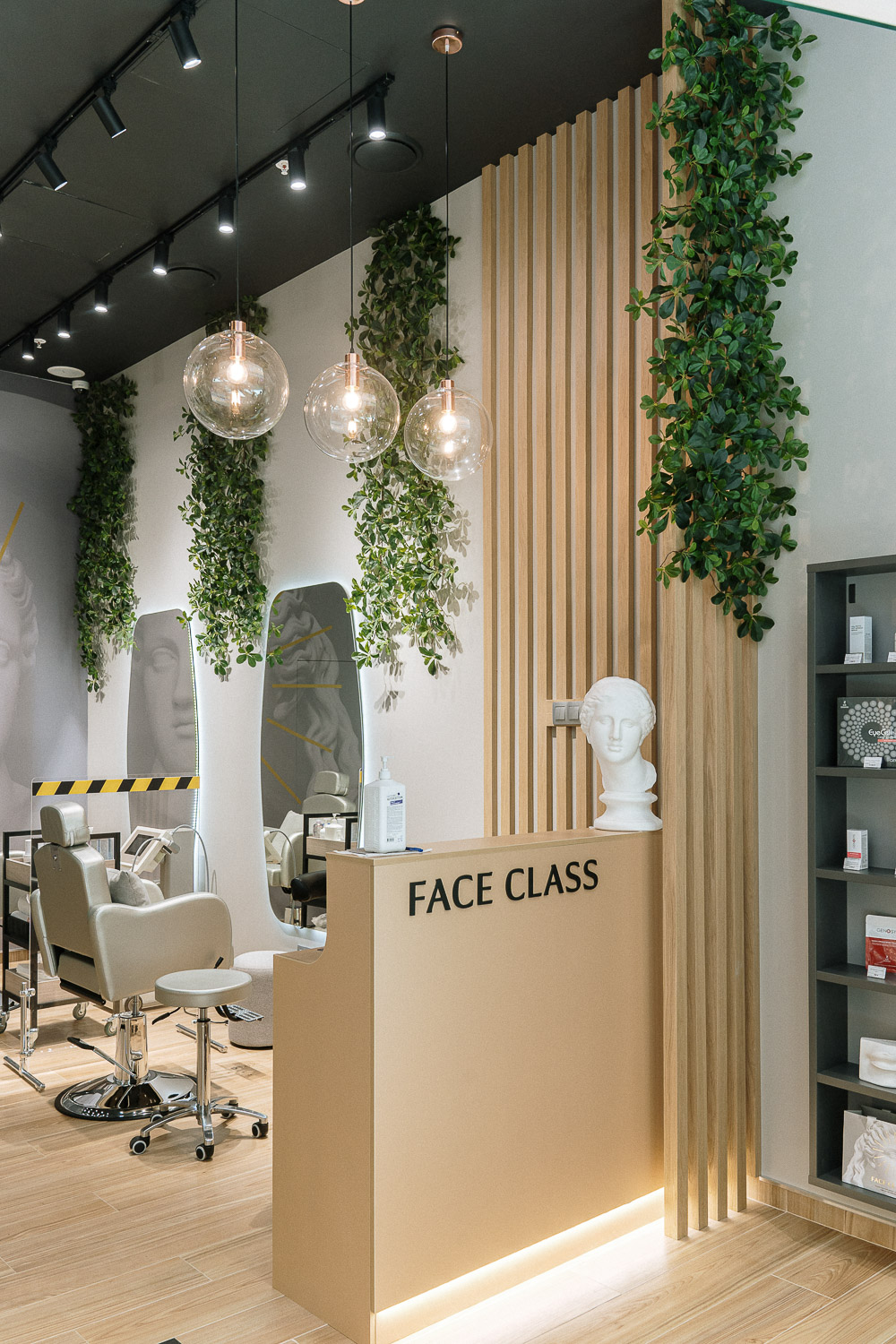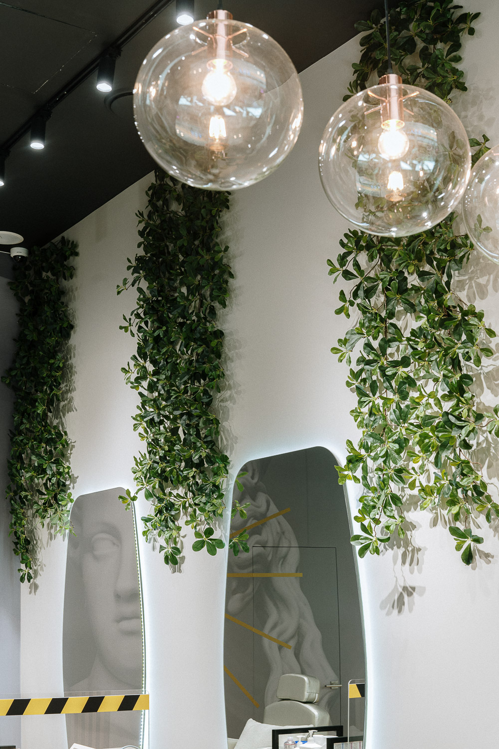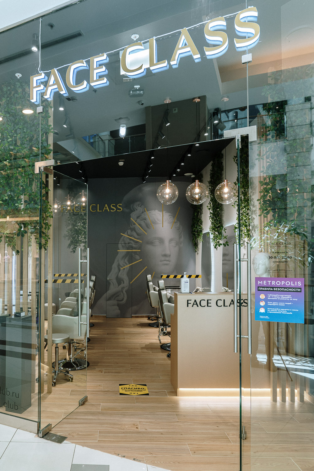 Озеленение салона лифтинг массажа лица Face Class.; Для такого стильного интерьера мы остановились на плетистых ветвях шеффлеры, спускающихся с потолка. Такое решение визуально заполняет пространство с высокими потолками, делает его намного уютнее.