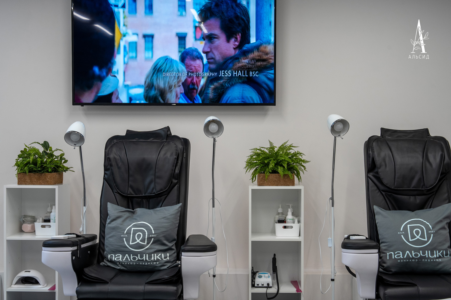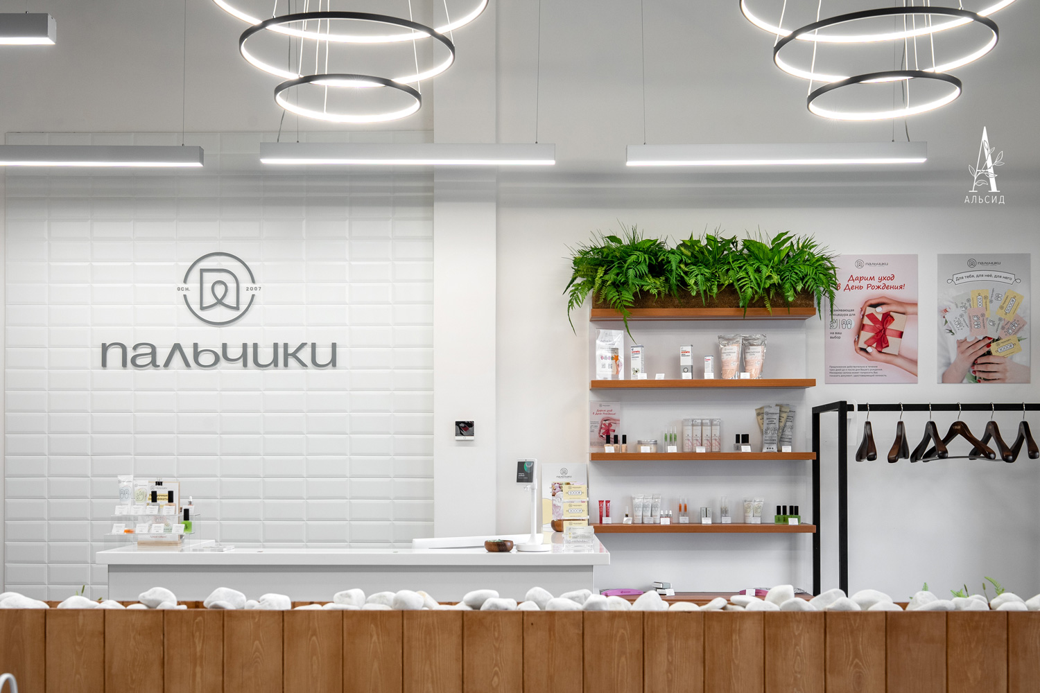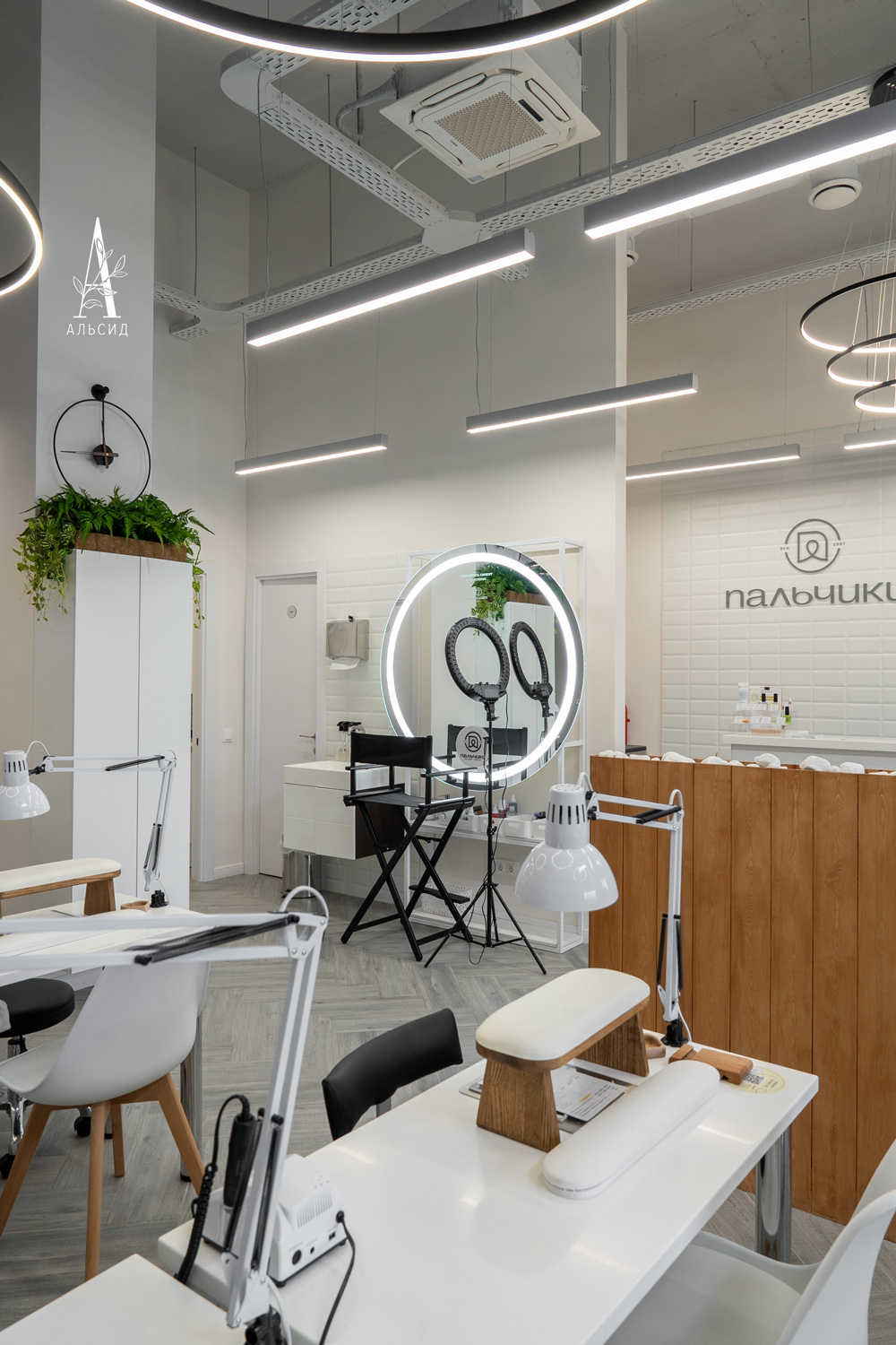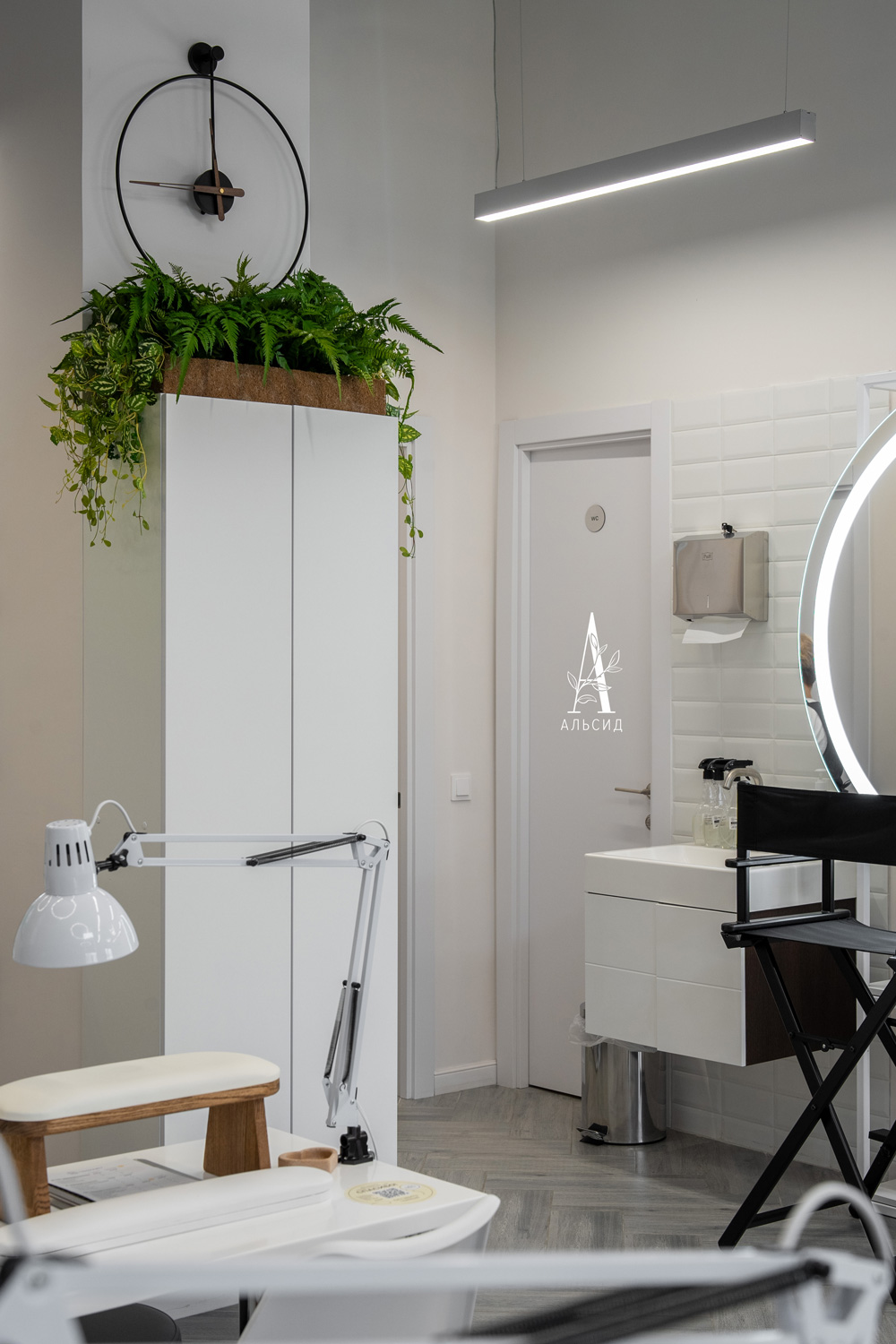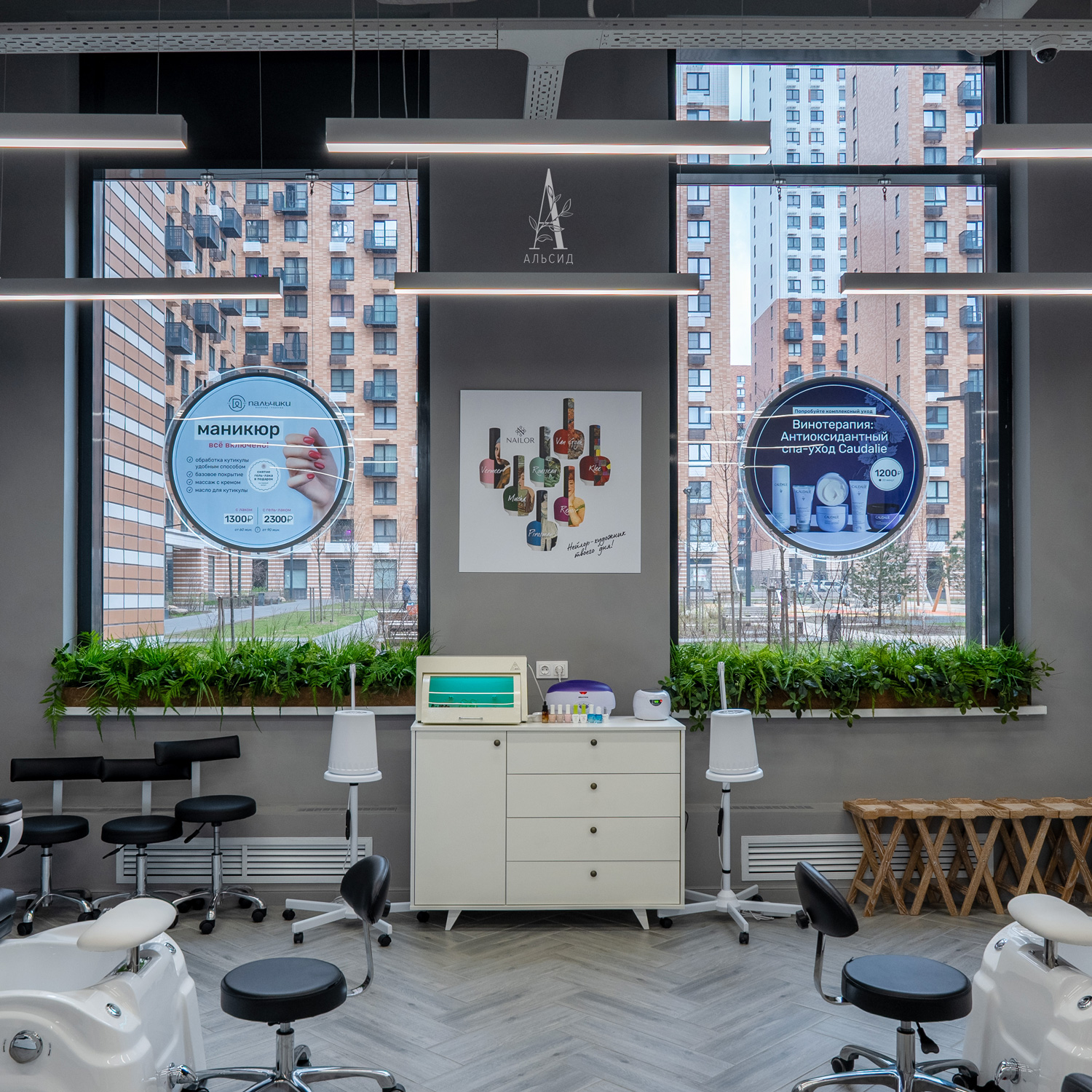В салоне красоты на фоне светлого интерьера расставлены зеленые акценты по всем залам: композиция с суккулентами в зоне ресепшн, боксы с папоротником украшают верхнее пространство, а на подоконниках расположились миксы с разной зеленью. Также отдельными островками у рабочих мест стоят нефролепсис и папоротник с шеффлерой. ;
