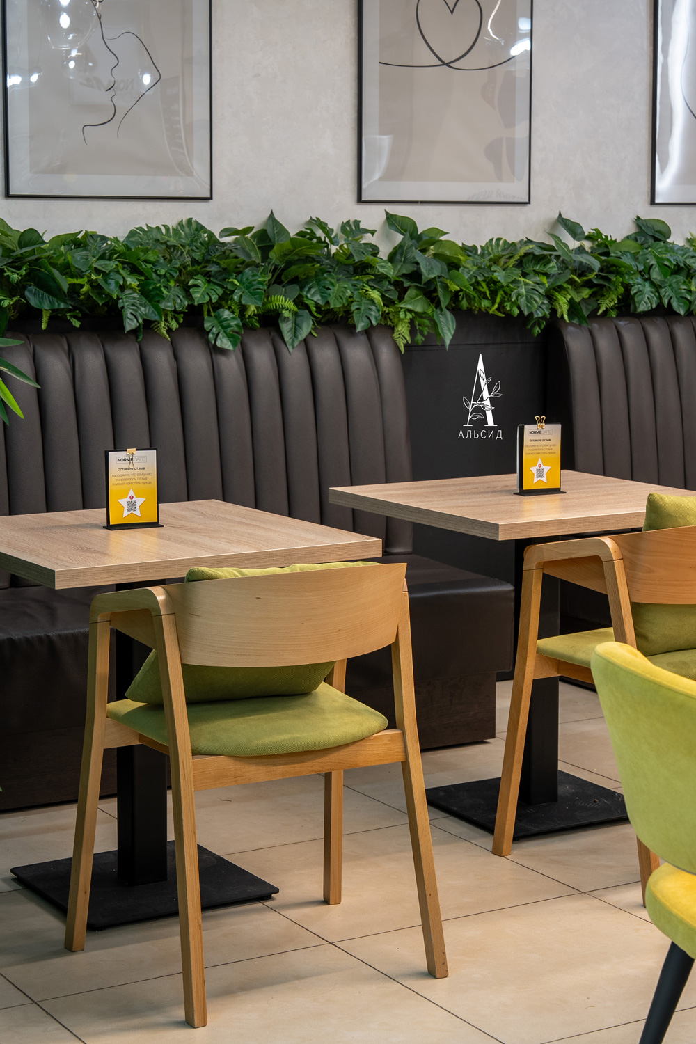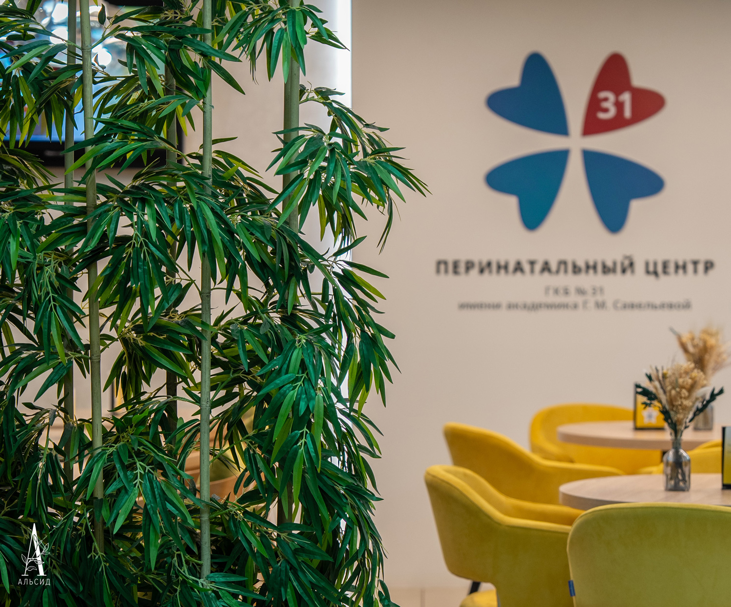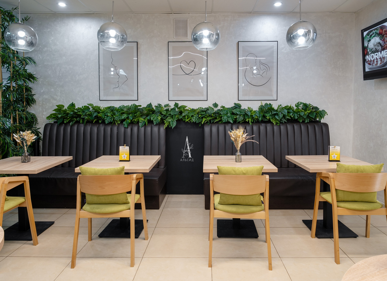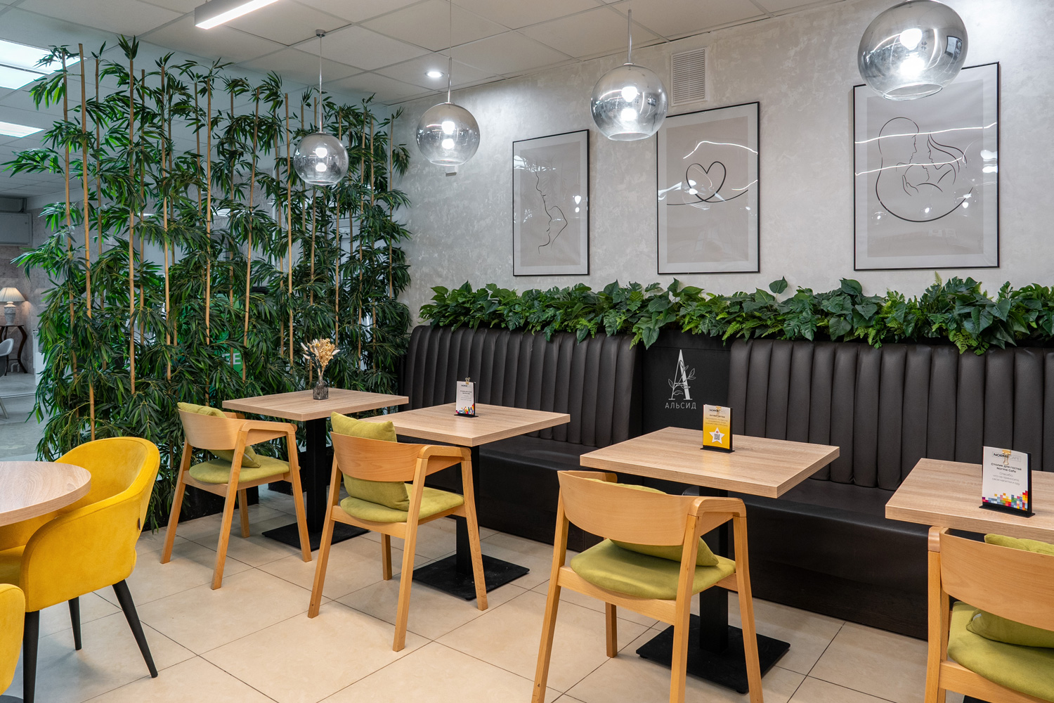 Для отделения мини-кафе в общем холле медицинского центра была использована бамбуковая ширма, размеры которой изготавливаются под любой размер. За счет неплотного заполения листвой, ширма кажется воздушной и легкой. Композиция с тропическими растениями оформляет зону вдоль всех столиков. А горшечные папоротник и потос придают уют на полке с инвентарем. ;