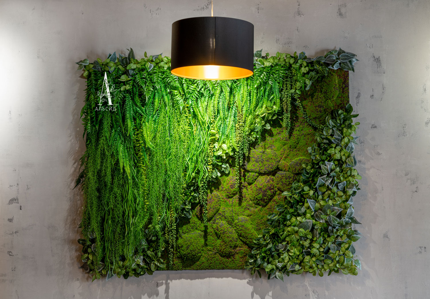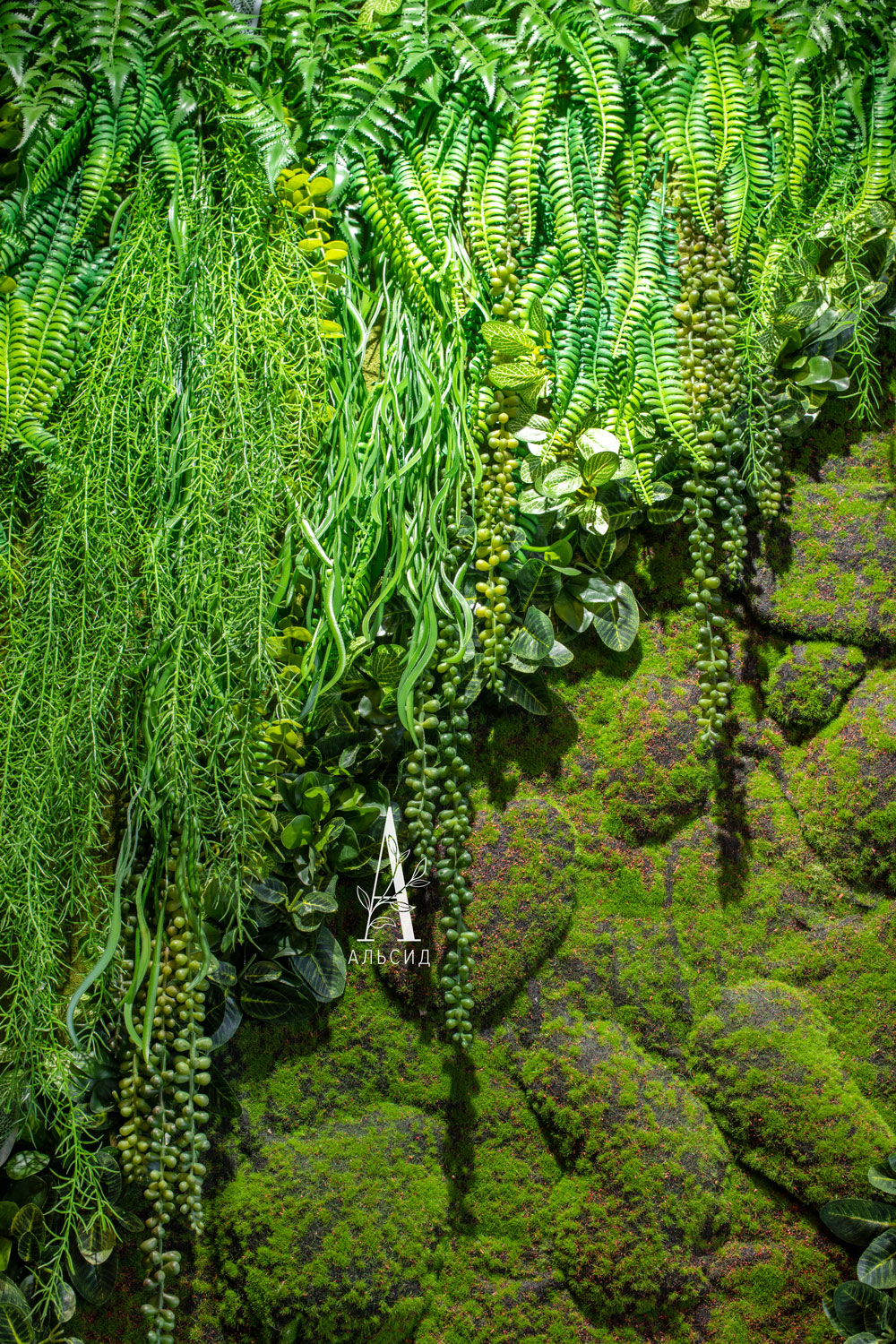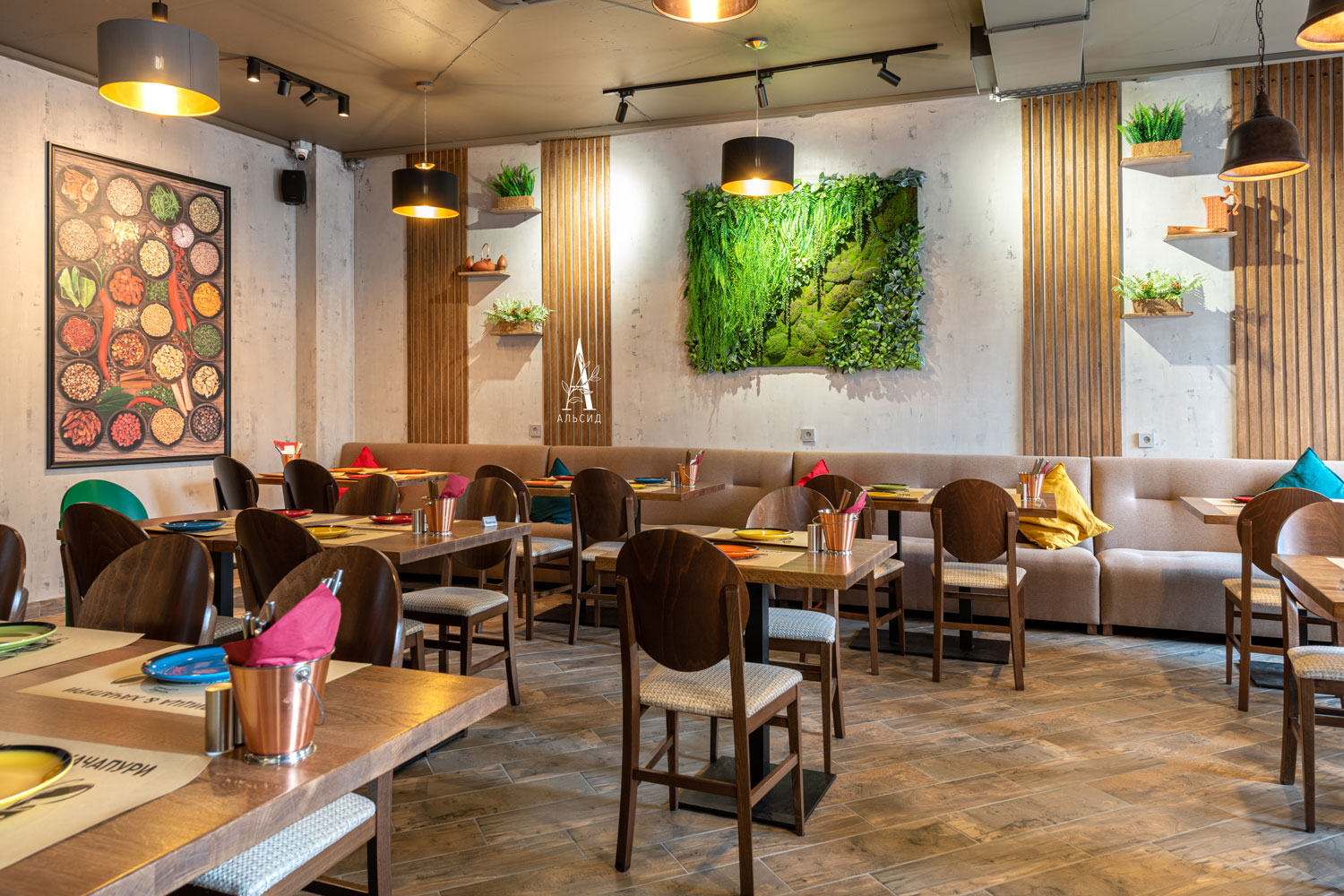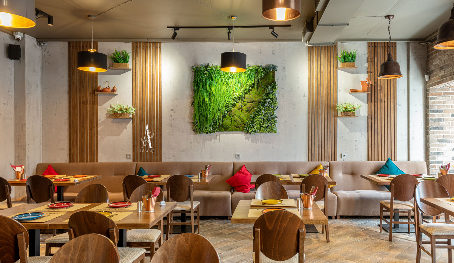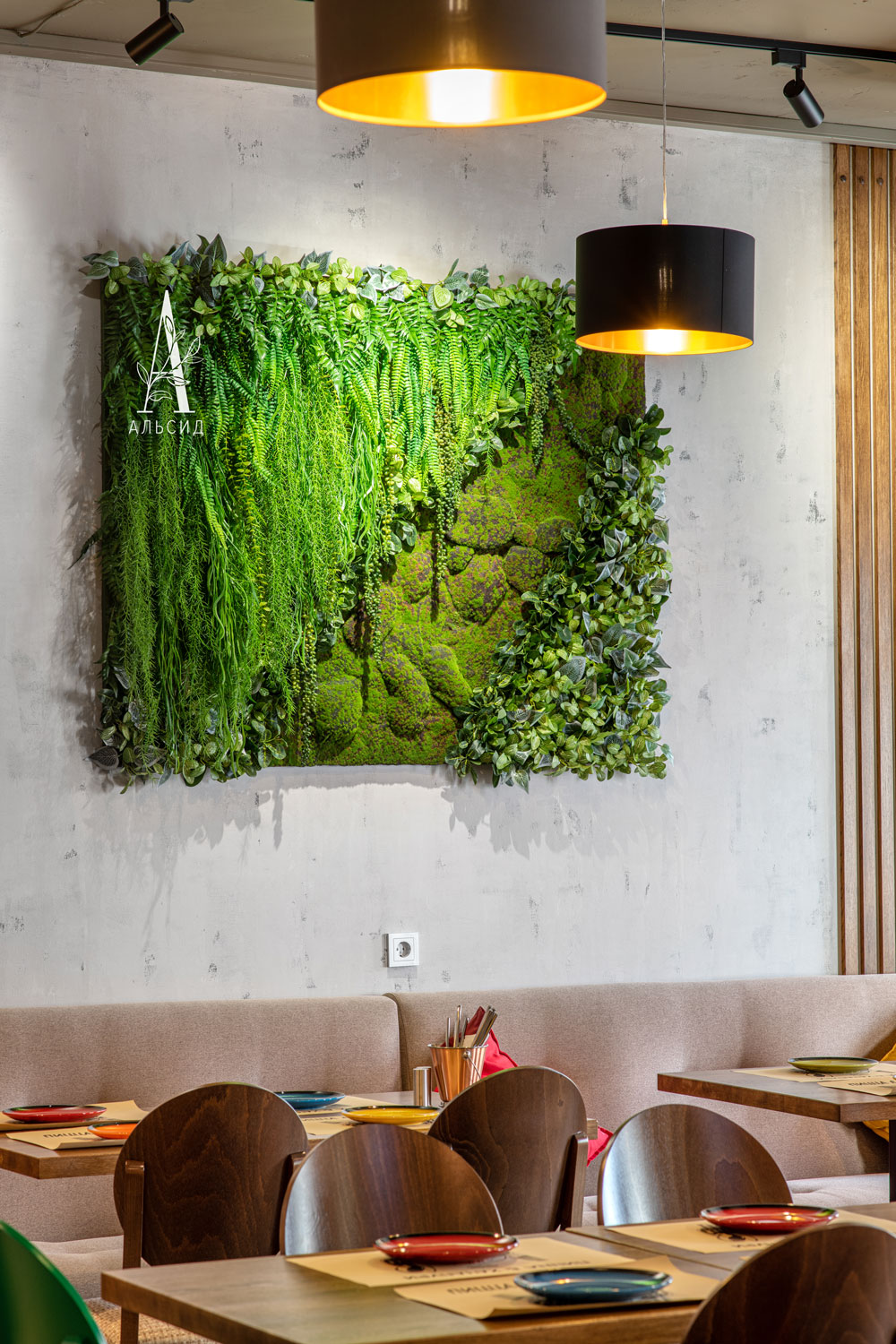 Фитокартина из зеленых растений и мшистой дорожкой стала ярким акцентом, создающий нужный контраст с теплым тоном зала. Поддерживают цветовую гамму интерьера боксы с папоротниками разных оттенков, расположенные на полочках. Малый зал также оформлен фитокартиной из папоротника и суккулентов, заполняя пустую стену во всю длину. ;