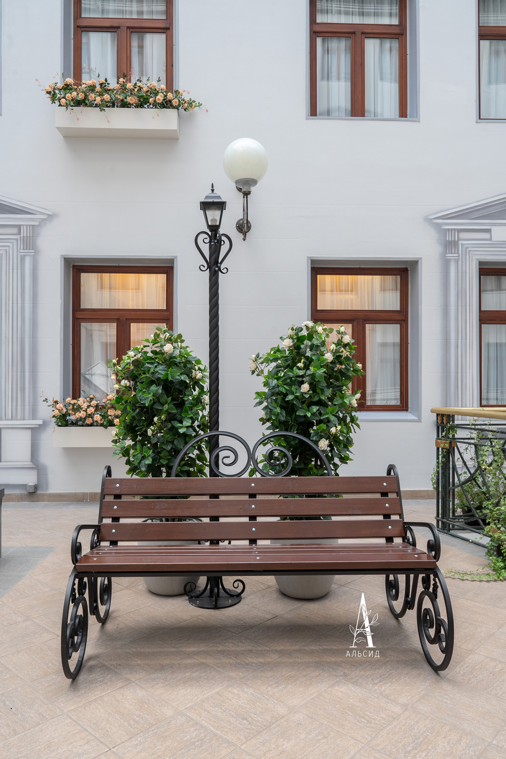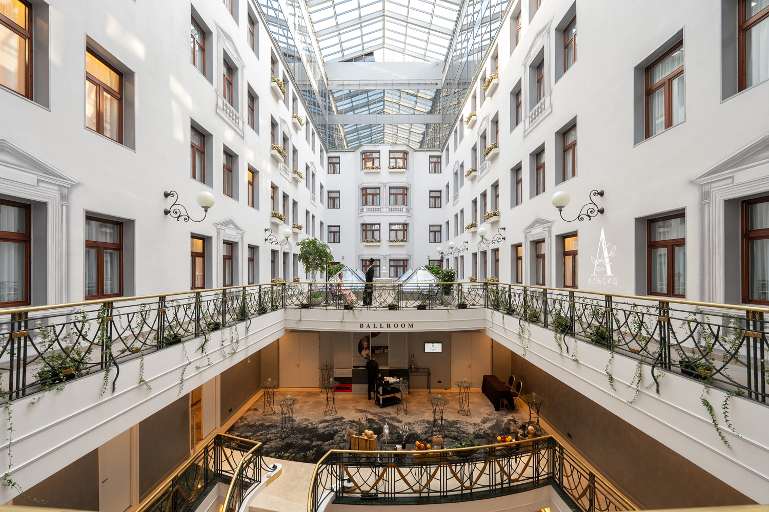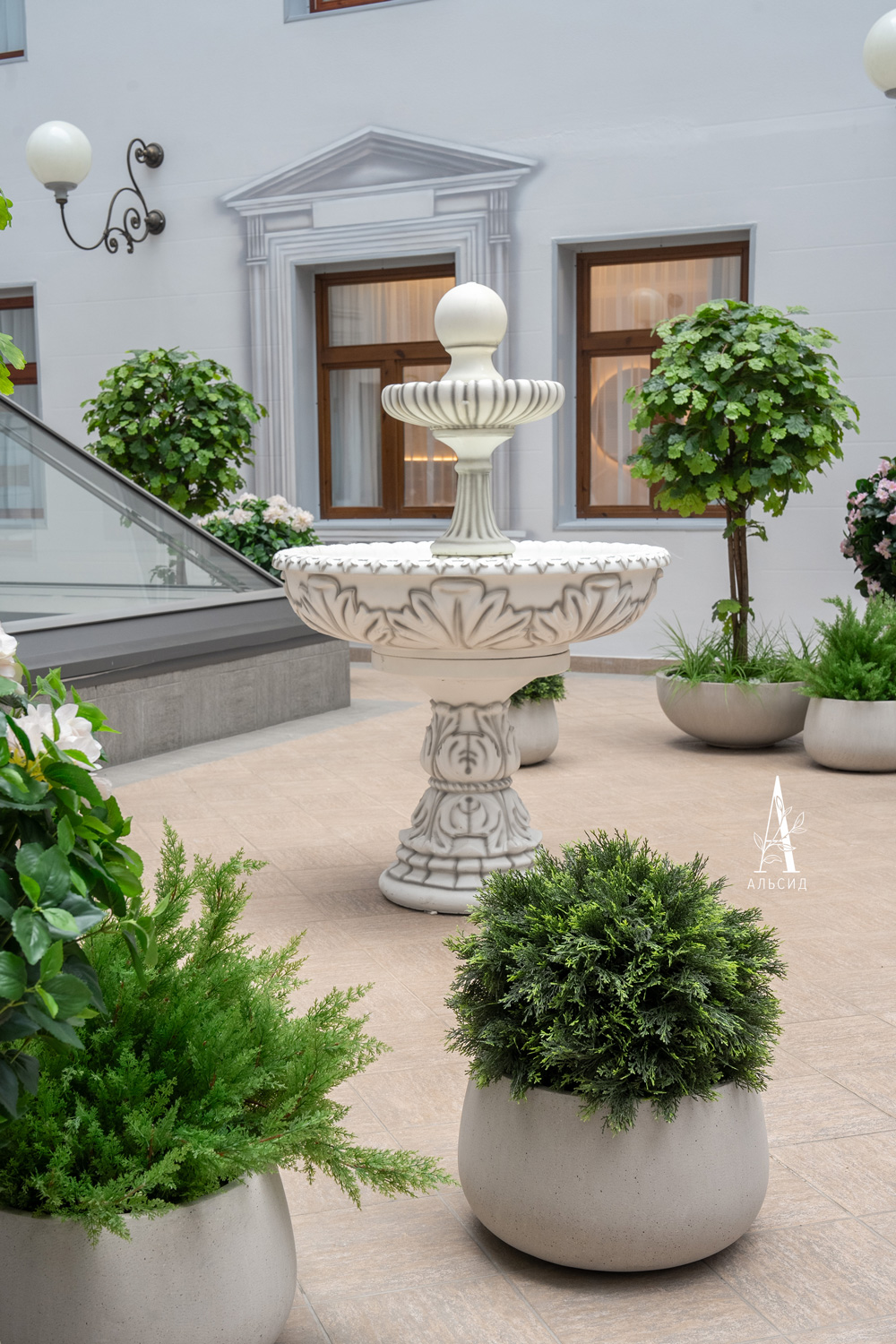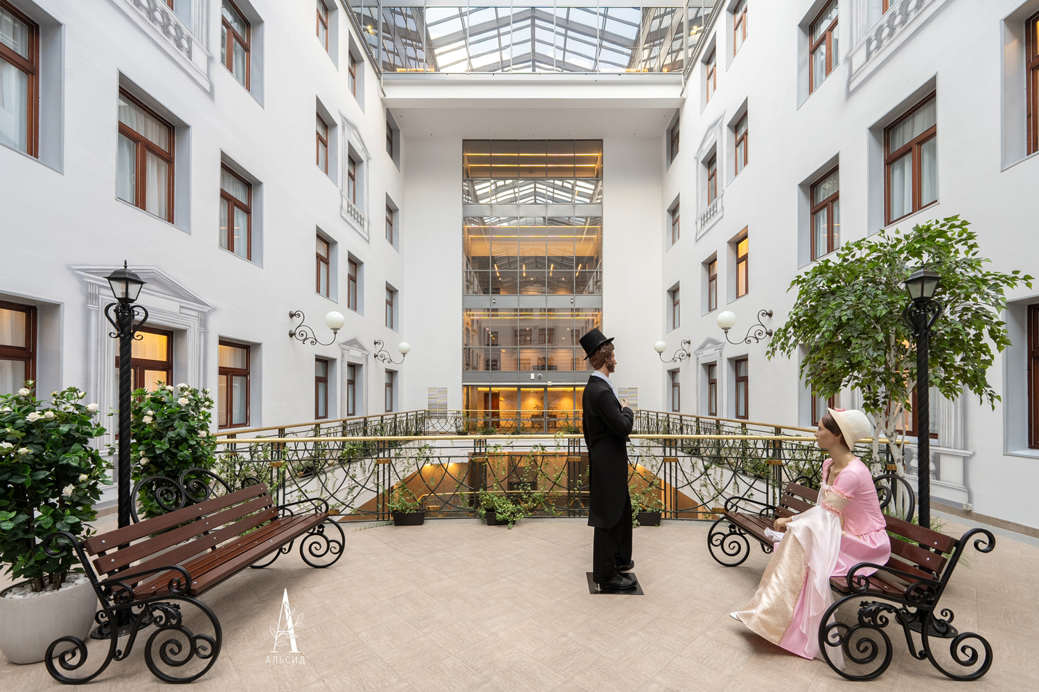 Под световым фонарем сад будто из классической литературы объединяет атриум с номерным фондом. Для гостей отеля создали большую композицию с разными искусственными растениями и деревьями. Береза, дуб, жасмин, роза, гортензии, туя-шар, можжевельник, композиции из роз символизируют русскую природу, которая вызывает спокойствие и умиротворенность.;