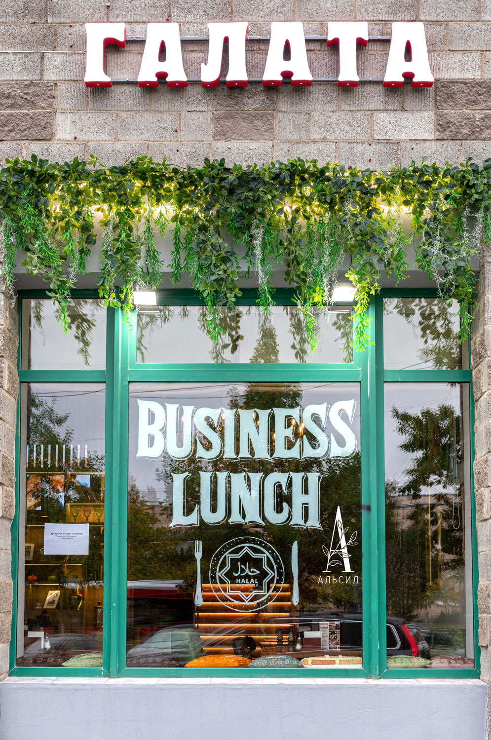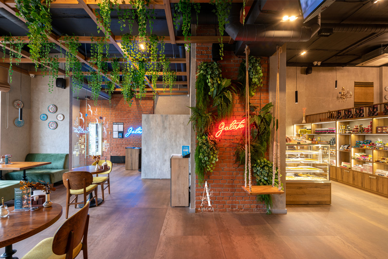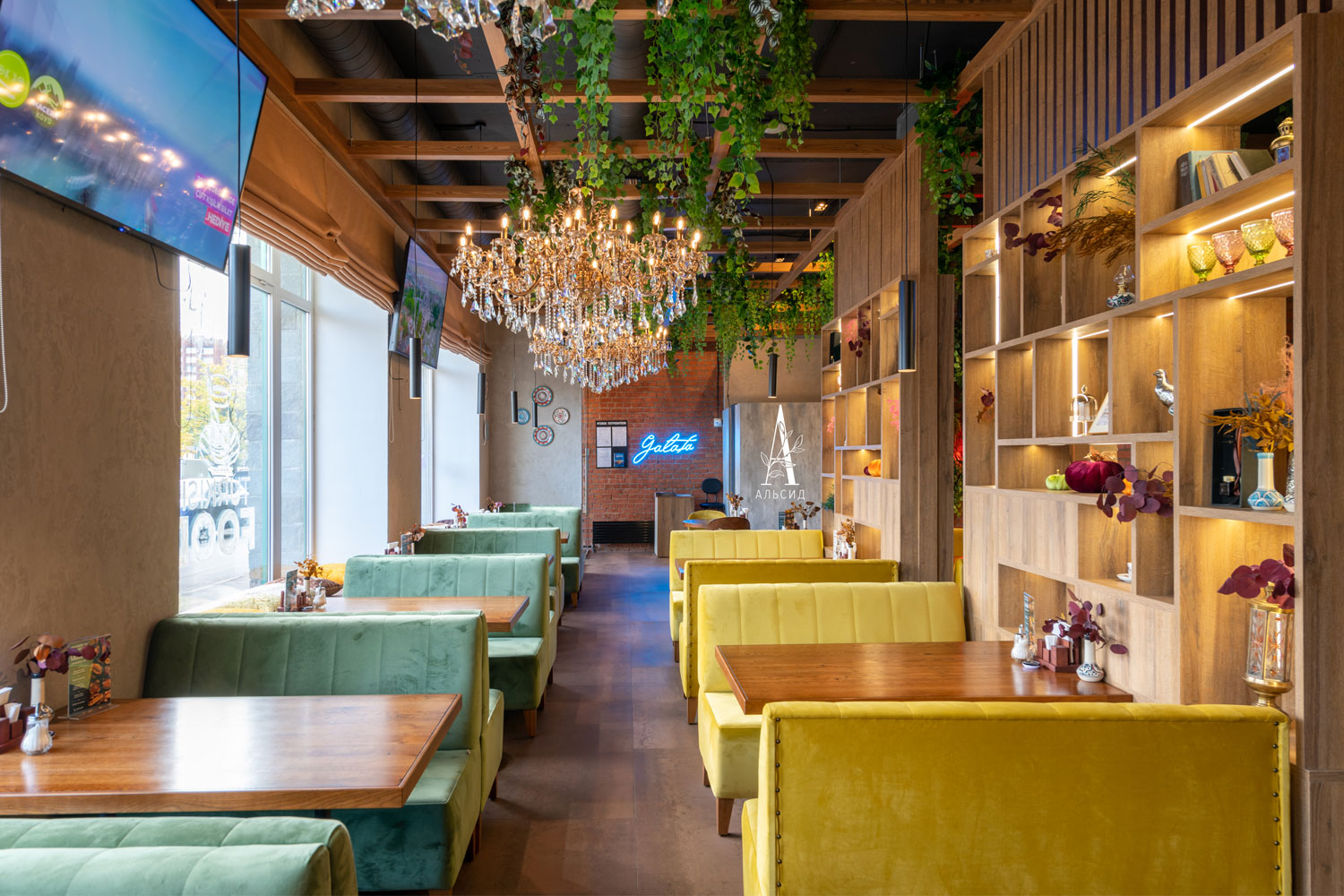 Для оформления ресторана был продуман не только интерьер, но и экстерьер заведения. Фасадные окна обрамлены лианами с подсветкой. Внутри искусственные растения гармонично расположены как на потолке, так и на стенах. На стенах собраны композиции для фитокартины и фотозоны (каладиум, папоротник на блоке, папоротник на соте, аспарагус) с неоновым логотипом компании. ;