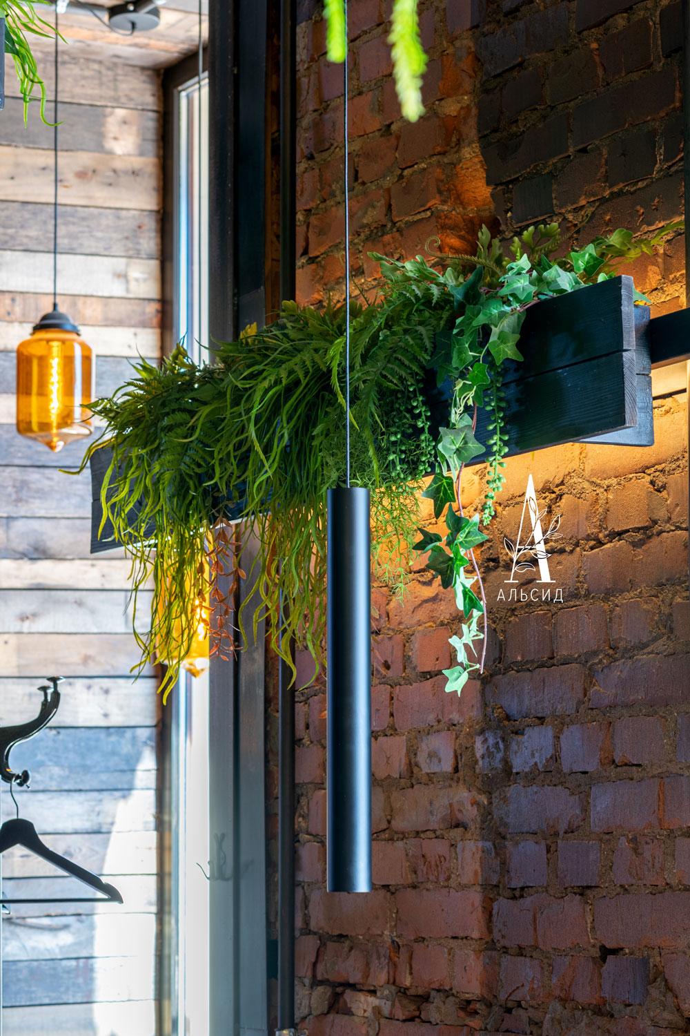 Искусственные растения являются самым идеальным вариантом для заполнения потолочного пространства, особенно для помещений с антресолью, где потолок должен выглядеть презентабельно с любого уровня. Композиции из ампельных растений как раз подходят под этот запрос. Также входную группу украшает летний декор: деревянный ящик, полевые цветы и папоротник. ;
