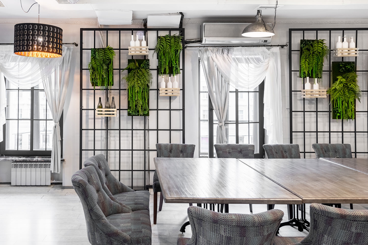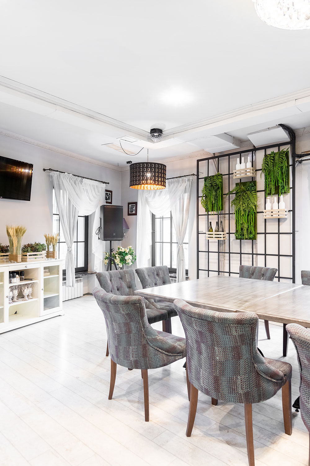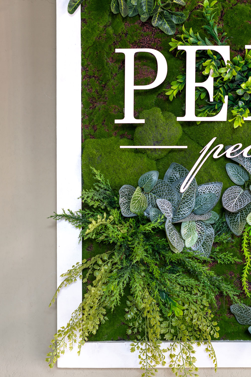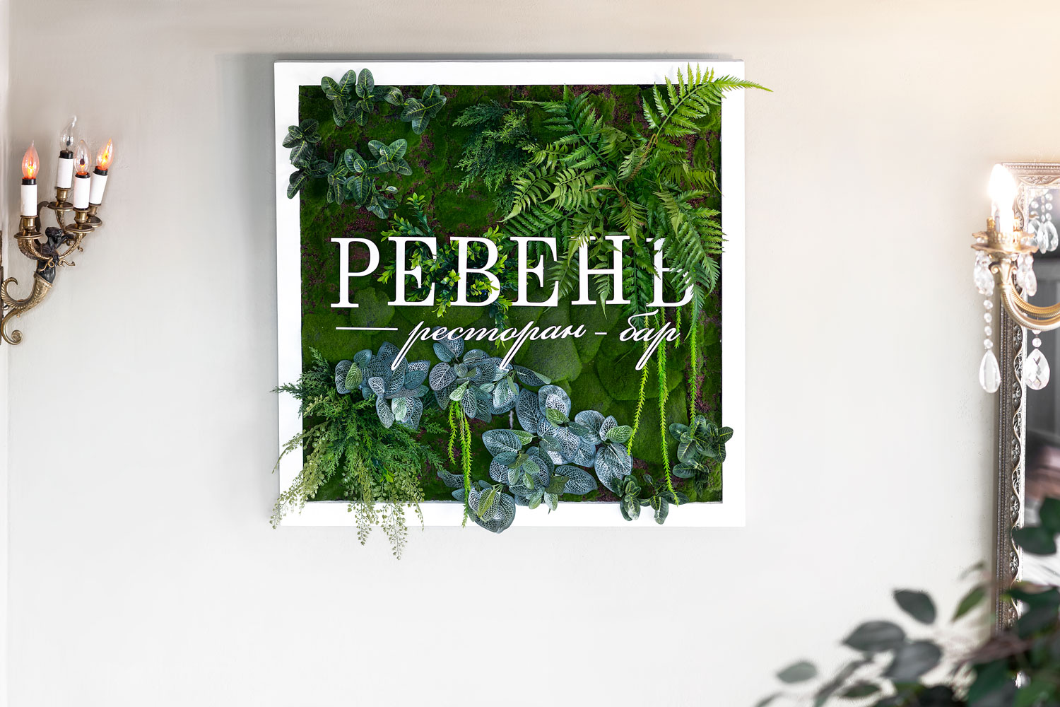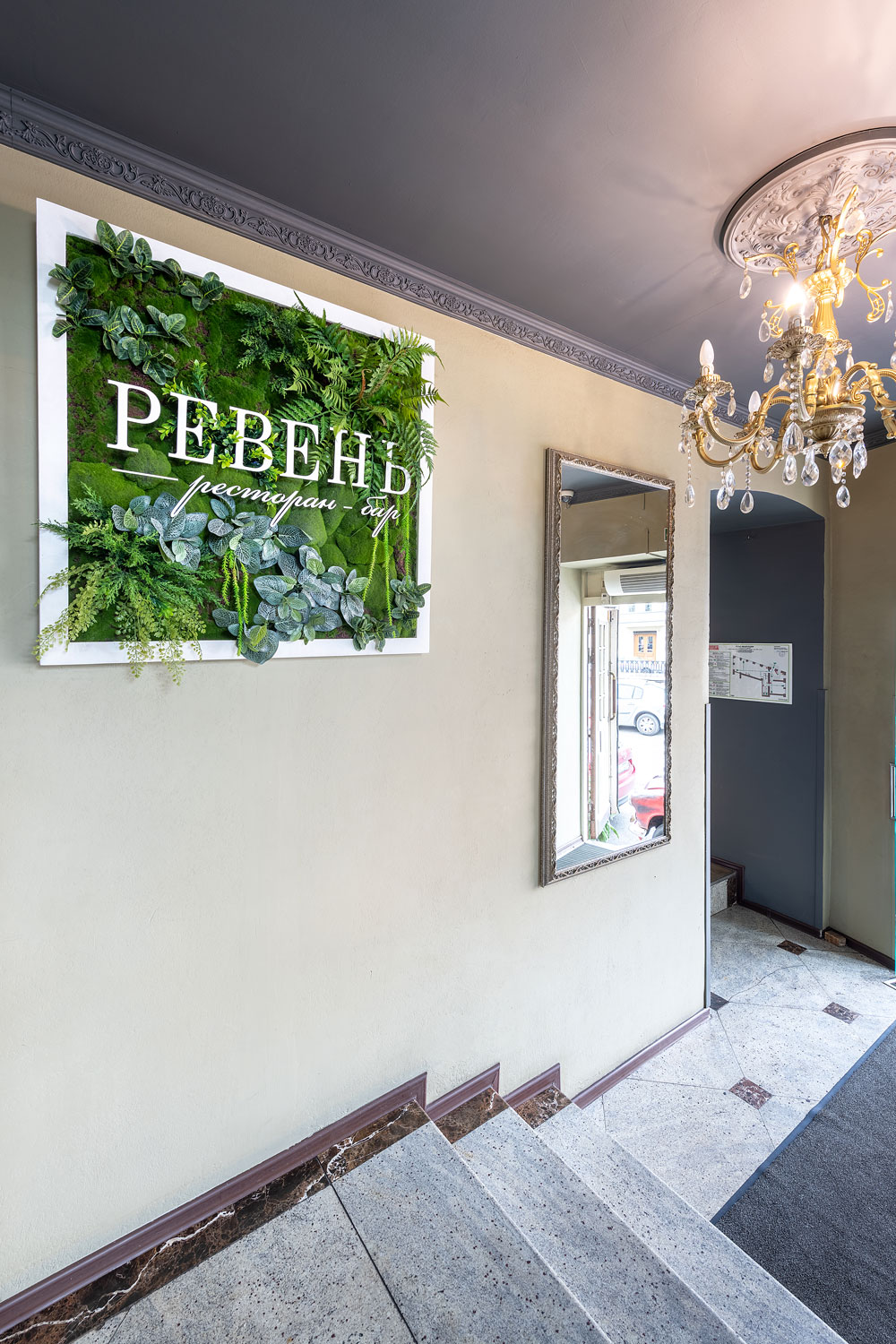 ; Фитокартины с папоротниками отлично дополняют выдержанный интерьер, а шеффлеры с ампельным нефролеписом в ящиках смотрятся просто шикарно на стенах! Небольшие деревья - пальма, куст монстеры, бамбук и шеффлера - создают нужные акценты и поддерживают настенные композиции. ; Особое внимание было уделено вывеске ресторана, которую обрамили в красивую фитокартину с разнообразными зелеными растениями. ; Наши дизайнеры готовы к любым запросам, даже таким нестандартным, как у ресторана Ревень, где нужно было подобрать подходящее оформление арочного окна по стилю, форме и цвету. Для воплощения идеи "ползущей" лианы были выбраны натуральные веточки с листочками из премиального материала, которые делают лиану похожей на настоящую, а нежное кремовое соцветие бугенвиллии придает легкость и элегантность такой объемной конструкции. Для придания устойчивости общей комозиции рядом установлены напольные пальмы в ящиках, которые дополняют интерьер. Вход украшают вечнозеленые хвойные породы. Можжевельник в кокосовых боксах на оконных кронштейнах смотрится свежо и благородно. ;
