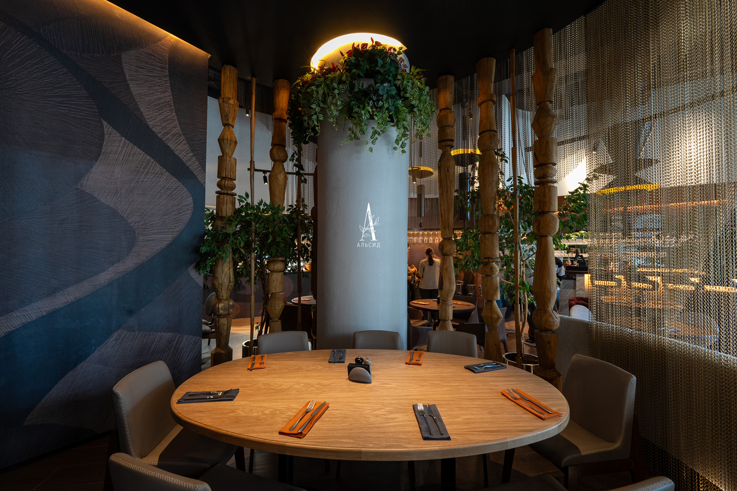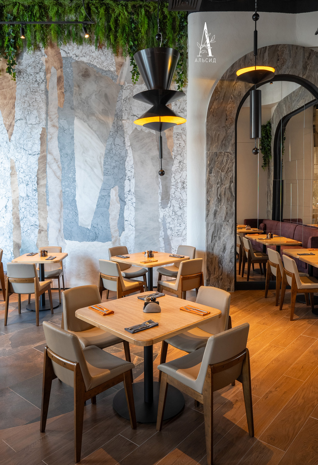 Для оформления пространства с высокими потолками дизайнеры выбрали ампельные растения из искусственных премиальных материалов: хедера, пилея с папоротником, плющ, пилея кадье, традесканция. На мраморной стене лиана из хедеры, рипсалиса, даксина, адиантума, асплениума.;
