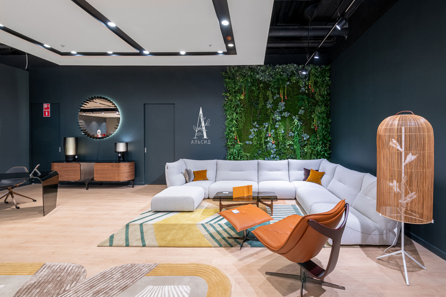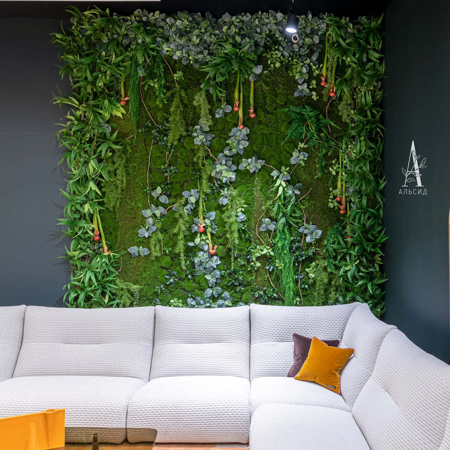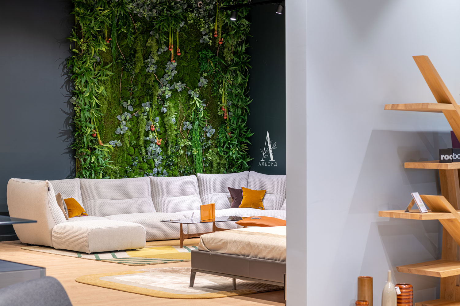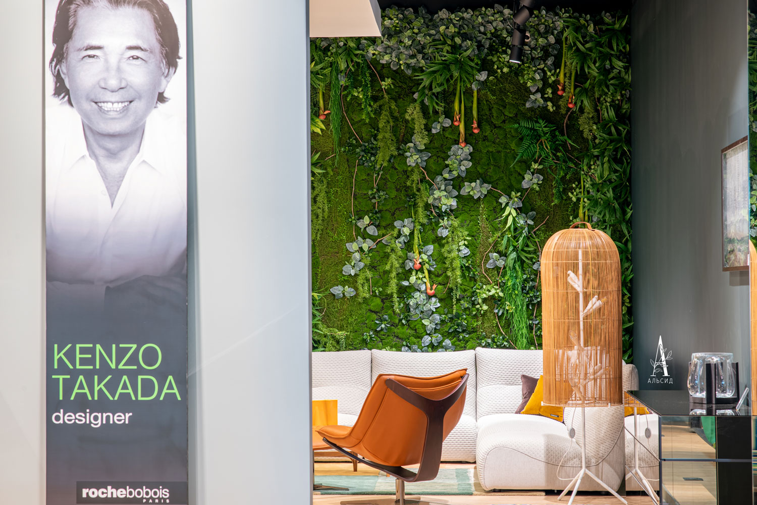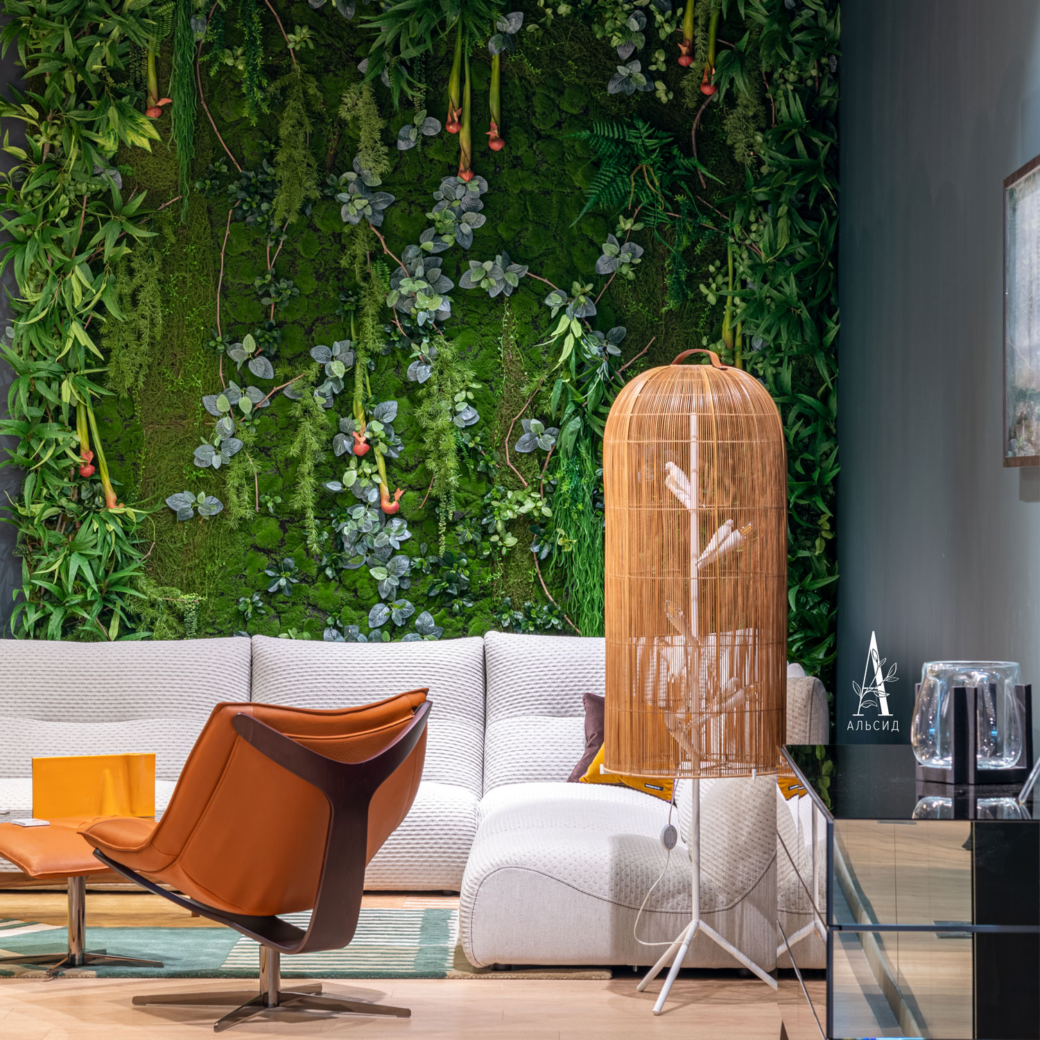 Салон французской мебели Roche Boboise представил пример озеленения домашних интерьеров. Большая тропическая фитостена будет хорошо смотреться в гостиной, став главным украшением и точкой притяжения. Альтернативным вариантом также может стать зеленый островок, составленный из деревьев разных видов и горшечных растений: банановая пальма (180см и 160см), пальма кустовая (200см, 180см, 160см, 95см), куст алоказии, монстера на стволе 95см, каладиум, тропический микс с ампельной травой и роули в боксе, тропический микс со стрелицией, филодендрон Селло, драцена.;