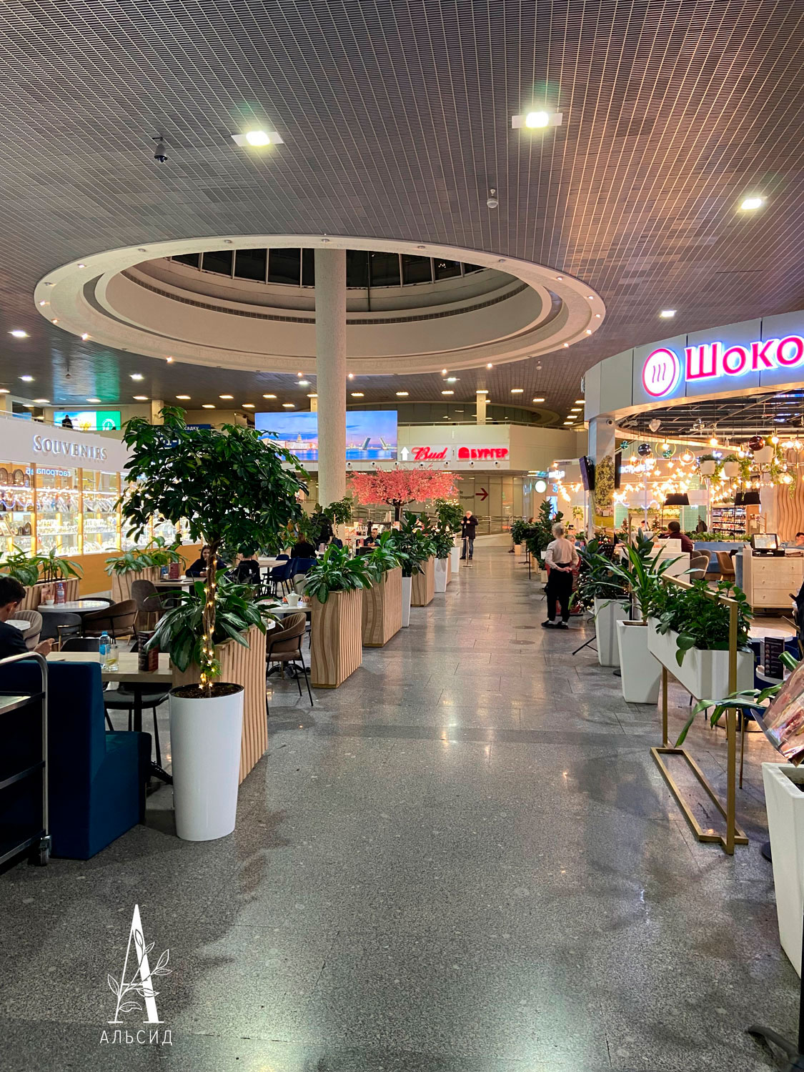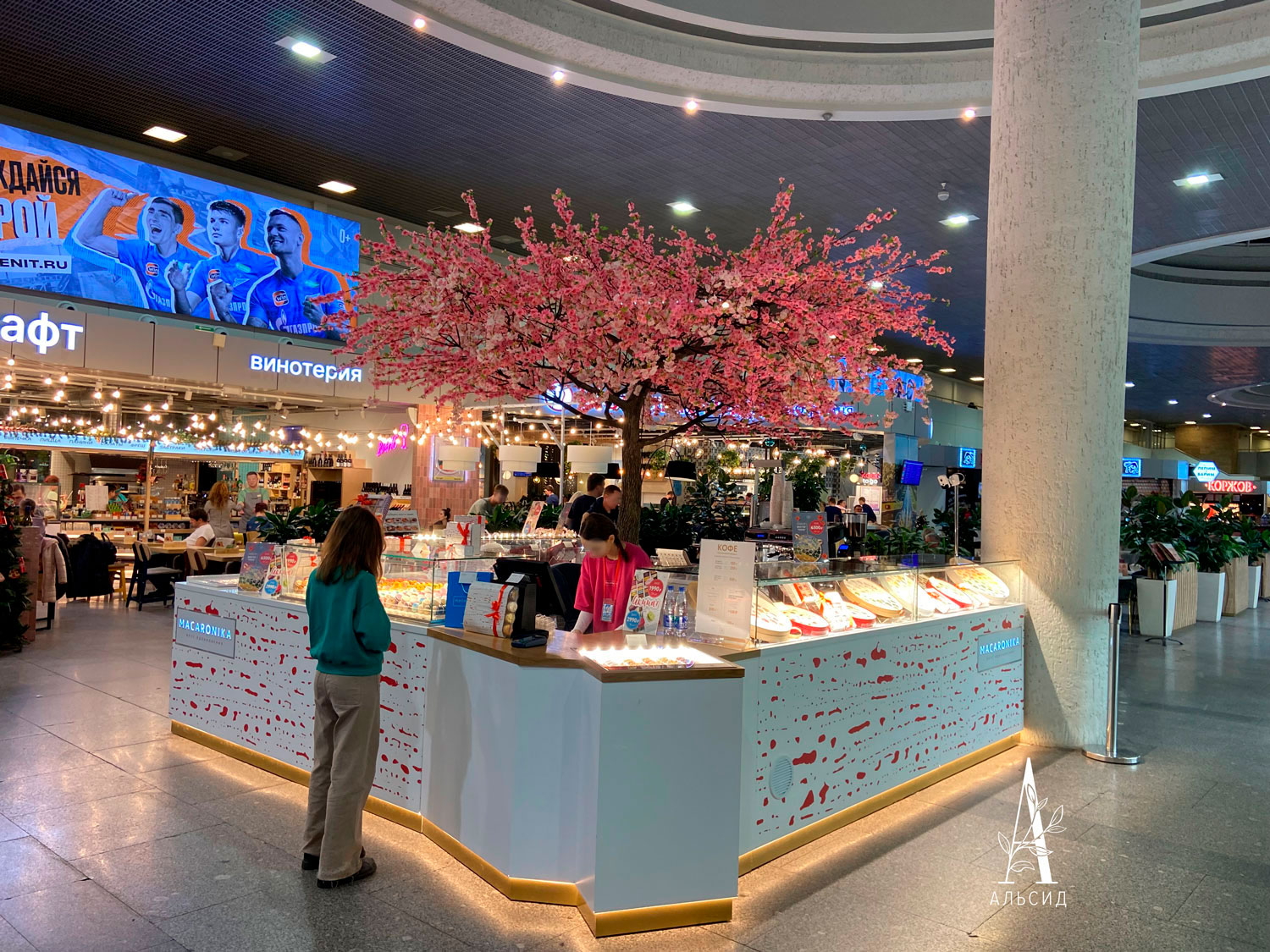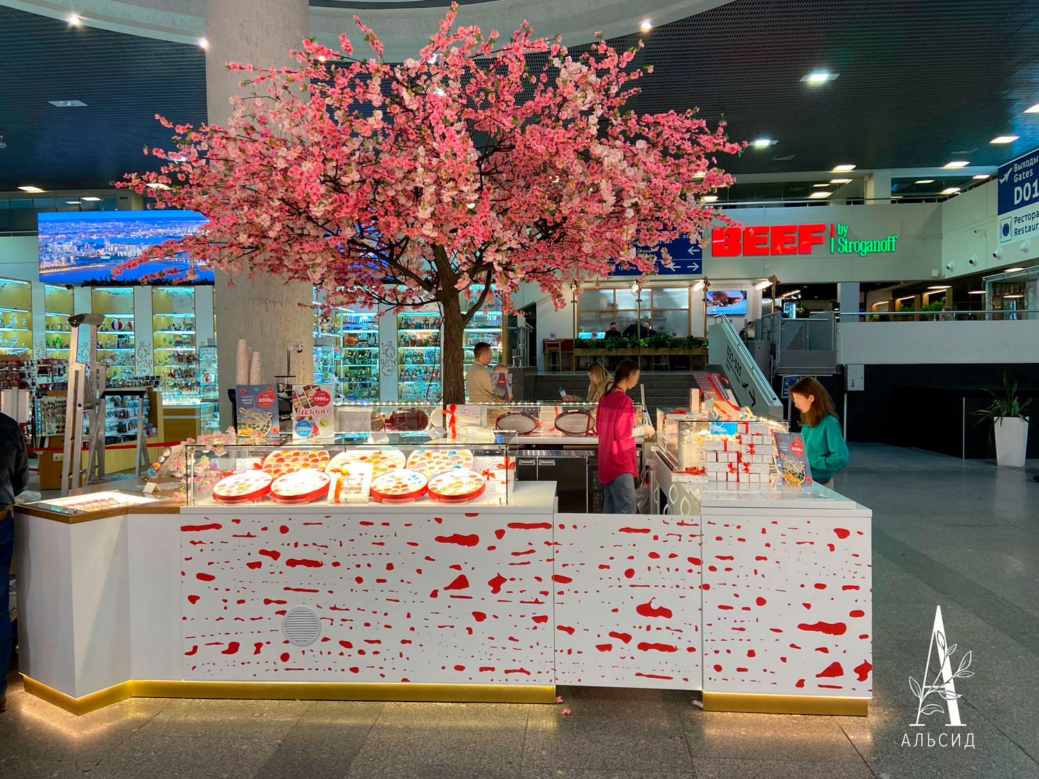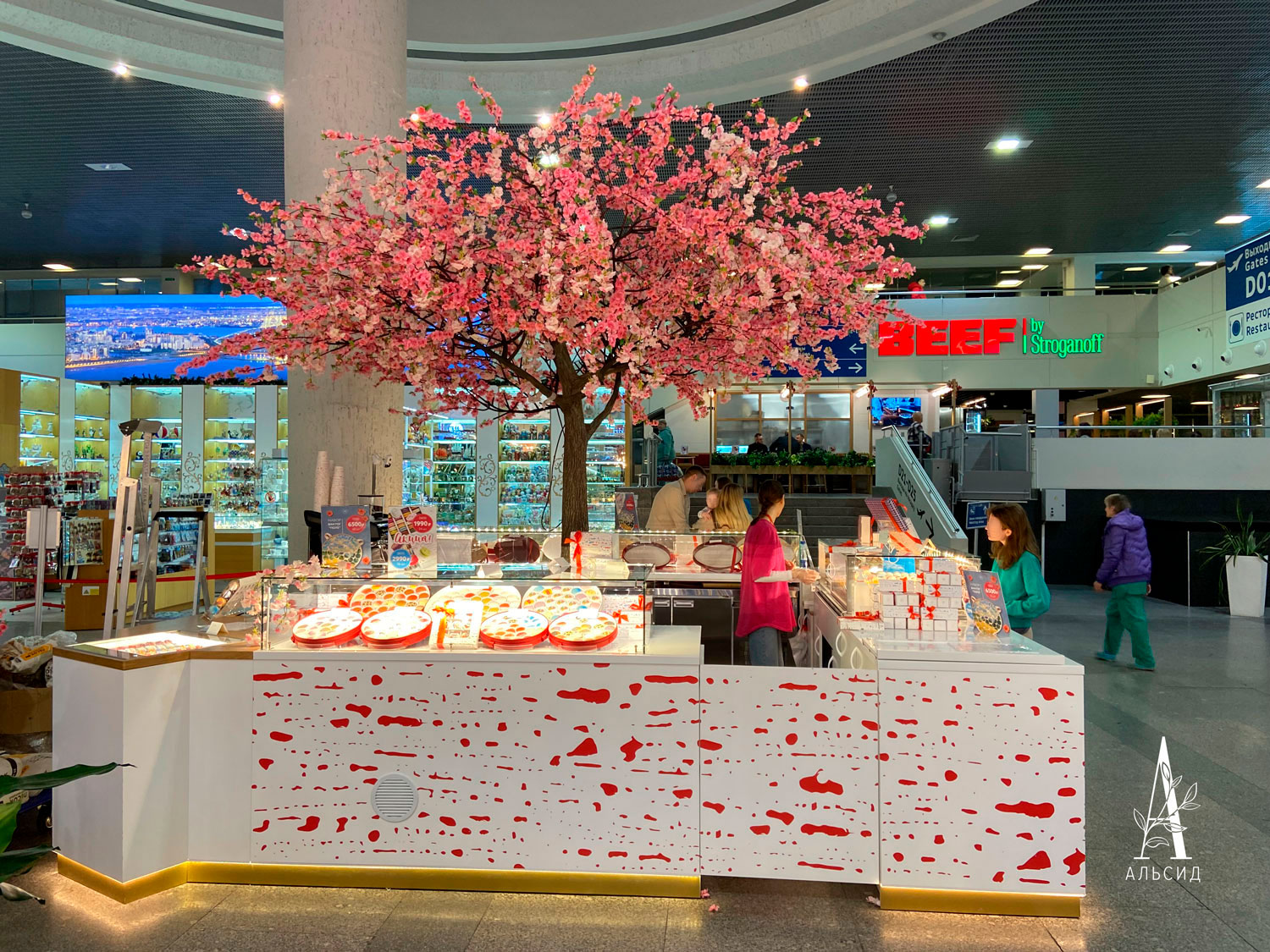 Посреди торгового зала в зоне отправки аэропорта Пулково в Санкт-Петербурге расположился один из магазинов фабрики "Макароника", производящей наши любимые десерты. Именно в нем и расположилась наша прекрасная