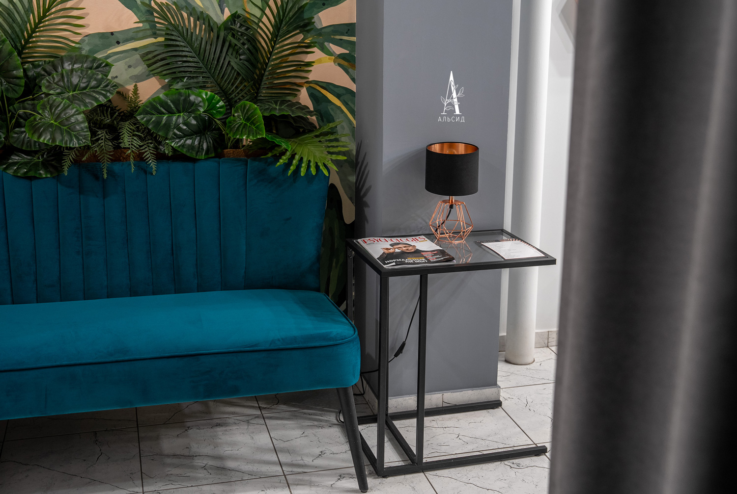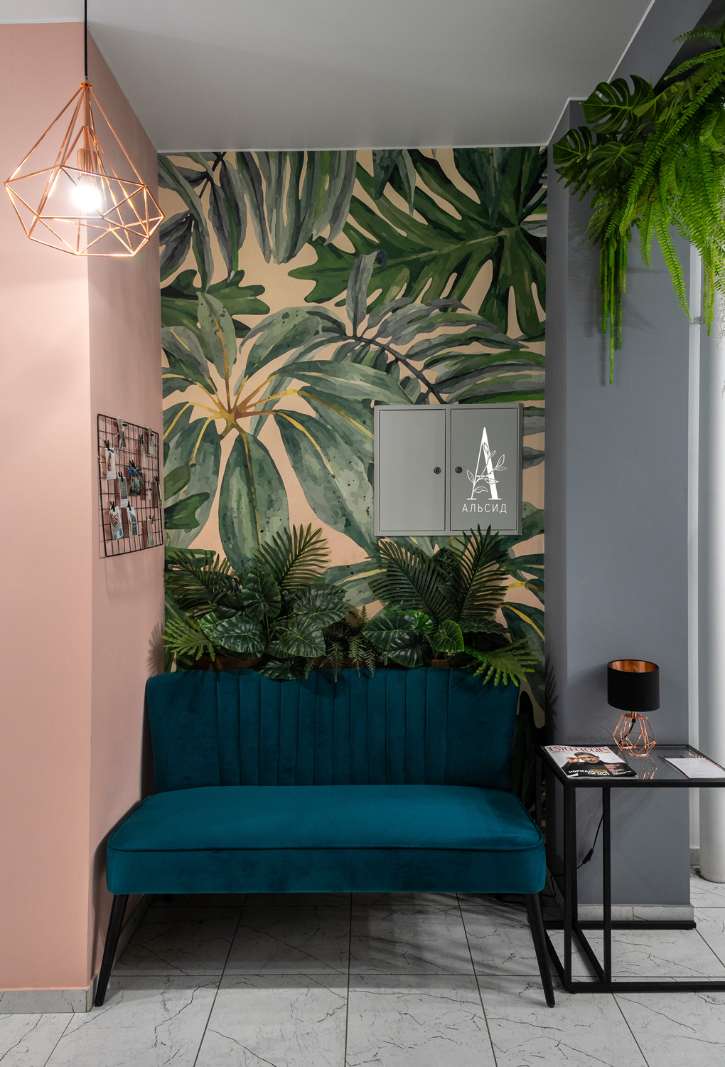 Под тропический интерьер салона были выбраны подходящие композиции. Центром внимания стала фитокартина в зоне ресепшн, которая сразу погружает посетителя в зеленую атмосферу. Украшенный пышными листьями портал сопровождает в лаунж, где кокосовый бокс с филодендроном и пальмой отлично сочетается с текстурным диваном и тематическими обоями. ;