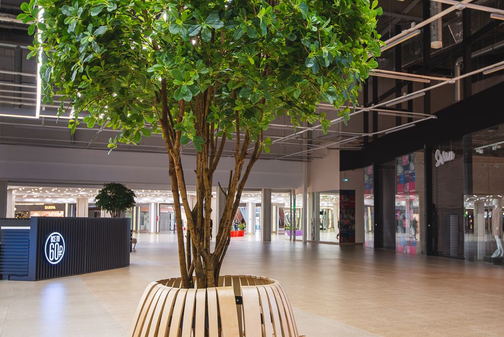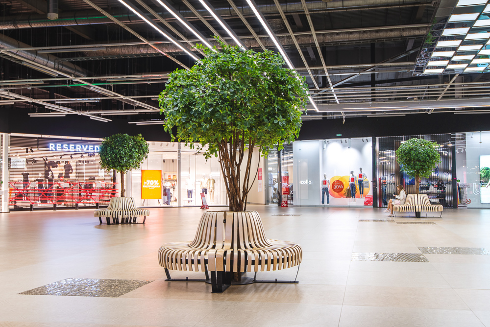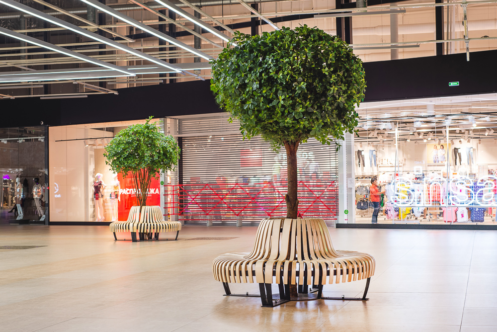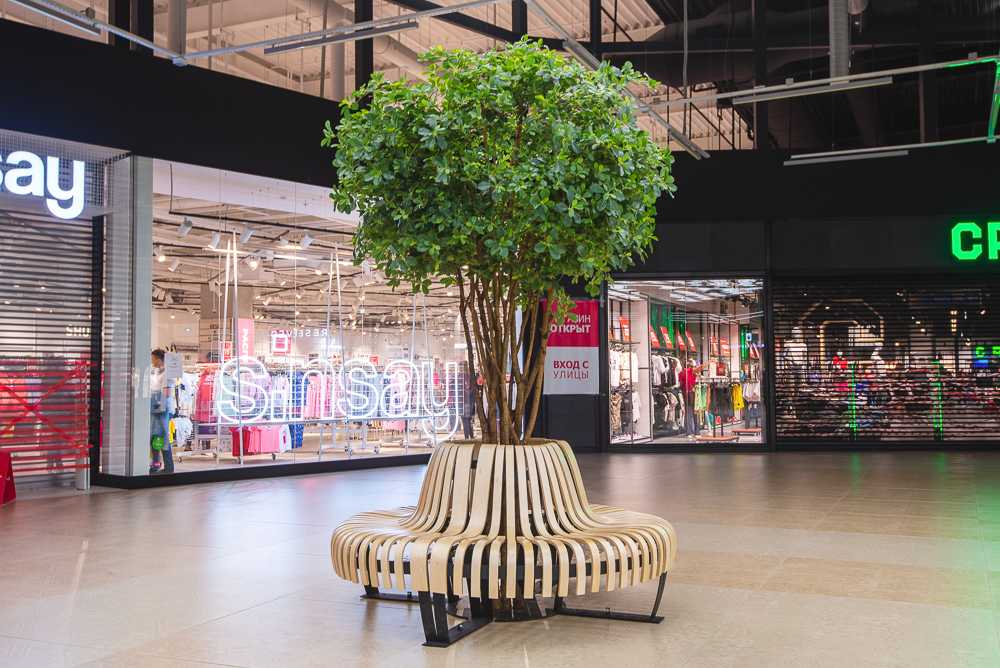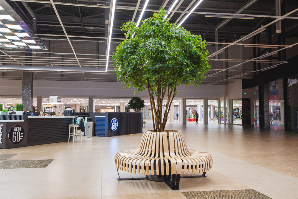 Деревья для ТРК Балкания Nova в г. Санкт-Петербург.; Пять шеффлер высотой 320см и высотой 300см отлично вписались в зону отдыха! Теперь можно отдохнуть на скамейке и почувствать себя в настоящем лесу, ведь стволы сделаны из настоящего дерева, а латексированный лист сложно отличить от настоящего.