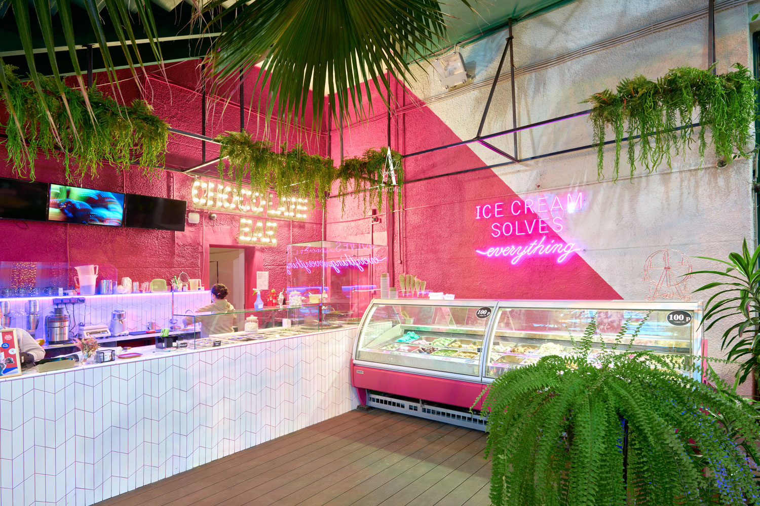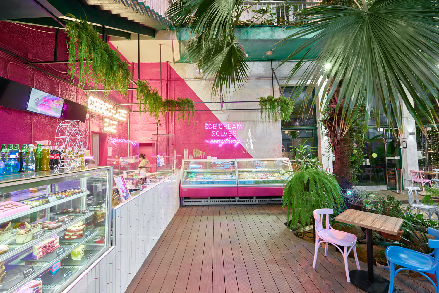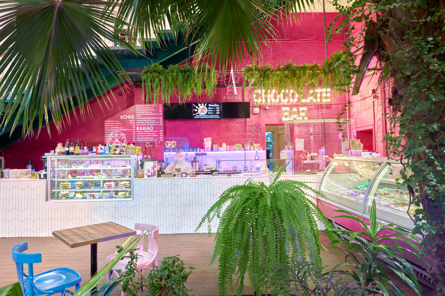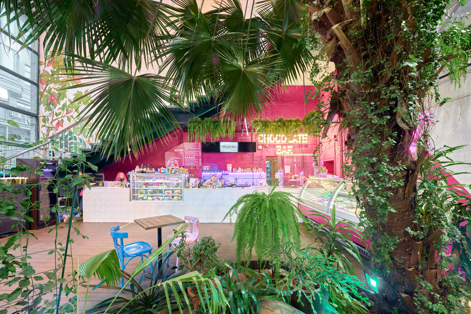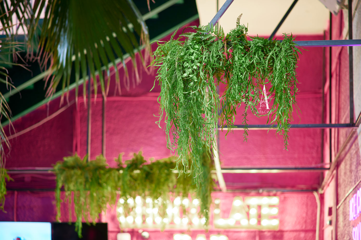 Оформление витринной и кассовой зоны требует растения с минимальным уходом, поэтому для "секретного сада" идеально подошли ампельные растения из премиальных материалов, которые очень гармонично смотрятся рядом с живыми растениями. Для декорирования зеркал около раковин также необходимы были растения с повышенной изностойкостью, и растения из сенсорного латекса отлично справляются с данной задачей.;
