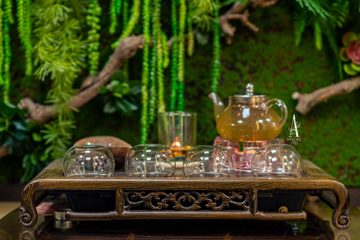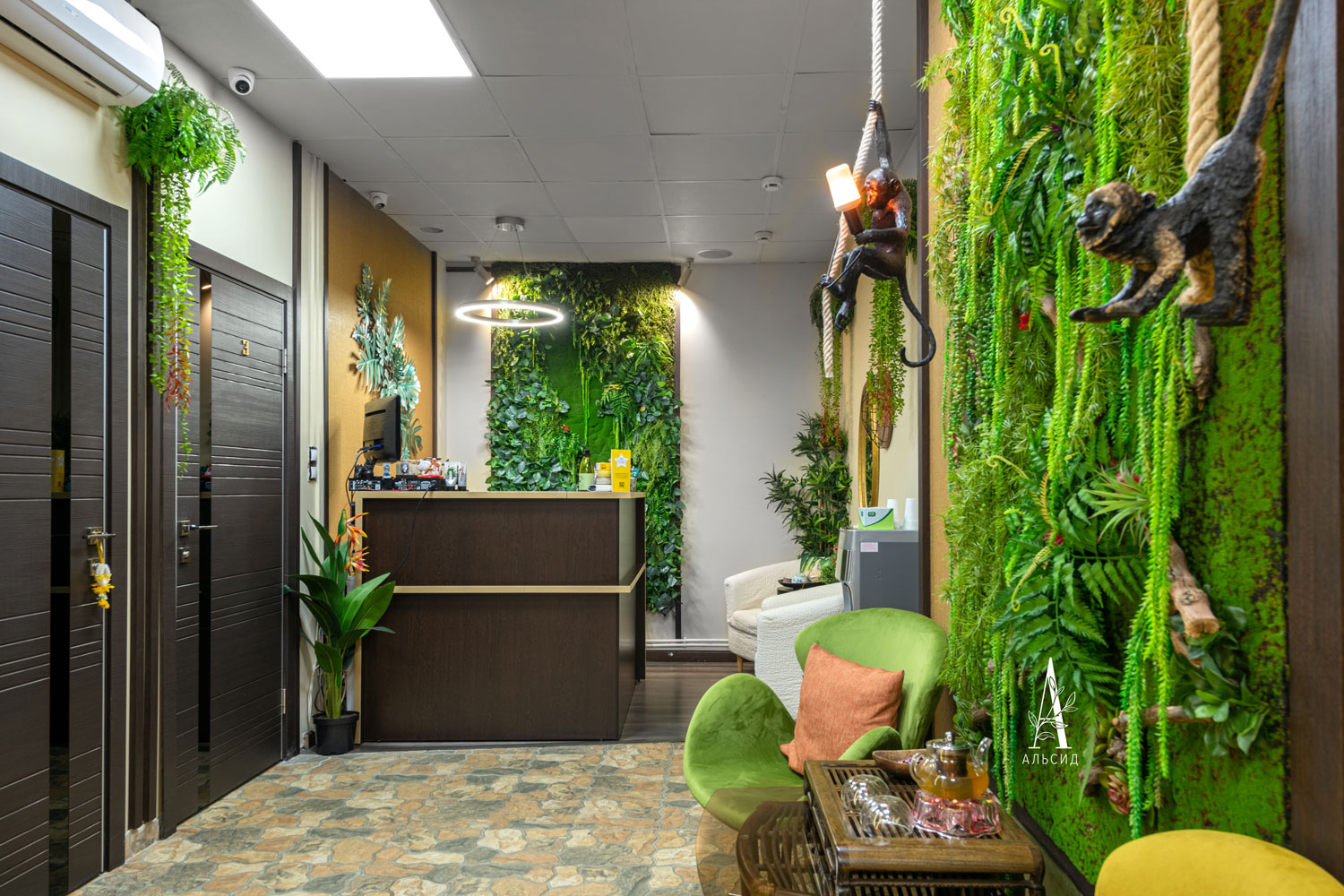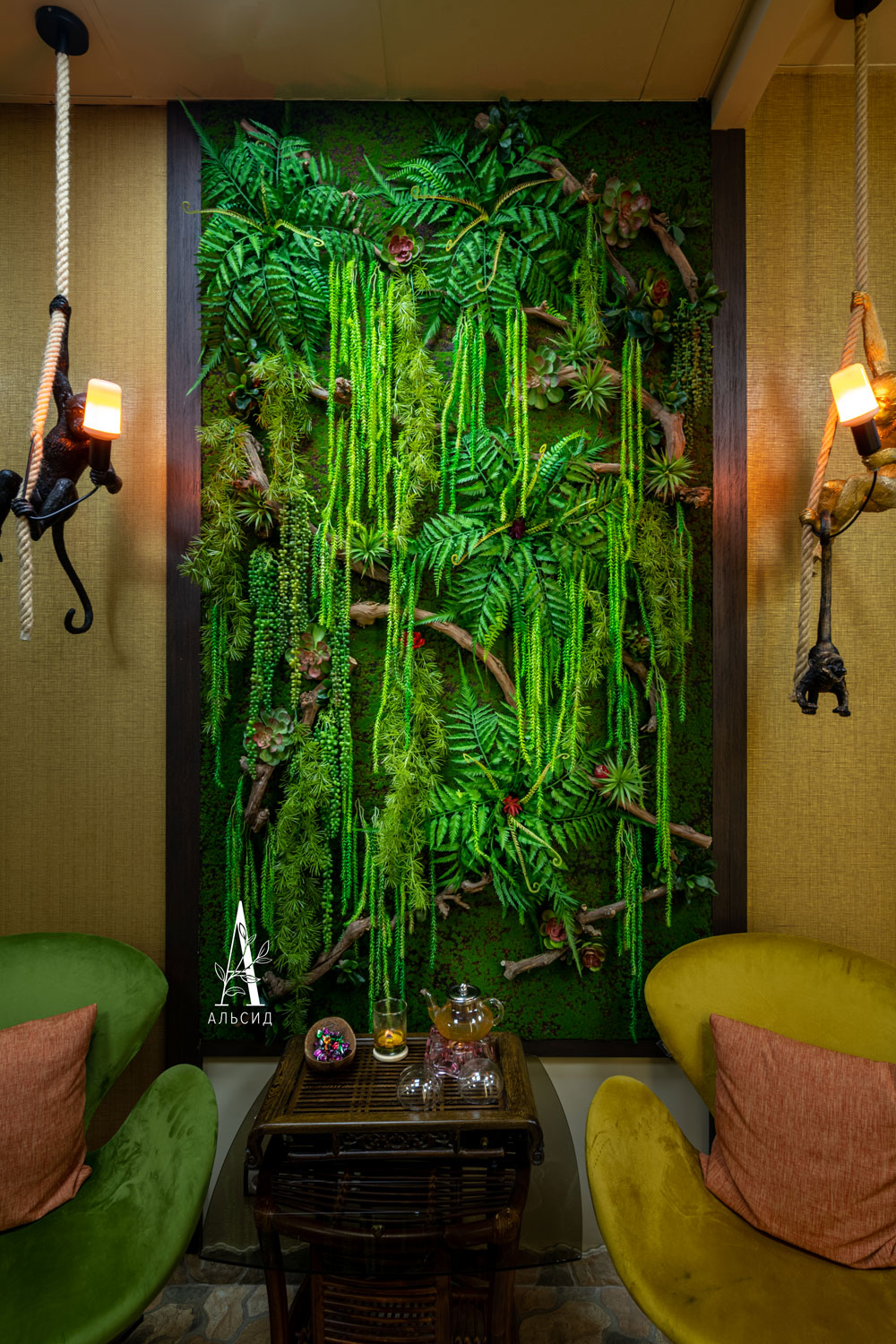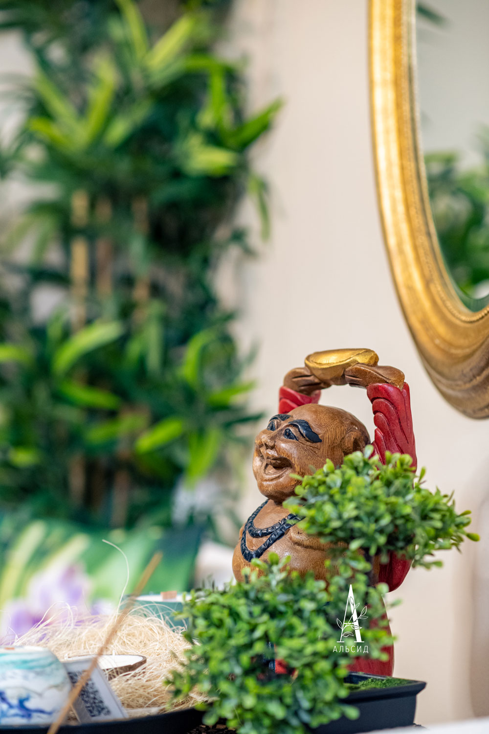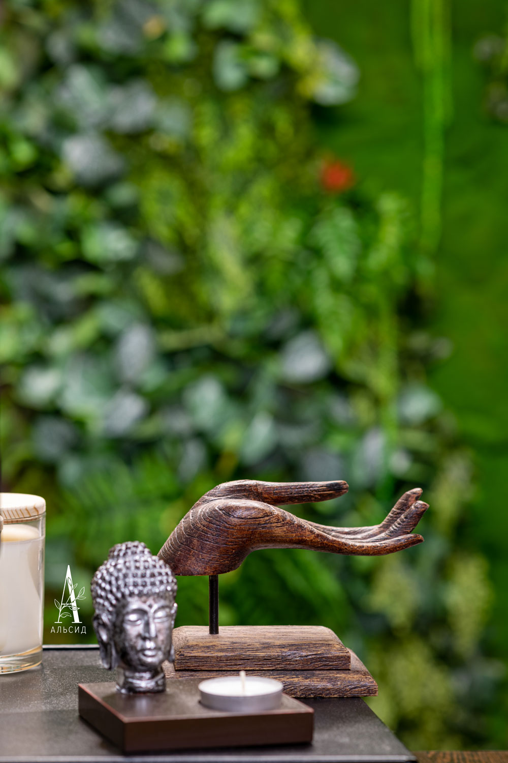 В небольшие помещения особенно хорошо вписываются фитостены из искусственных растений, ведь они не только заполняют пространство, но и расставляют цветовые акценты. Для тайского спа-салона тропическая тема подошла идеально. Дополняют фитостены кокедамы, бамбук и стрелиция, которые также помогают создать ощущение гармонии с природой. ;