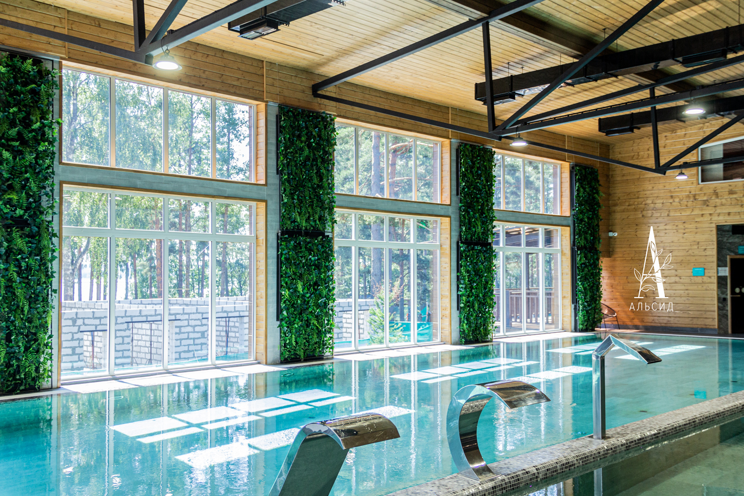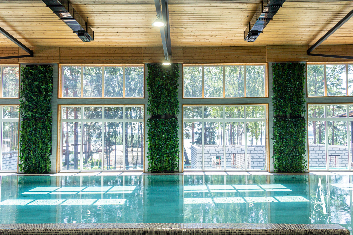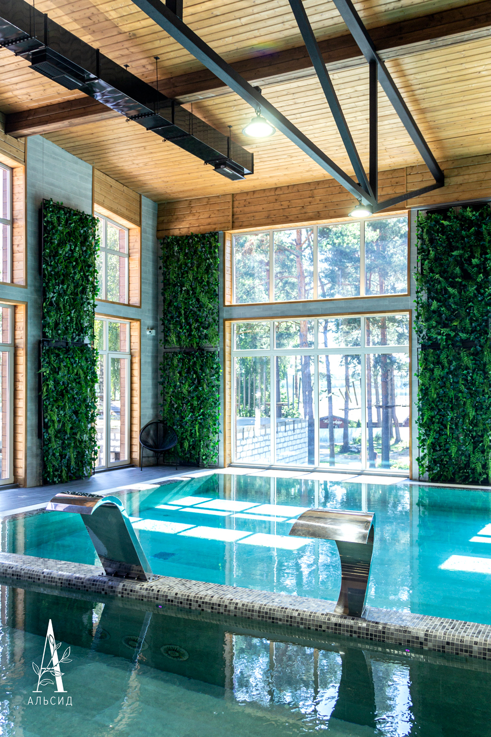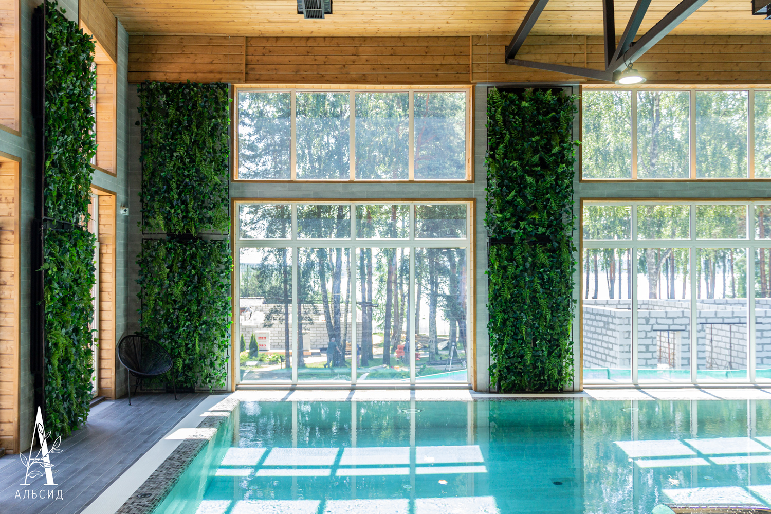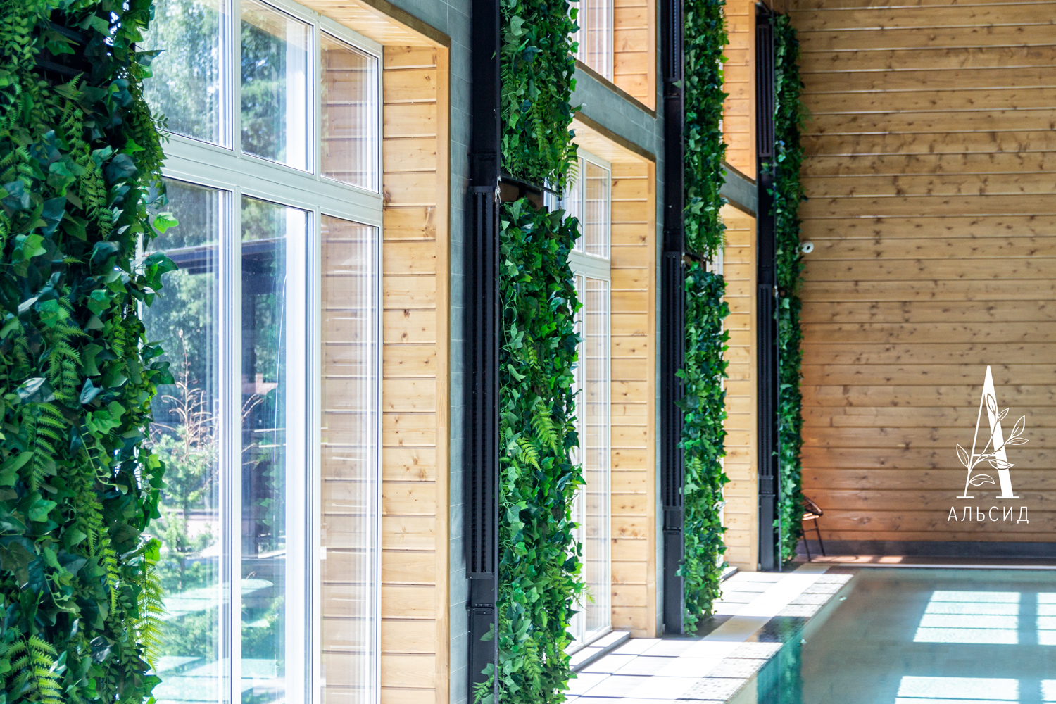 В расслабляющем СПА-центре загородной базы отдыха "Жемчужина" в зоне бассейнов и всевозможных водно-банных комплексов расположились наши искусственные фитостены. Плющи, папоротники и другие ампельные растения, словно тропики, прекрасно сочетаются с водной гладью и помогают расслабиться не только Вашему телу, но и Вашему сознанию. Фитопанно в деревянной раме дополнили пустые стены над зонами отдыха, а искусственная трава с камышом в кокосовом боксе украсила уголки помещения.;