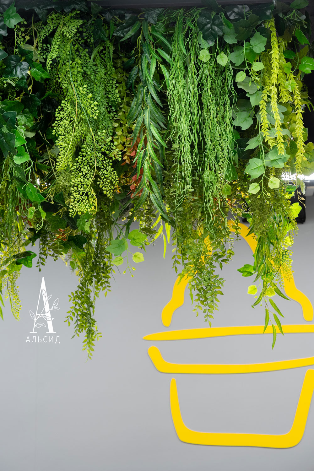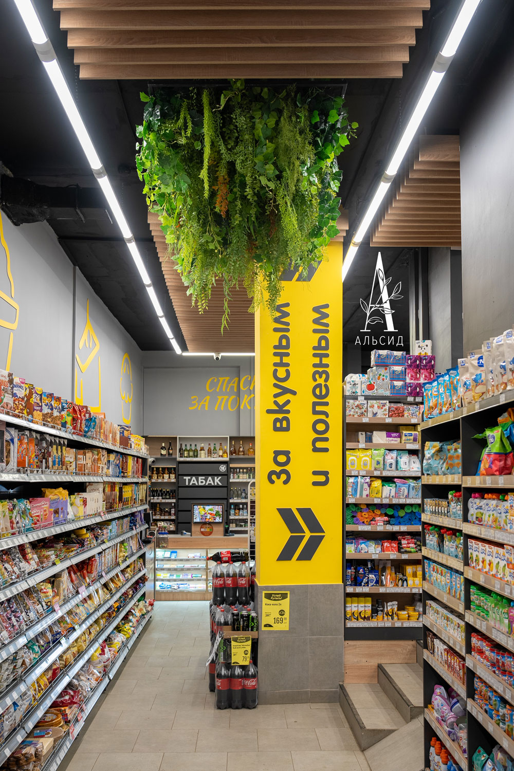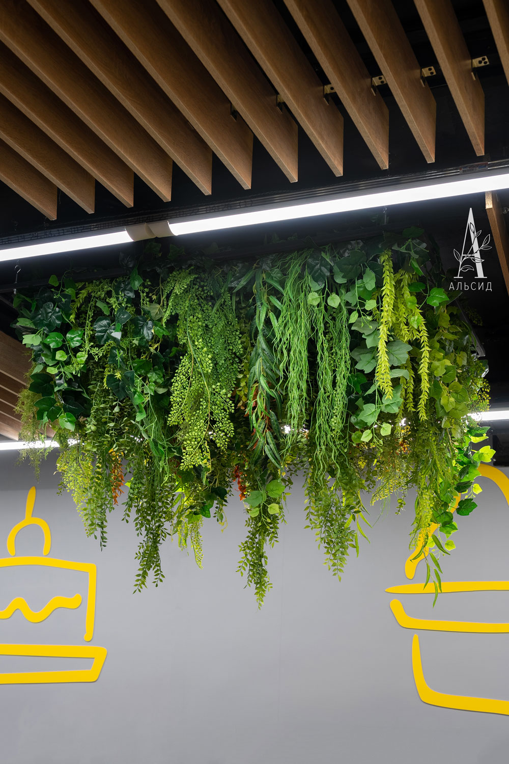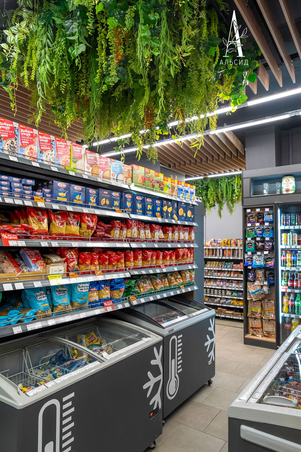 Для создания приятной обстановки в супермаркете сделали потолочную композицию из искусственных растений и травы. Ведь оформление магазина тоже имеет значение и повышает уровень комфорта для покупателей.;