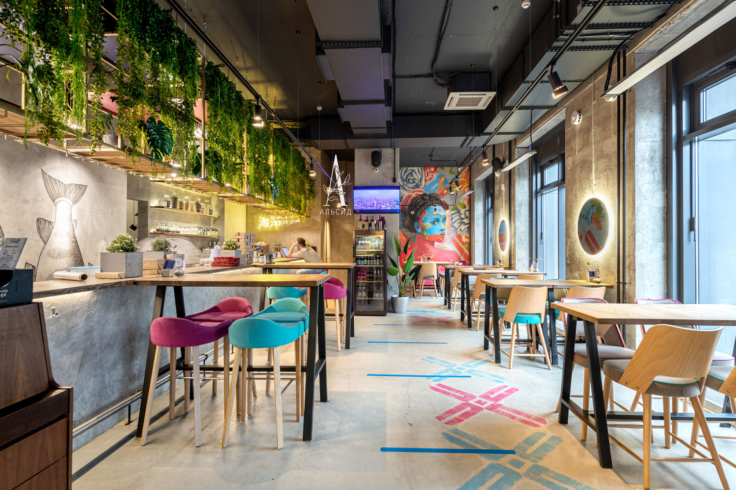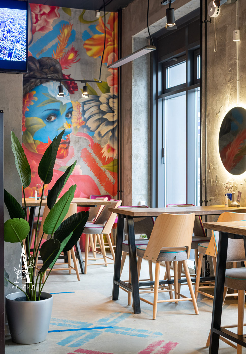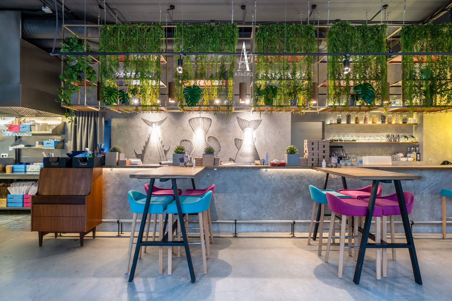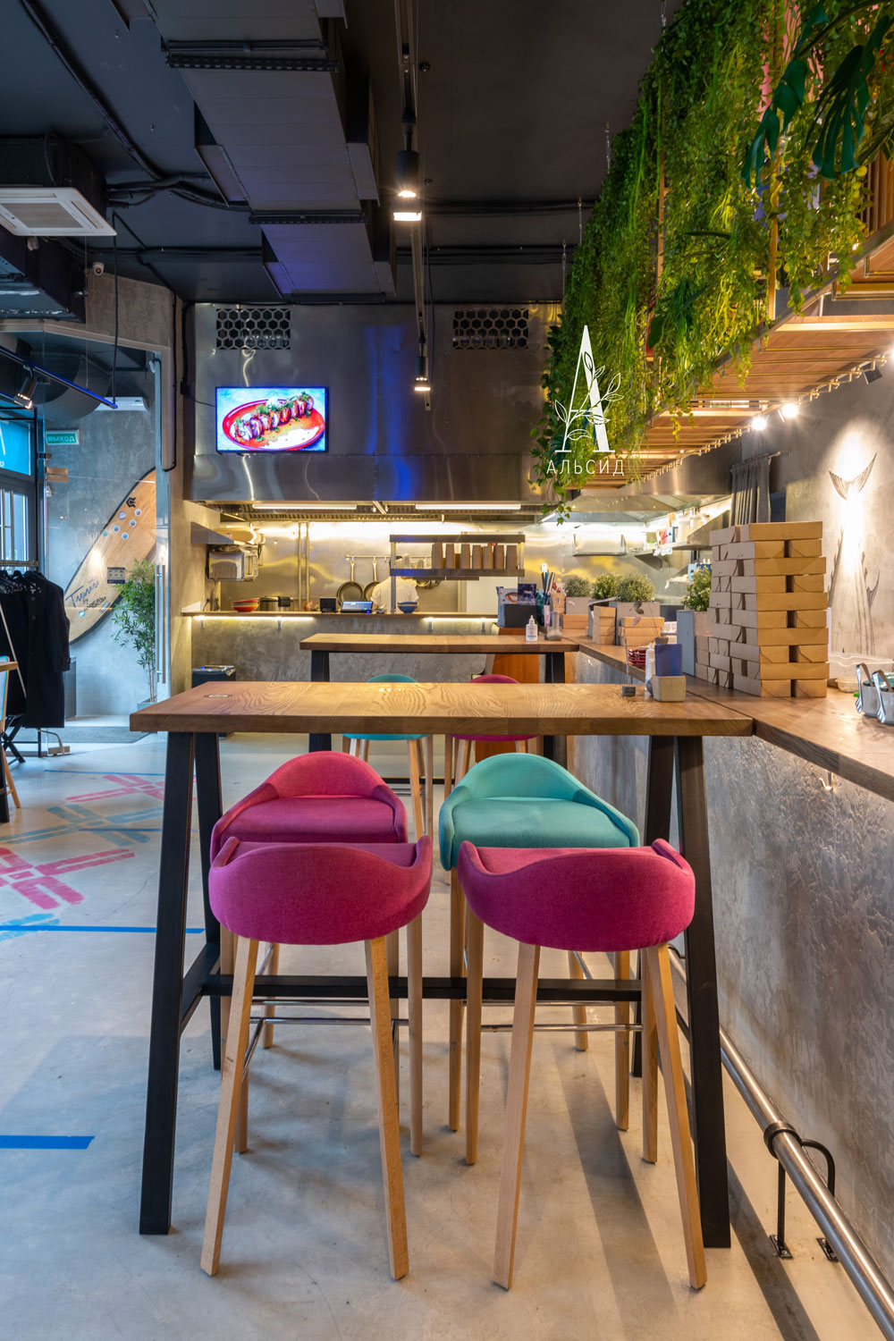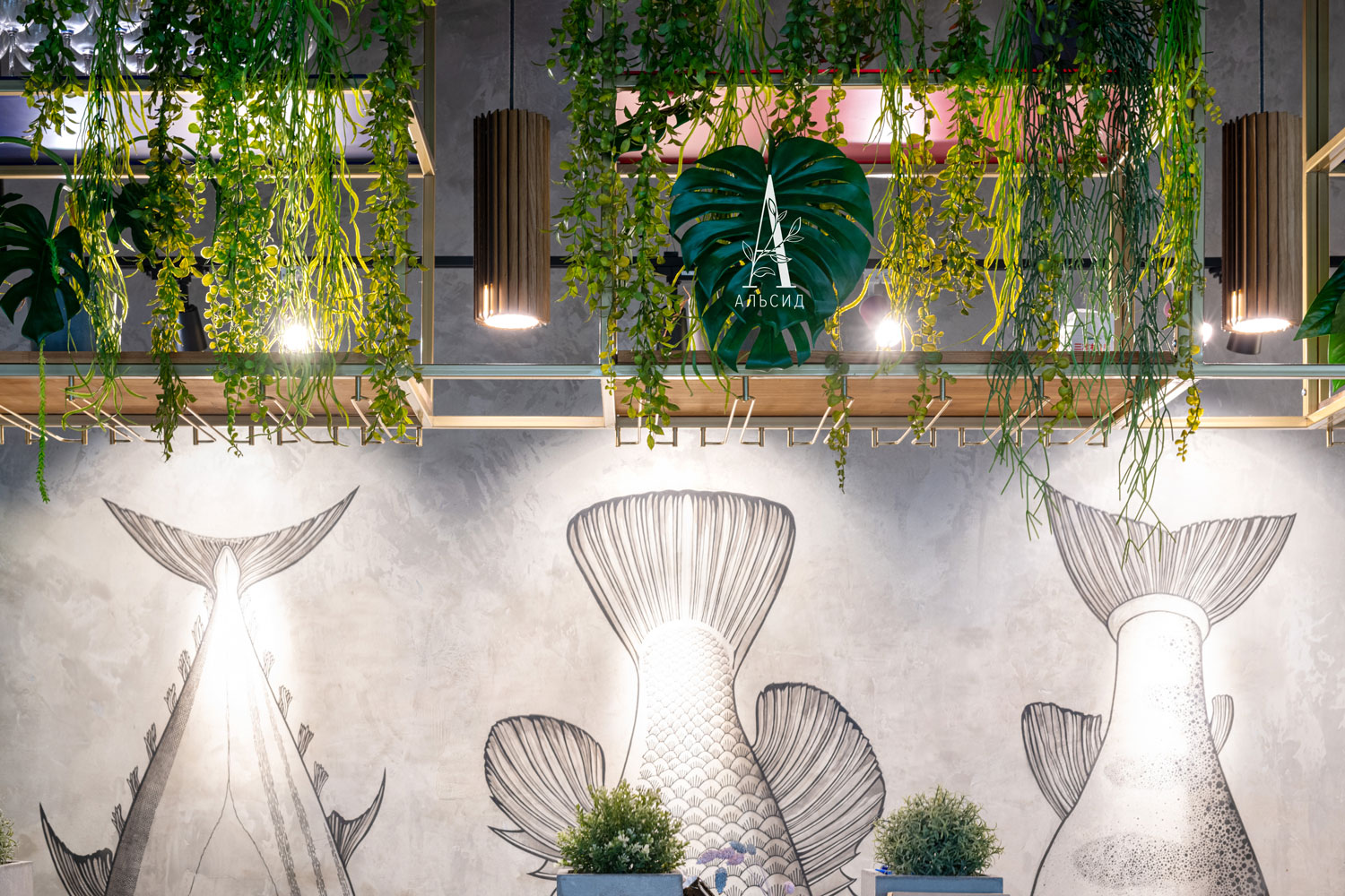 Сейчас уже сложно представить современный дизайн без растений. Благодаря своим свойствам и внешенему виду искусственные растения идеально подходят для коммерческих помещений. Грамотное заполнение пространства над барной стойкой композициями с ампельными растениями (нефролепис, трава, даксин, лиана) придают интерьеру свежесть и легкость. Расставляя акценты на разных уровнях, напольная банановая пальма поддерживает общую гармонию. ;