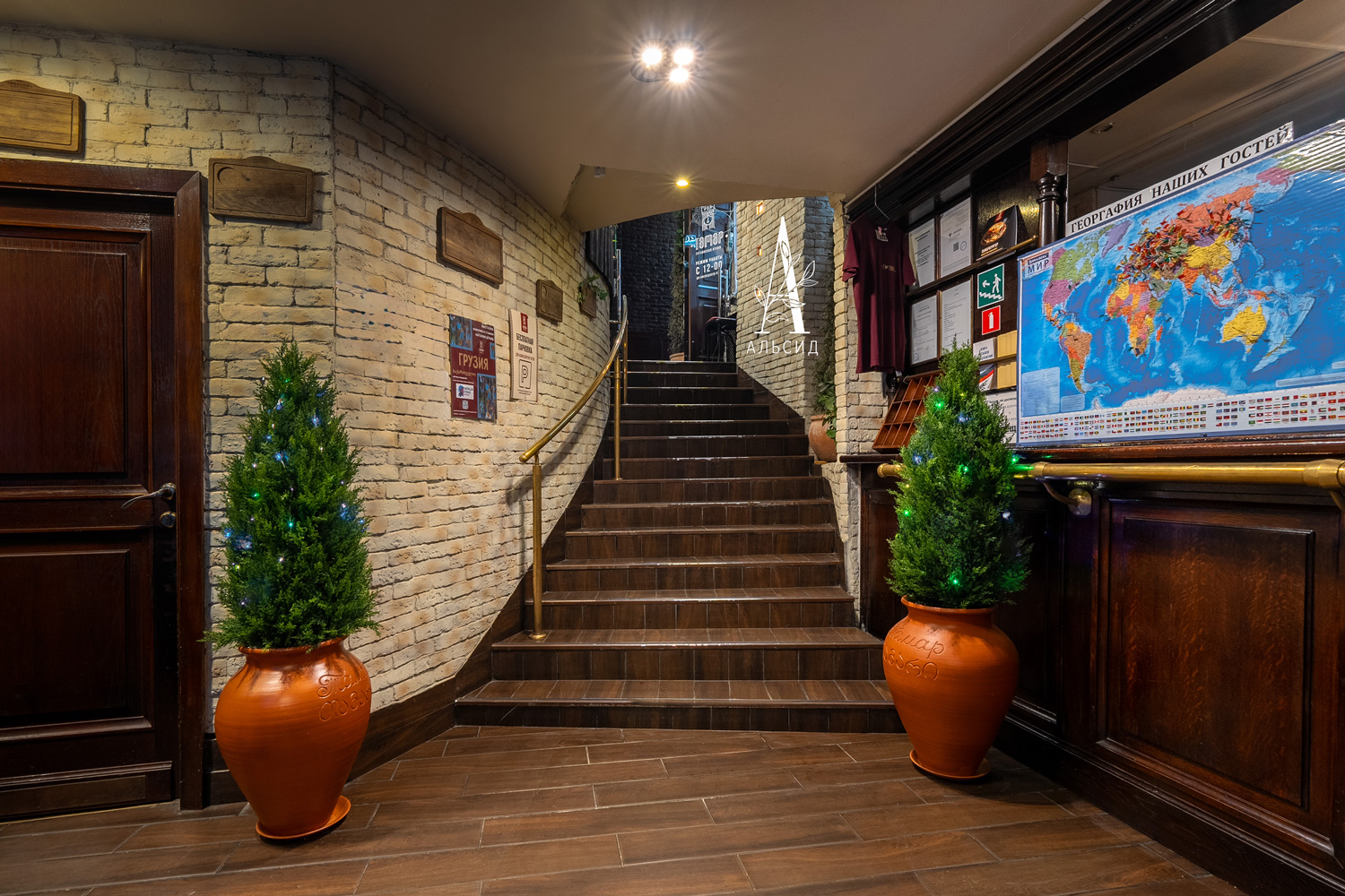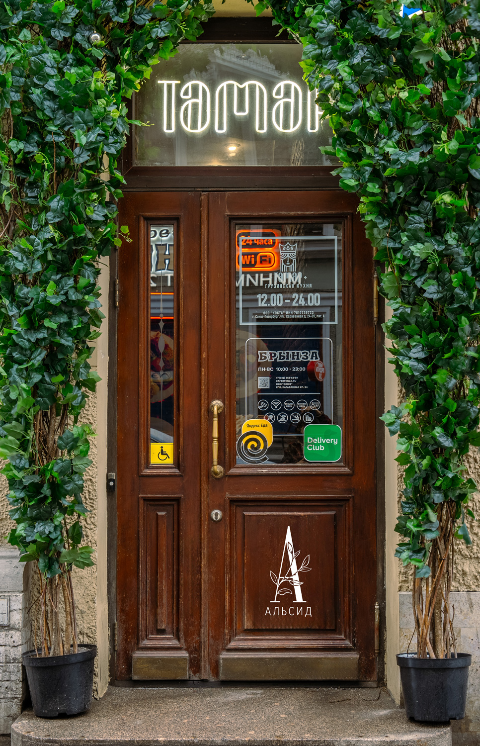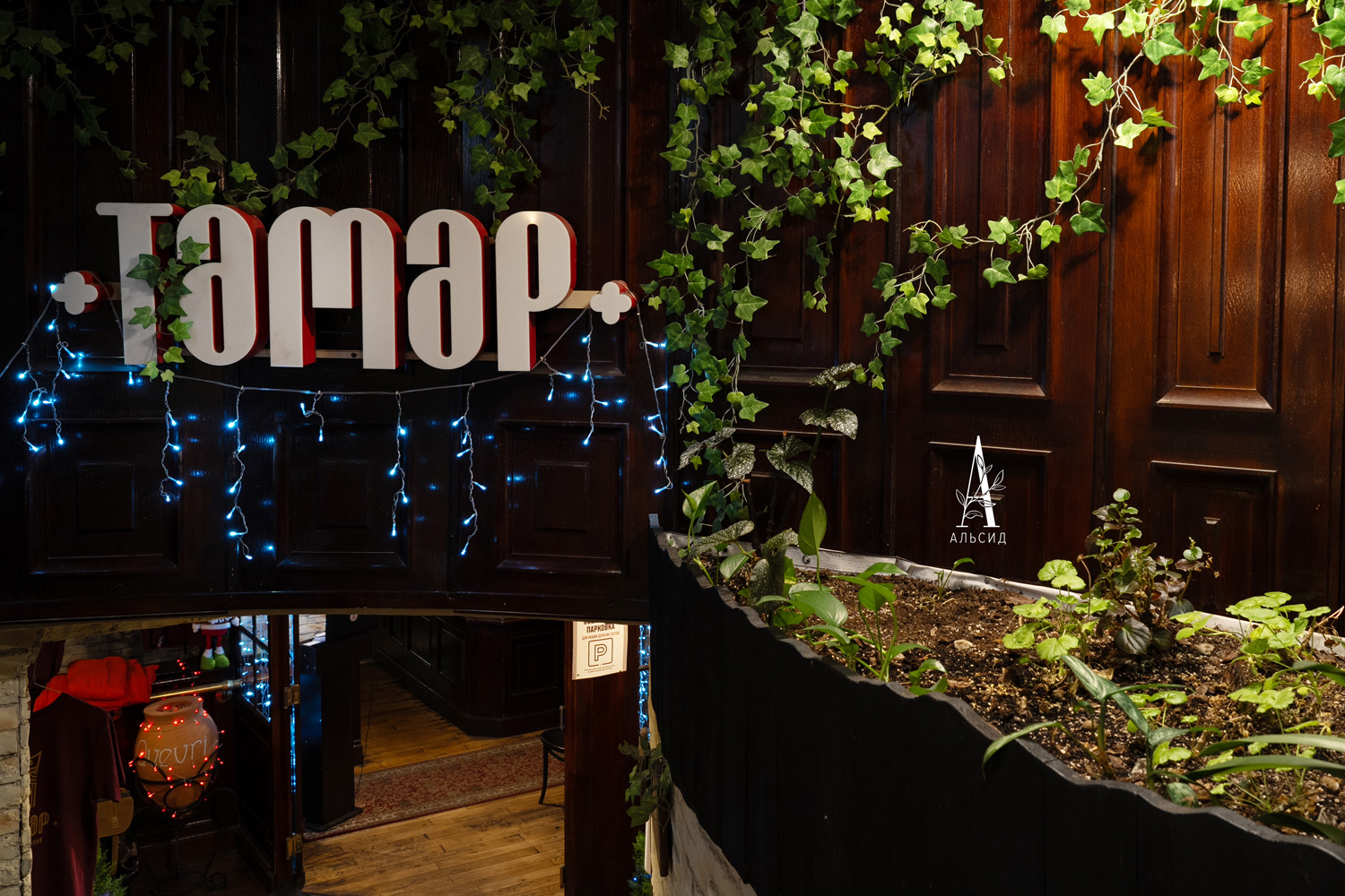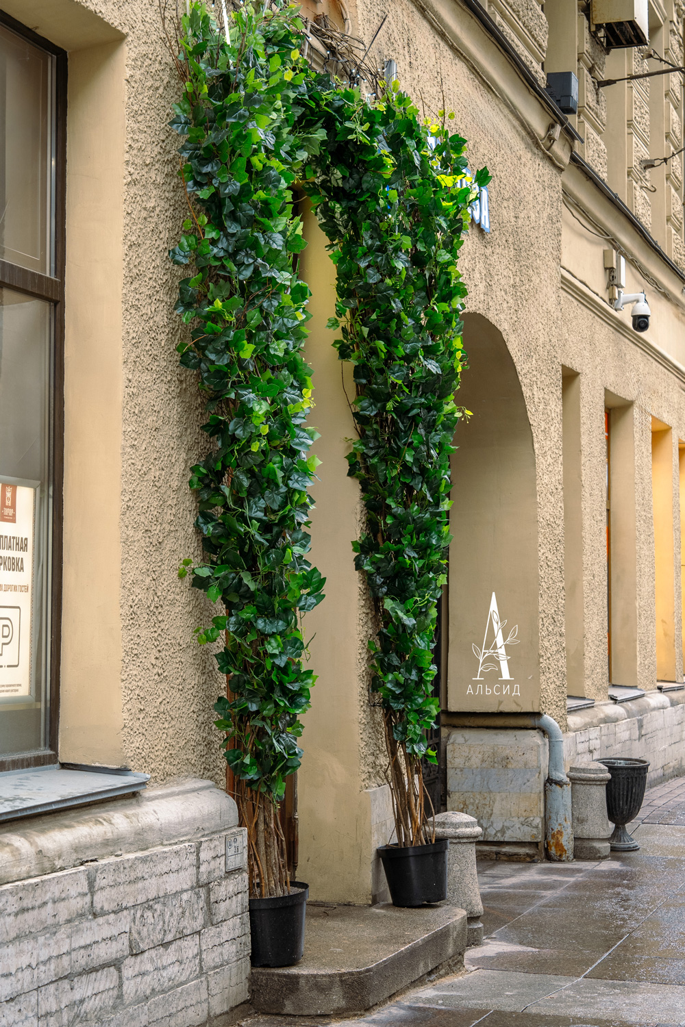 Арочное оформление входа становится все более популярным, т.к оно привлекает клиентов уже с улицы. Для создания арки были использованы разные плющи (КС78, КС74 и Хедера) как бесспорные символы виноделия. Внутри грузинского ресторана витает ощущение праздника - под светом гирлянд искусственные плющ и туи стоят вместе с живыми растениями, поэтому кажется все более натуральным и при этом сказочным.;