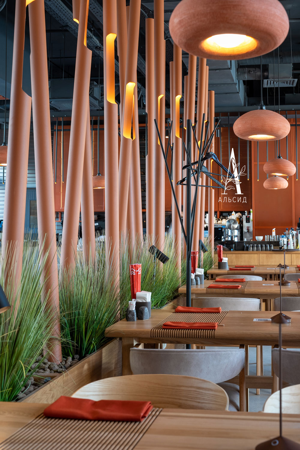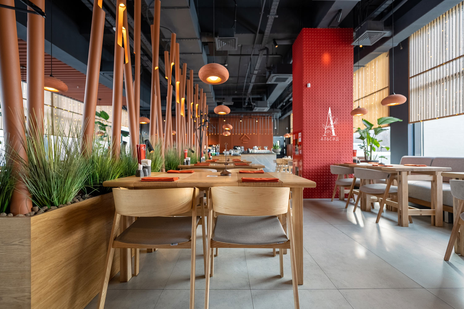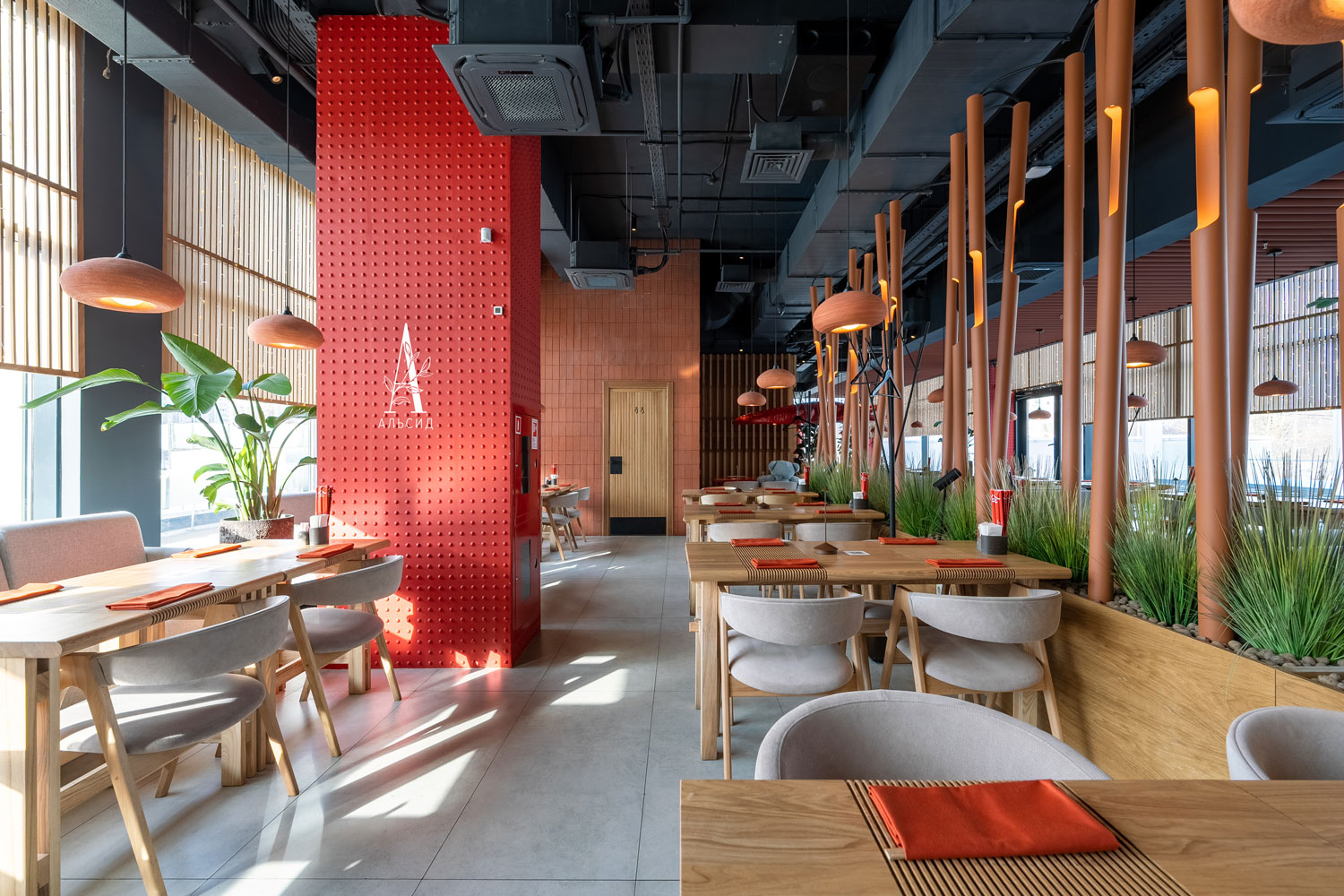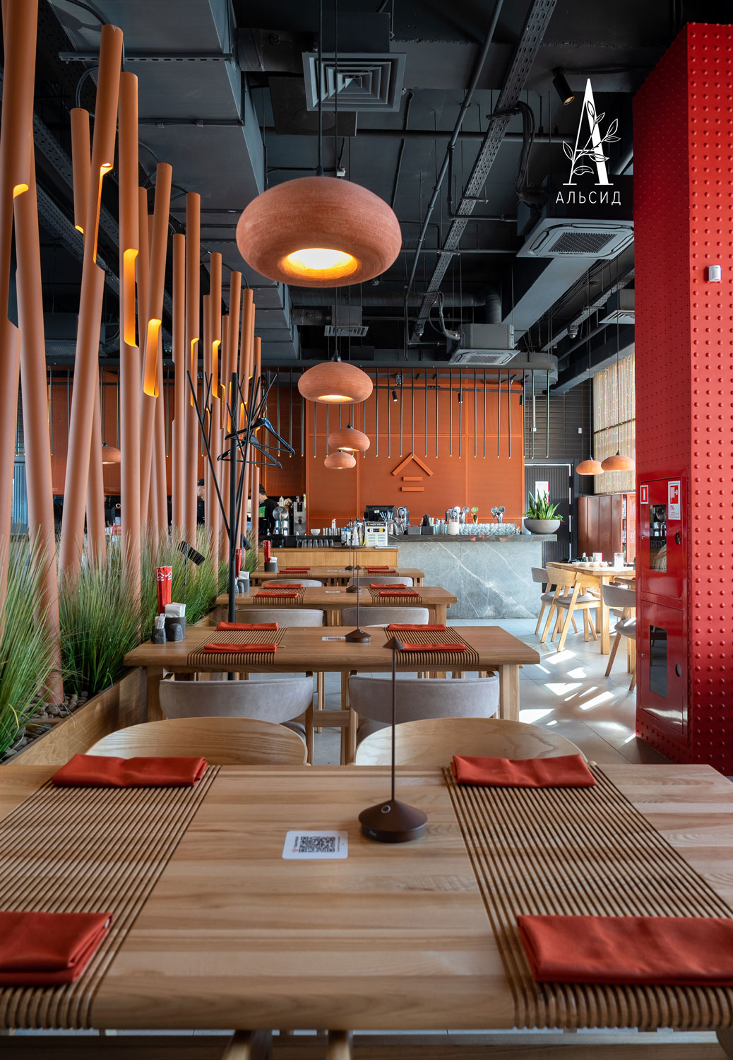 В азиатском ресторане Тануки зал поделен на 2 зоны, которые разделяют бамбуковые стебли и