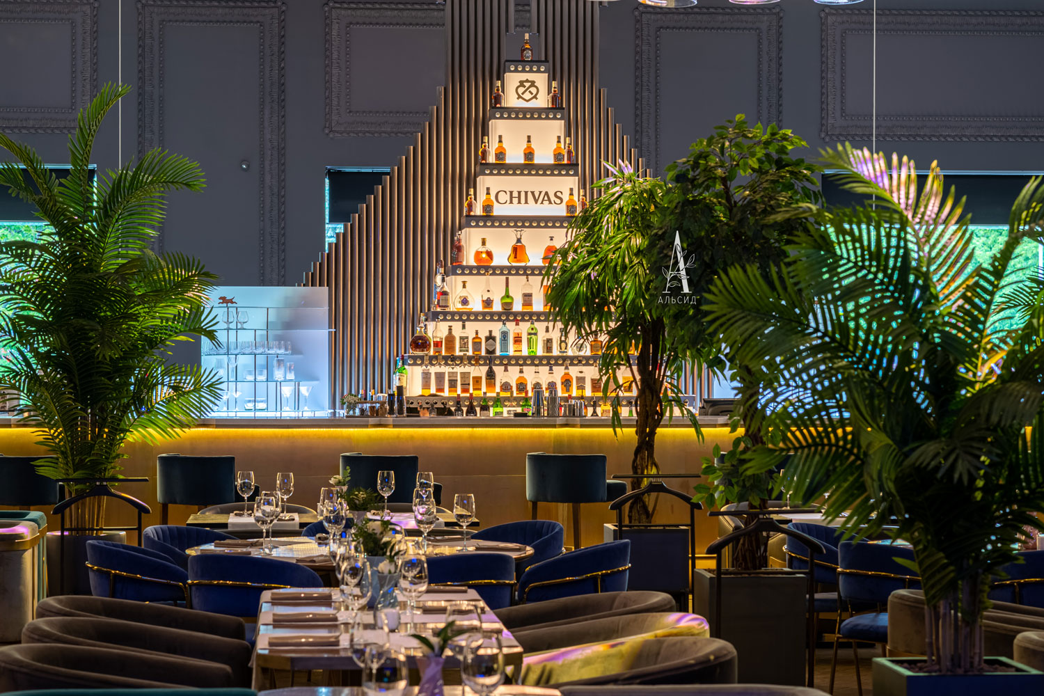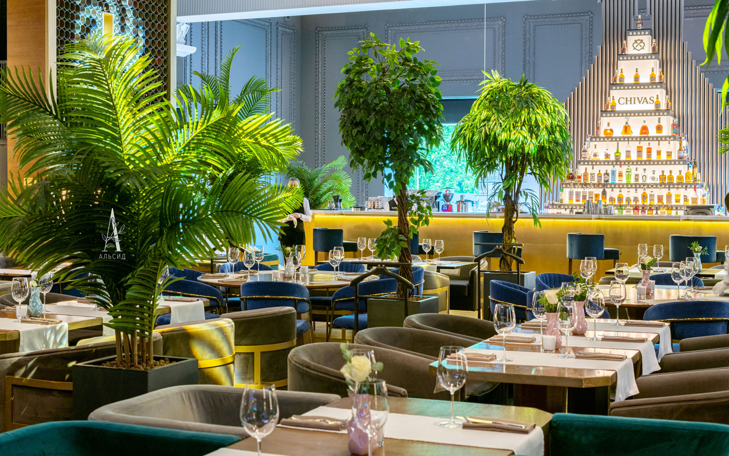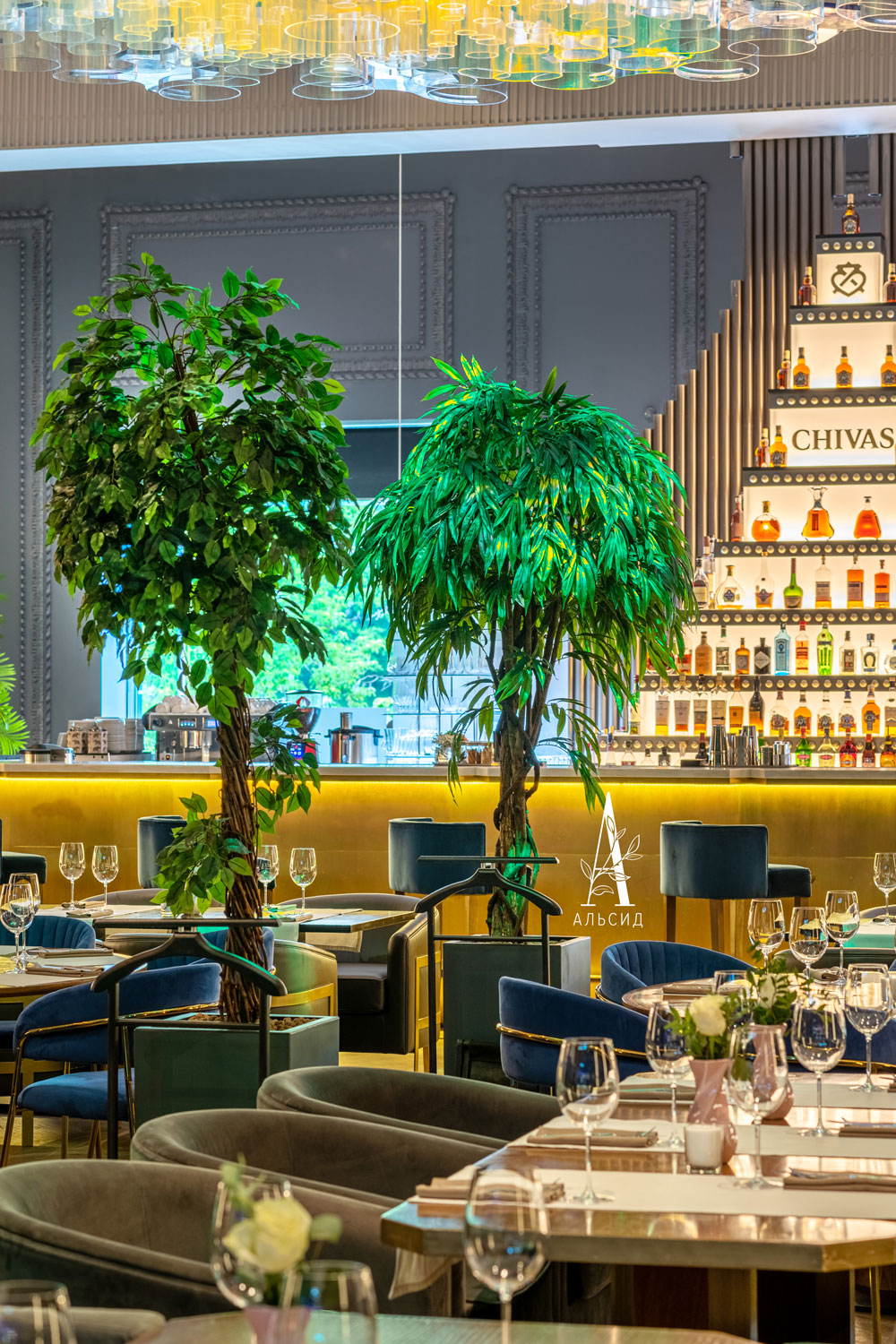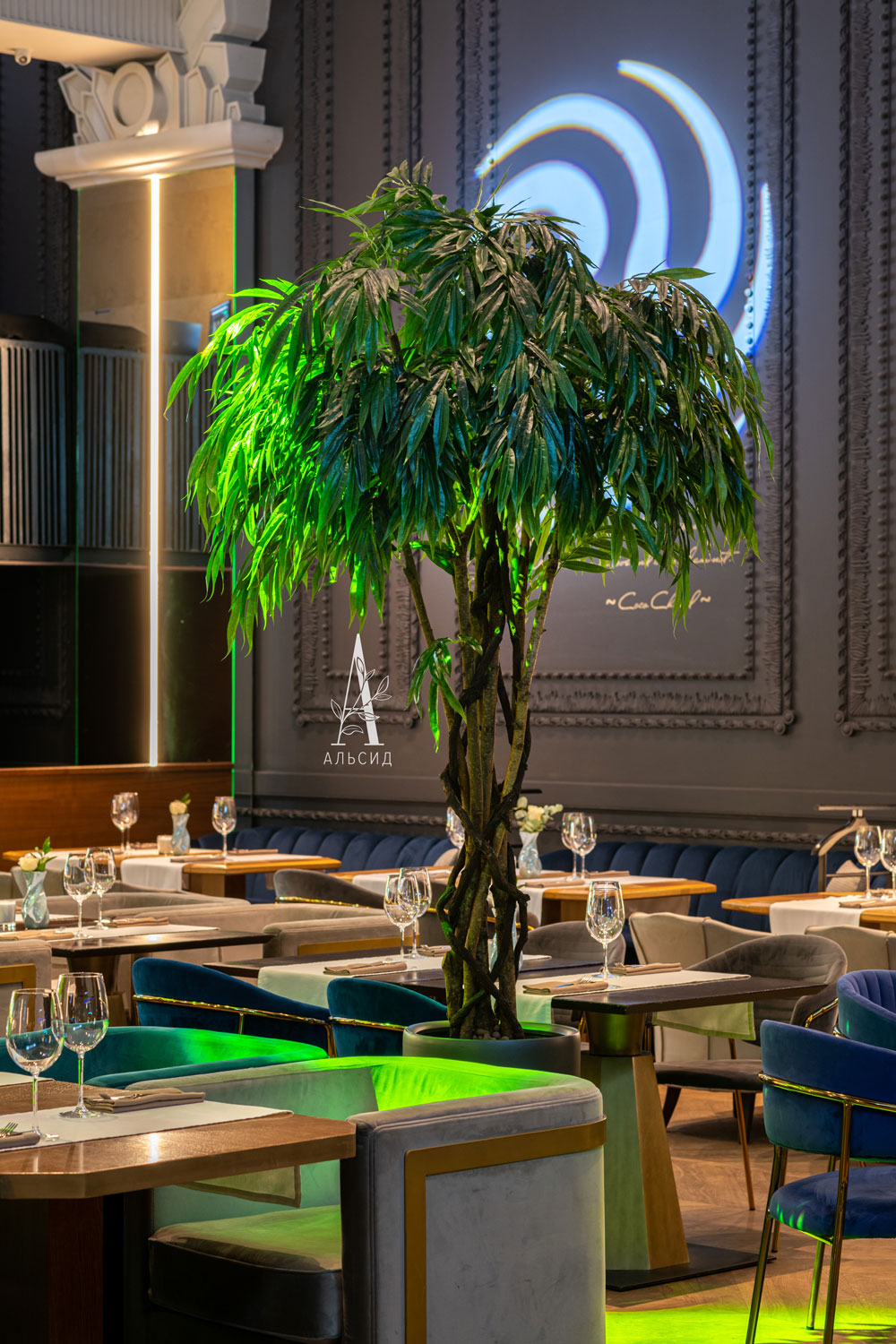 Проект известного ресторатора Александра Воробьева был достаточно требователен к оформлению, так как концепция включает в себя не только ресторан, но и клуб с концертной площадкой и VIP-зоной. Озеленение разноуровневыми деревьями должно было соответствовать заявленному премиум-классу, поэтому в интерьер отлично вписались лонгифолия и пальма. ;