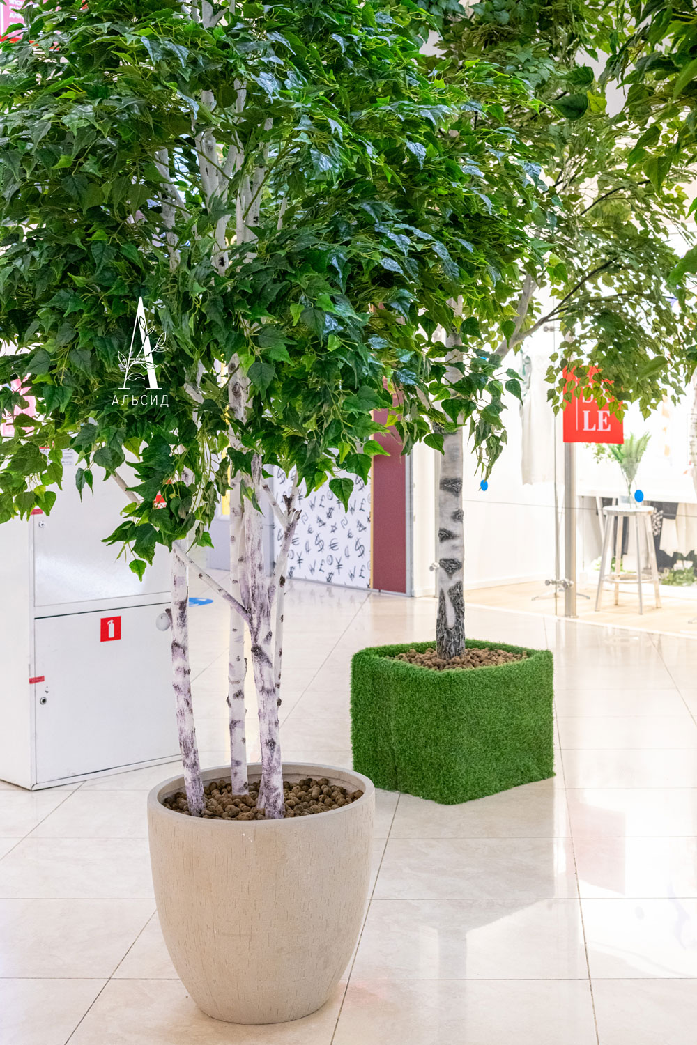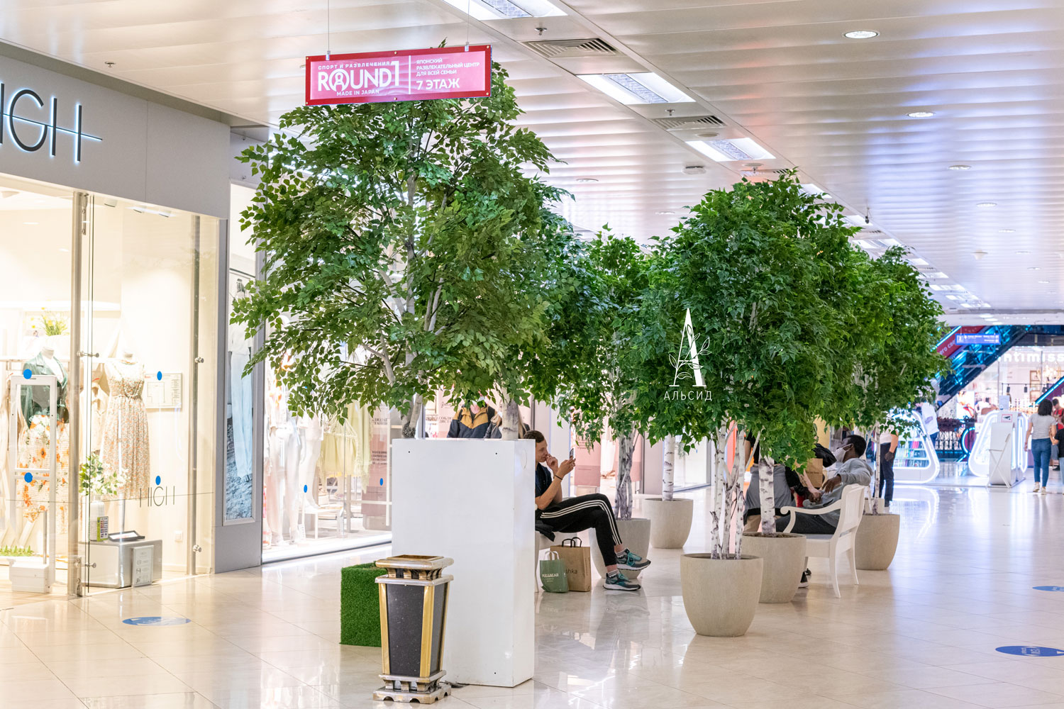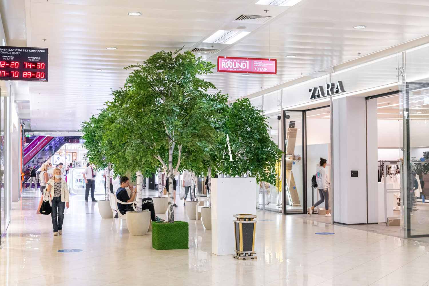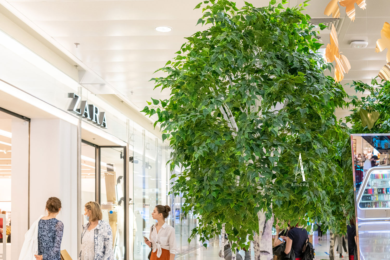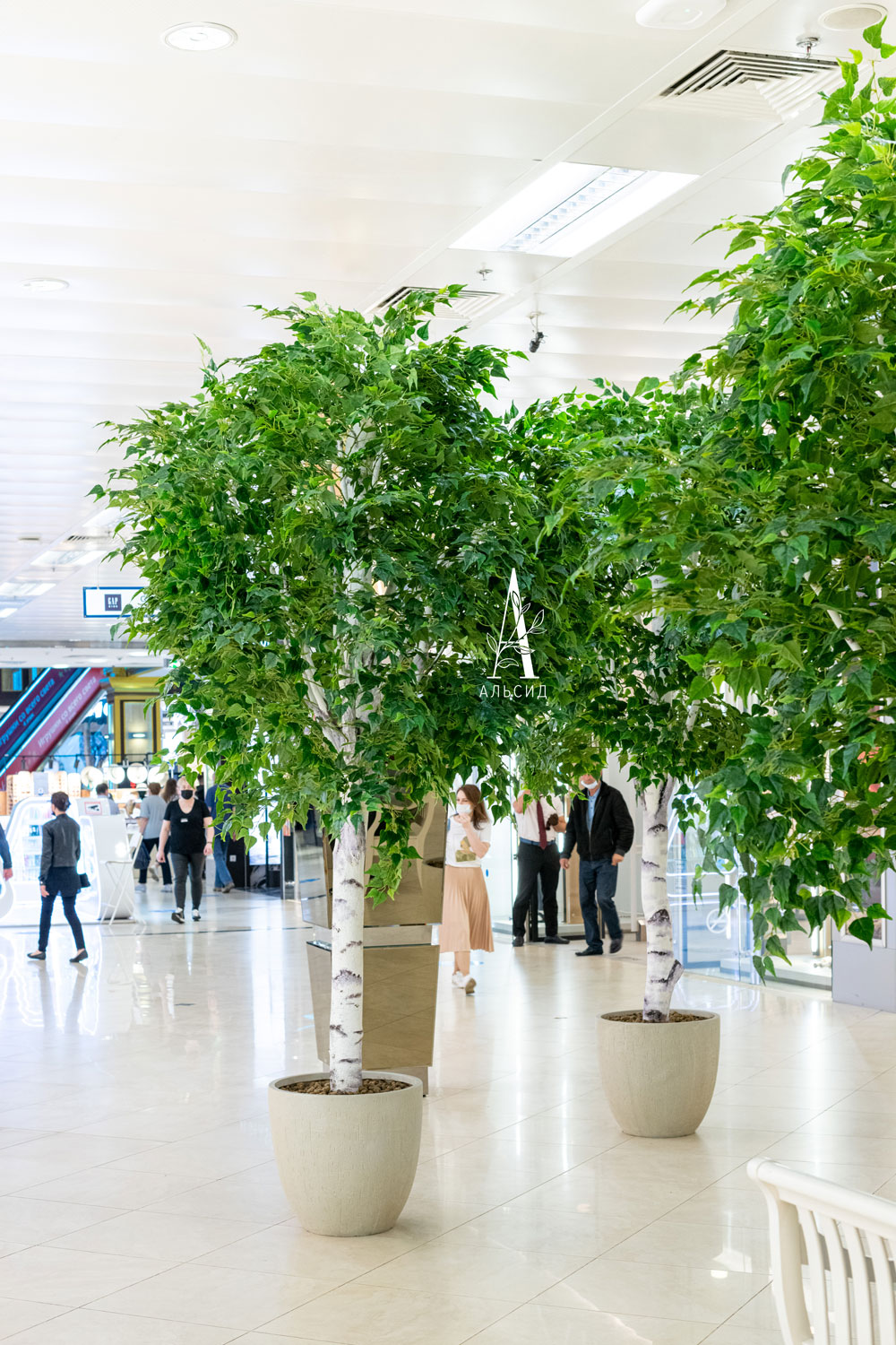 В центральном торговом комлексе Москвы большое пространство требует большого оформления. Поэтому зоны отдыха для посетителей украшены высокими раскидистыми деревьями, а именно березами (h=280 см и h=320 см) и остролистными кленами разных видов (зеленый и красный), под которыми приятно отдохнуть или подождать встречу. ;