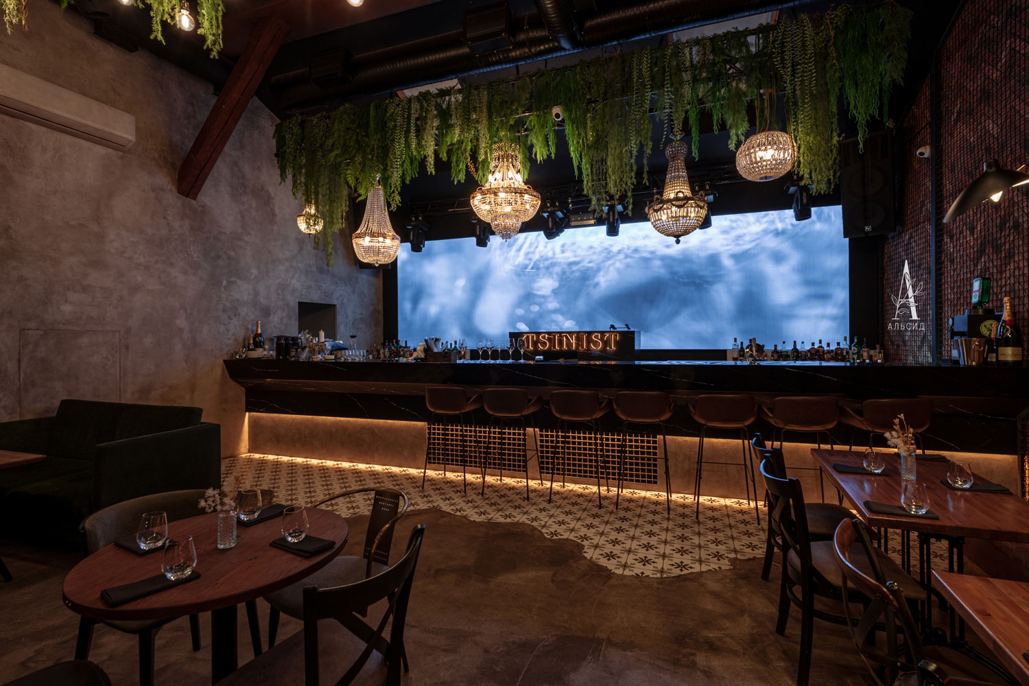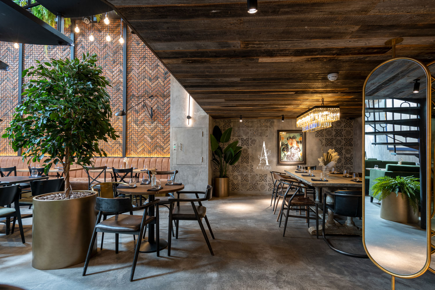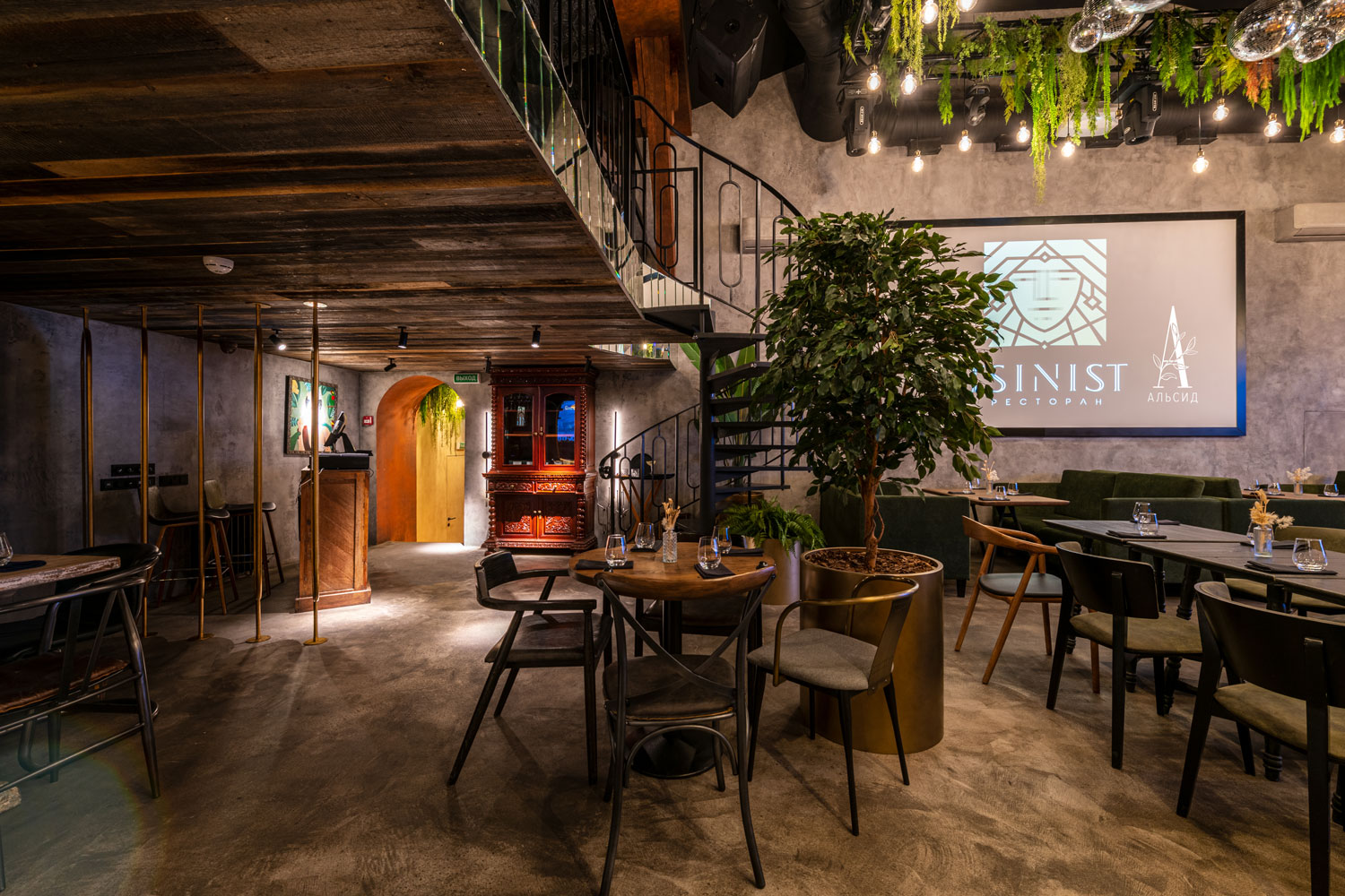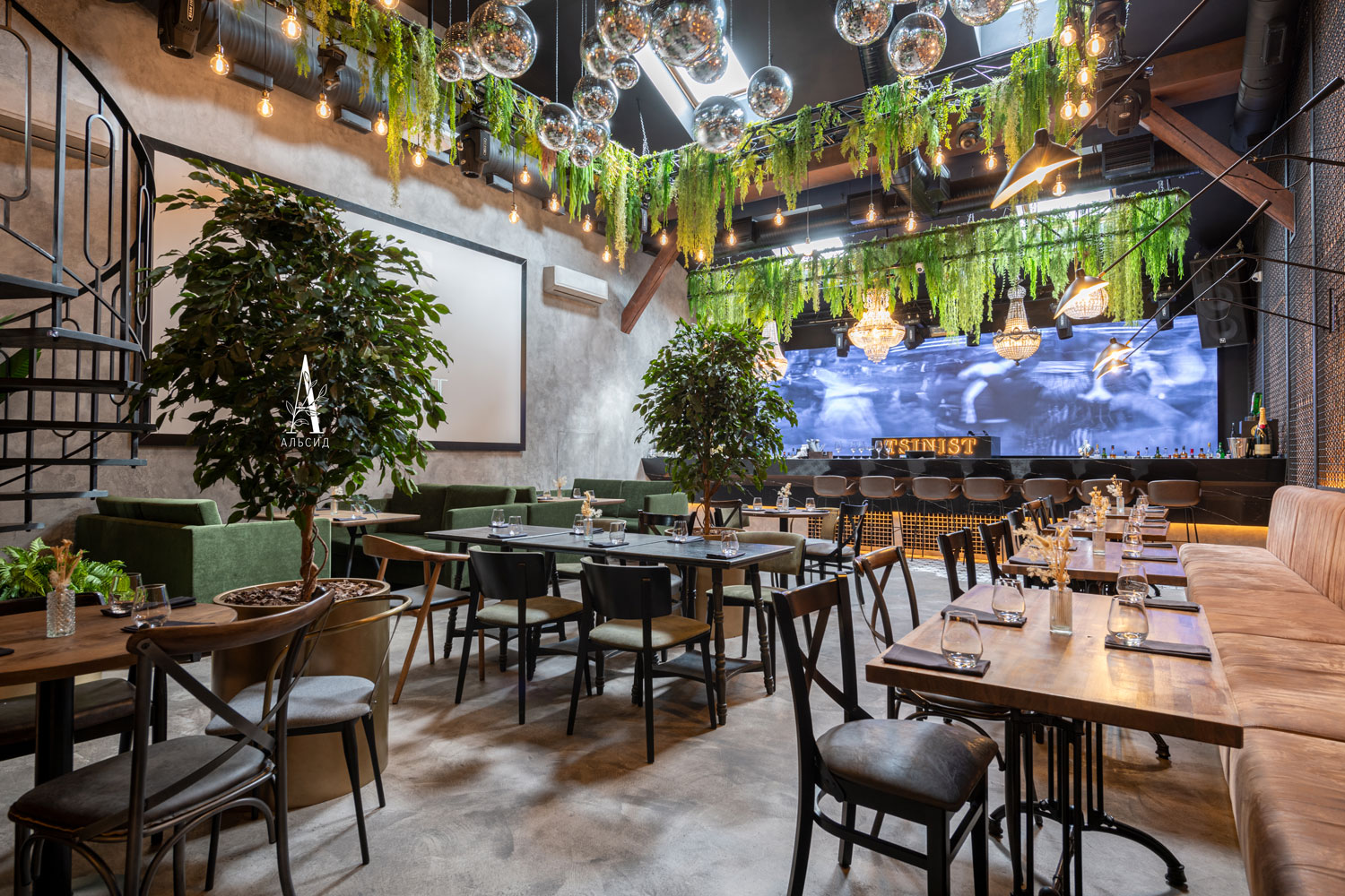 Для оформления двухуровнего лофта Tsinist были использованы элементы ар-деко и эклектики, в которые так хорошо вписываются искусственные растения разных размеров: банан (120см, 160см, 180см, 200см), пальма кустовая 180см, агава, монстера. Лианы с ампельными растениями обрамляют потолок. А в уборной установлен островок с раковиной с тропической композицией: пальма, каладиум, калатея, алоказия Полли. ;