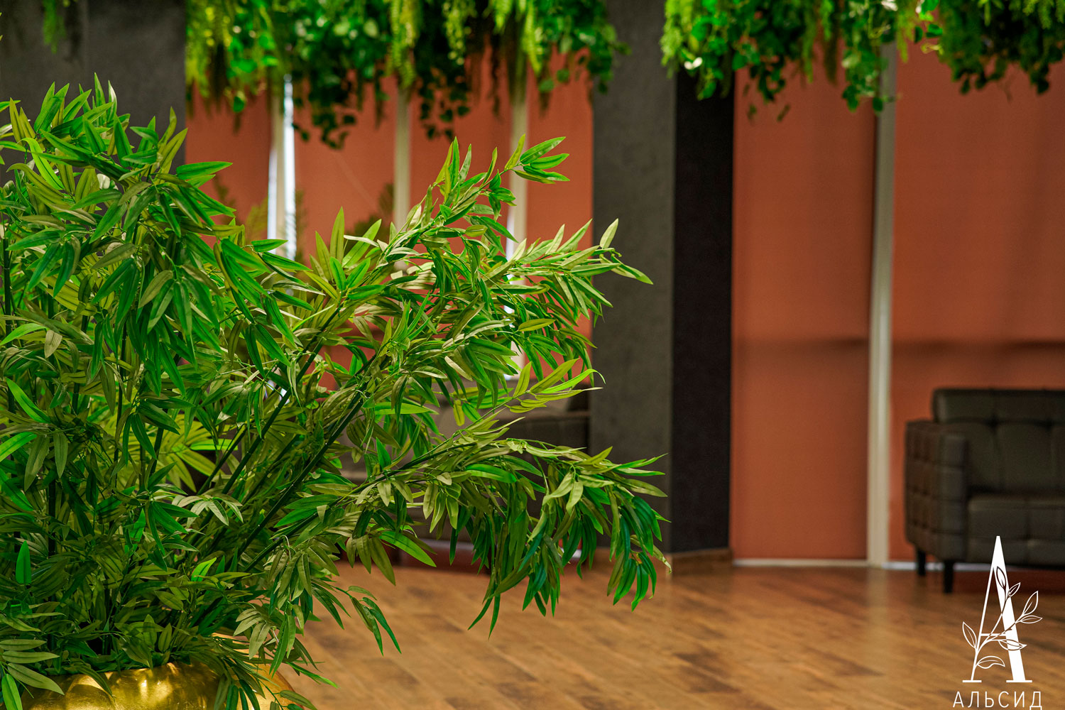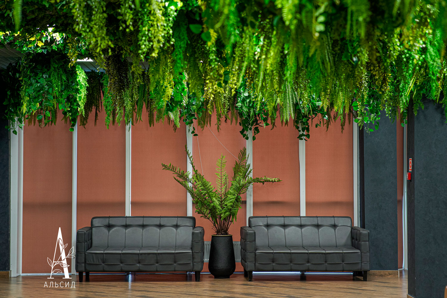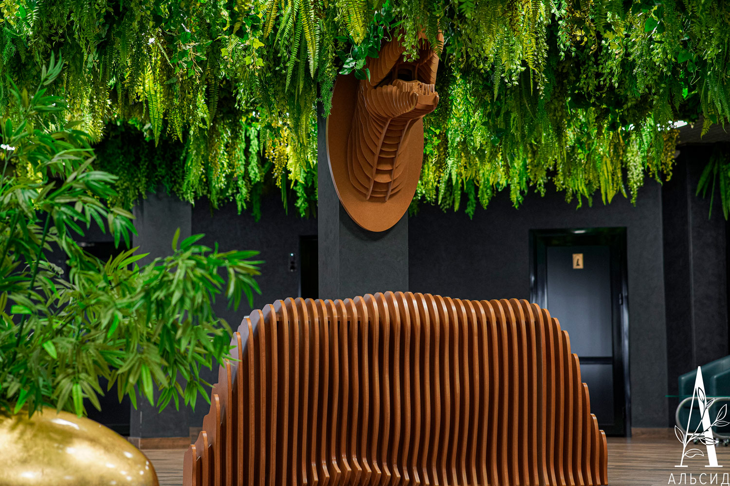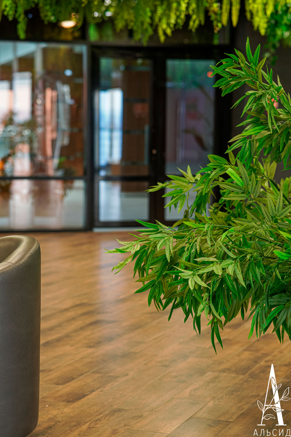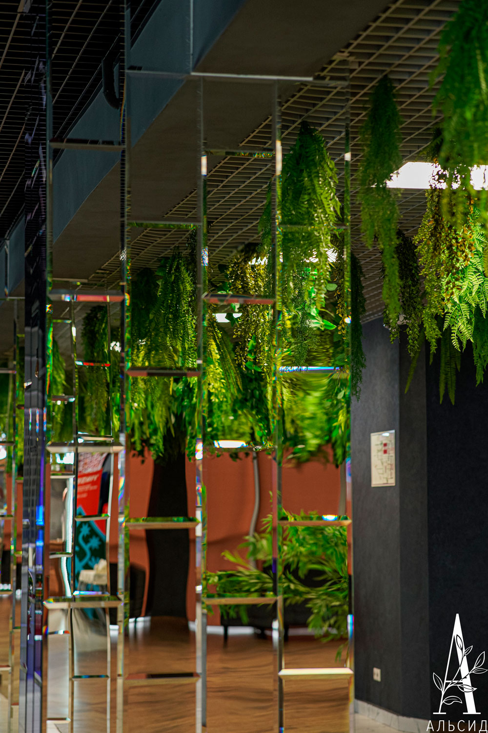 Фудкорт торгового центра на глазах преобразился благодаря тропической тематике озеленения. Потолок урашен лианами с ампельными растениями, а между кресел расположен невероятно яркий куст стрелиции.;