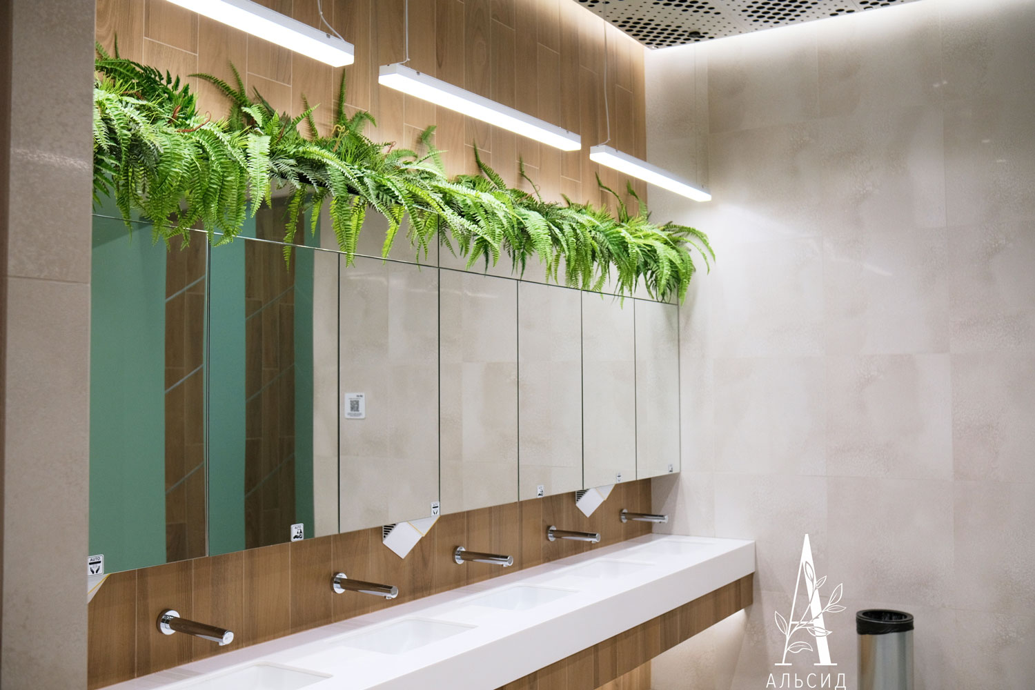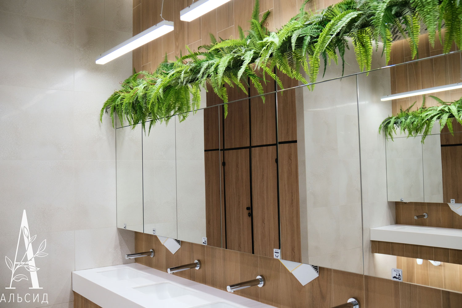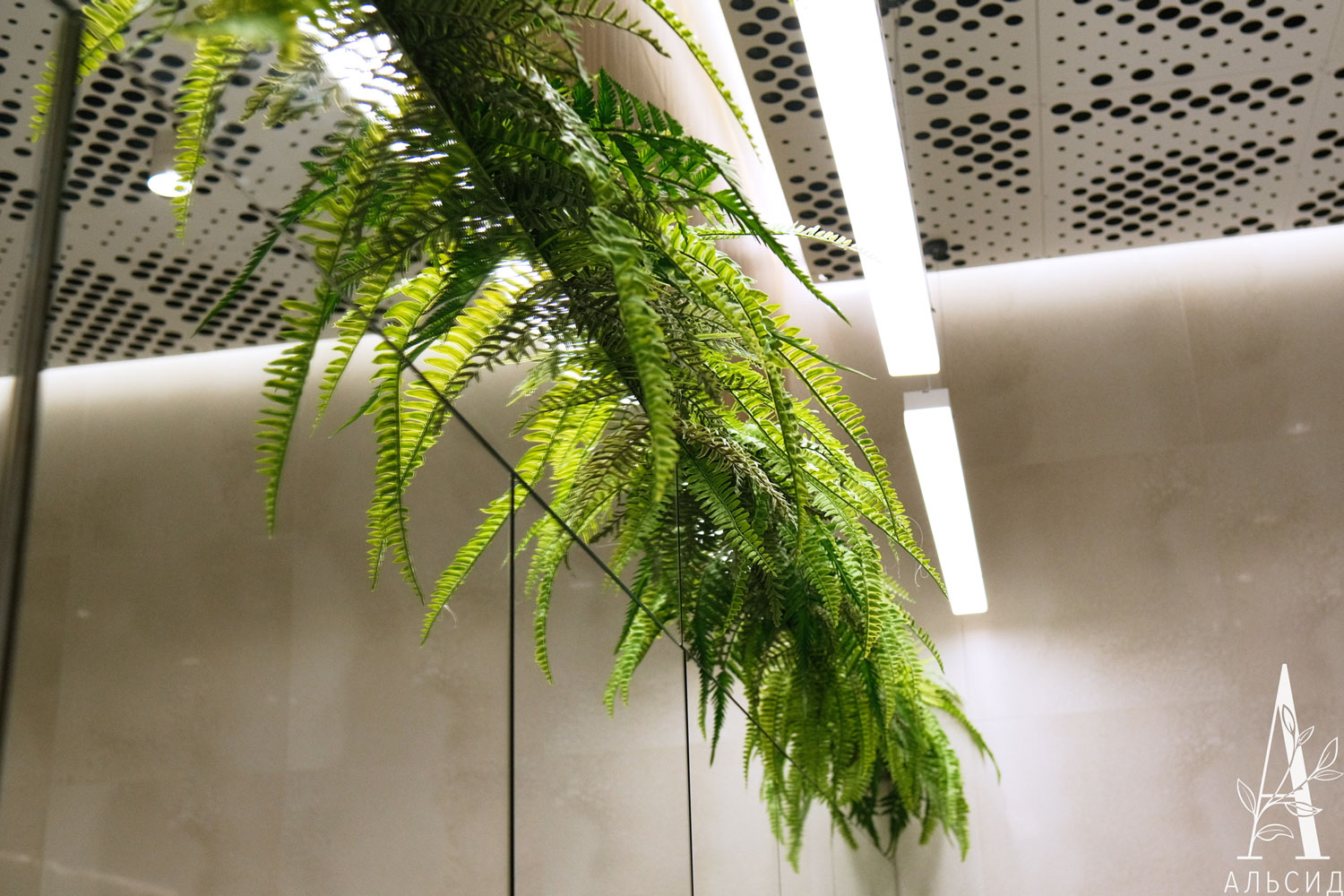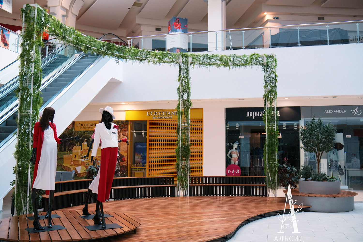 Для оформления арки в торговом центре Гранд Хаус были использованы самшит даксин ампелный и аспарагус ампельный. Уборные украшены папоротником в кокосовом боксе, а рядом со входом расположилась фитостена. Также по всему торговому комплексу расставлены такие растения в кашпо как оливковое дерево, агава гигант и олива искусственная.;